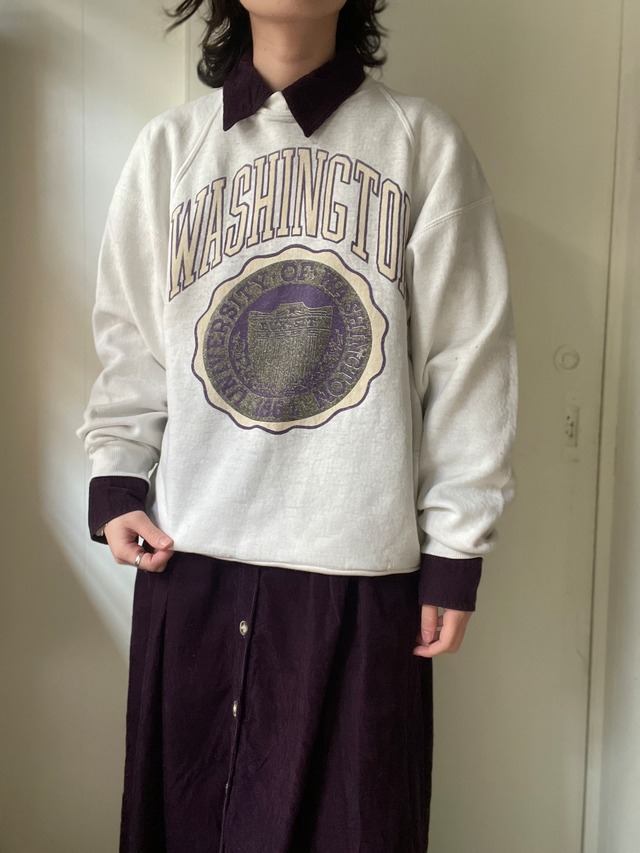 color white、purple 80年代頃のJERZEESボディのカレッジスウェット 色味、フォント、プリント全てが絶妙なバランスで可愛い1枚 全体的にいわゆるボロと言った、ダメージの多いスウェットです ですがたくさん着られてくたくたになった感じが、このスウェットの良さを引き出している気がします◎ 古物好きな方におすすめのスウェットです size(平置きで採寸) 着丈 59cm 身幅 54cm 裄丈 83.5cm (表記サイズ L) 着用staff 151cm ⚠︎若干の誤差が生じる場合がございますのでご了承お願いします。 material polyester 50% cotton 50% condition 左肩後ろ、左袖に破れや小穴あり 前身頃、前裾、両袖、背中に汚れあり 全体的に生地が薄く首周りはやや透け感あり ATTENTION 当店で取り扱う商品は全てused、vintage商品です。 感じ方には個人差があるかと思いますが、目立つもの以外は記載しておりません。小さな汚れやダメージ、使用感などは古着の特性としてご理解お願いします。 記載内容をお読み頂き、新品とは異なるvintage,used商品であることをご理解いただいた上でご注文ください。 古着特有の匂いがある商品がございますのでご了承下さい。 実際の商品のお色味が出るように撮影しておりますが、撮影環境やお客様のモニターの設定により色味の誤差が生じる場合がございますので予めご了承お願い致します。 複数点お買い上げ頂いたお客様は同梱発送とさせて頂きます。 ⚠︎ 複数点ご購入の際にはカートをまとめてお手続きを宜しくお願い致します。 一度確定したお手続きの内容の変更は不可となります。カートが分かれた場合、それぞれに送料・手数料がかかる場合がございます。ご注意ください。 お支払い内容の詳細につきましてはご注文確定後にメールにて詳細を送らせて頂きます。 ⚠︎ ご注文完了後のキャンセルは不可とさせて頂いております。またお客様のご都合による返品や交換につきましてもお受けする事ができません。 ご不明点がございましたらお気軽にお問い合わせをお願い致します。