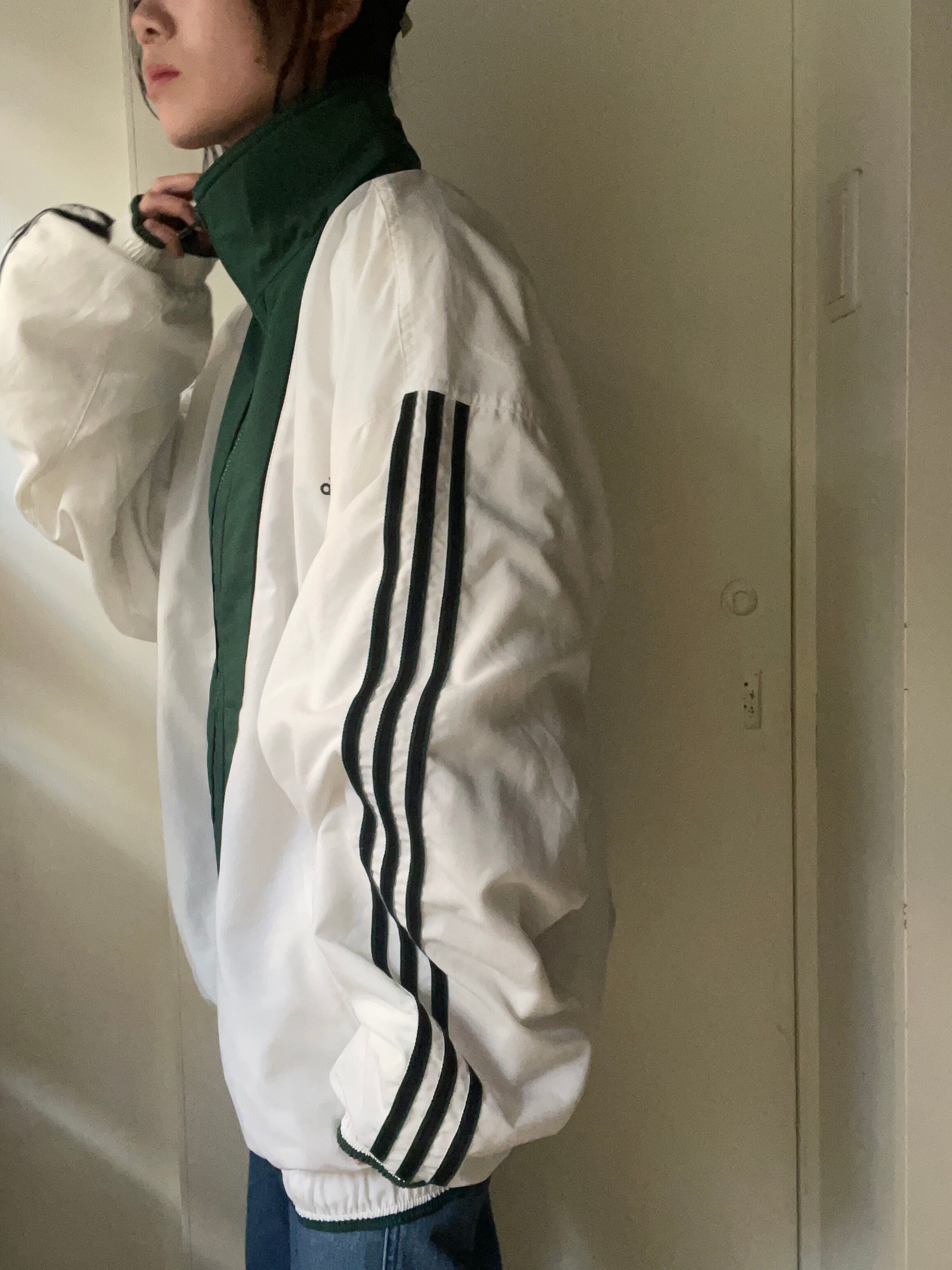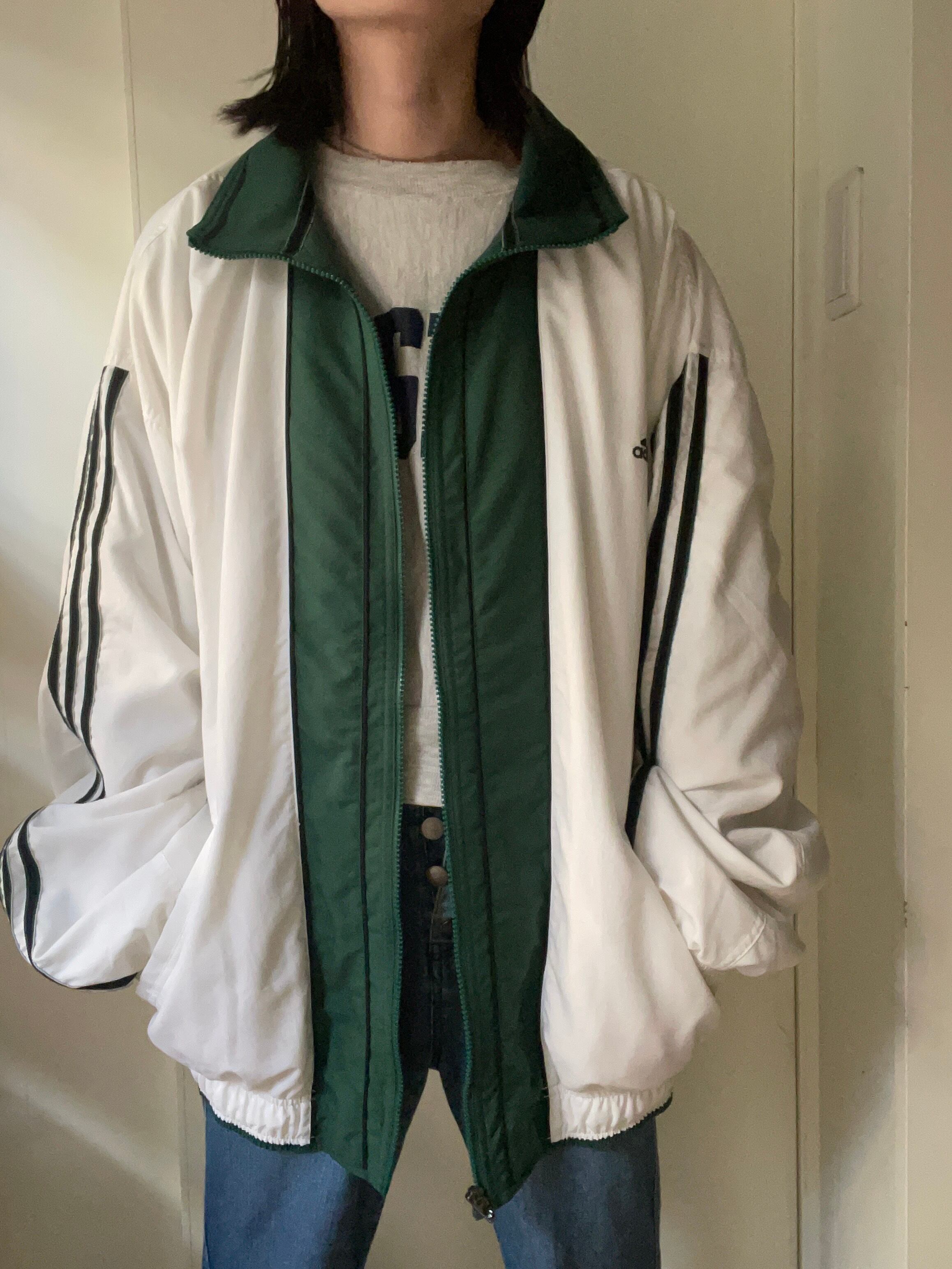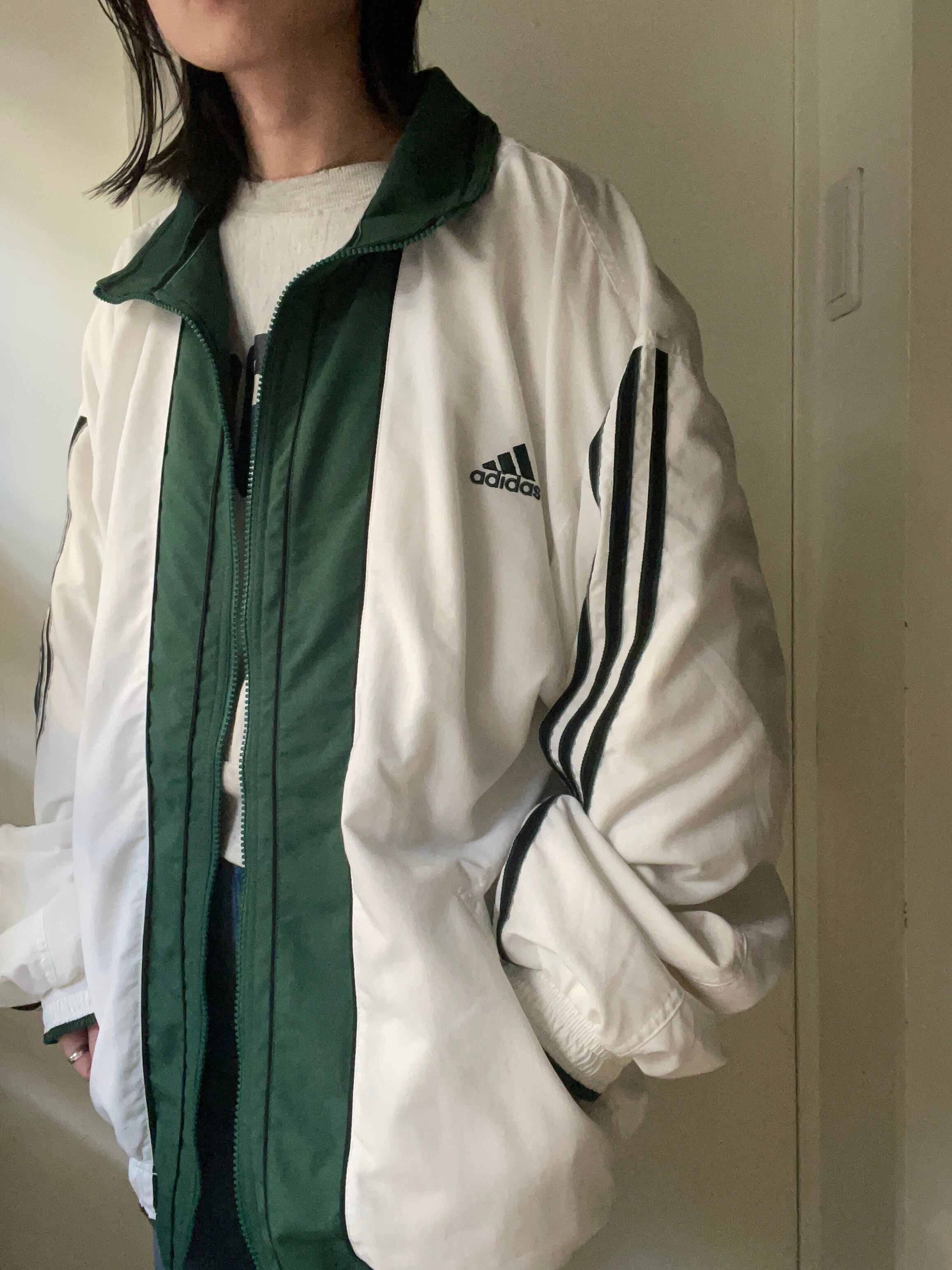 ホワイトとグリーンの配色や、前後に入った太めのラインなどがシンプルながらも被らないデザインの1枚です