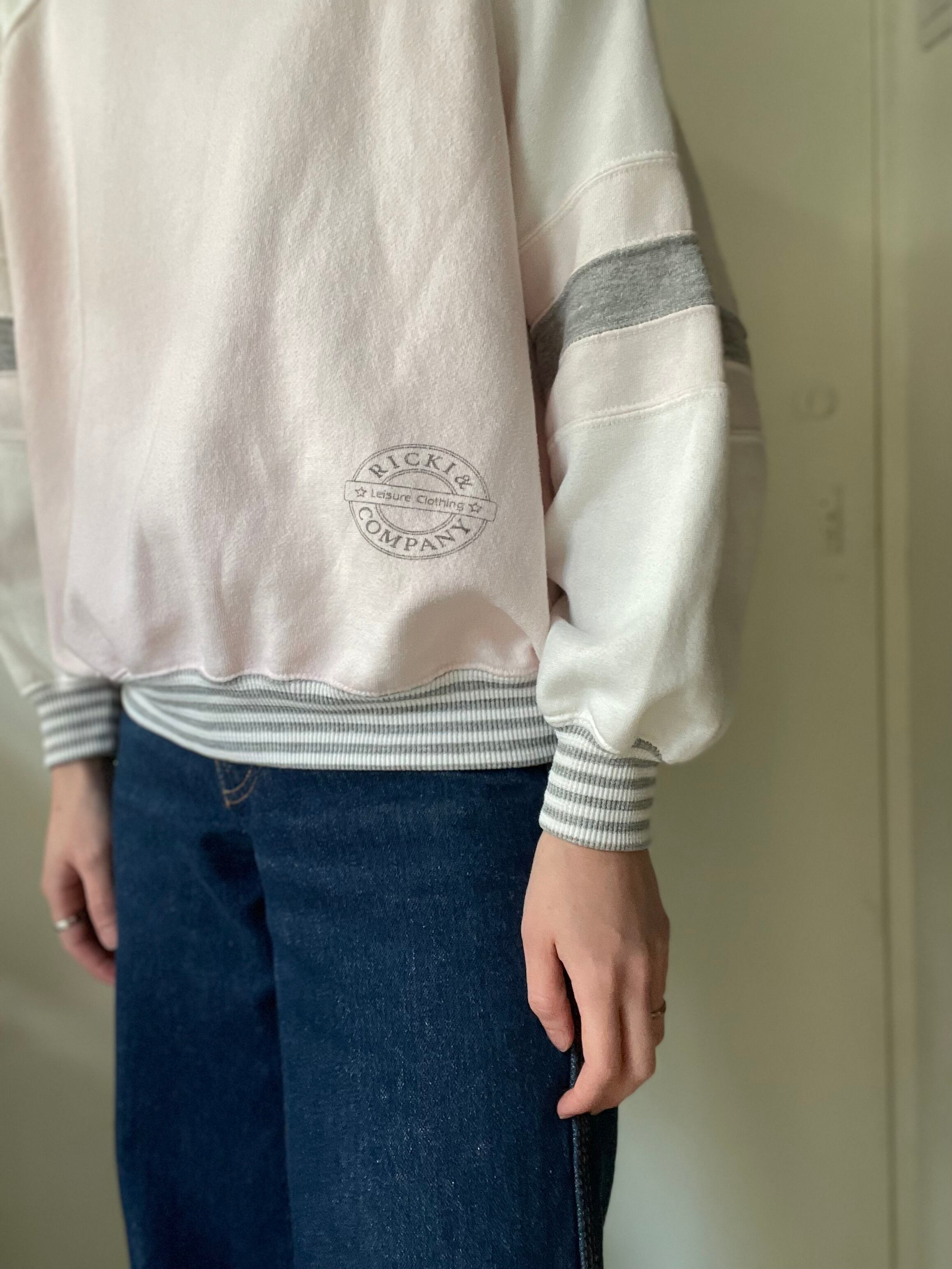 淡いベビーピンクにリブボーダー、ラグランスリーブの丸っこいシルエット、、、と可愛いがぎゅっと詰め込まれたスウェット