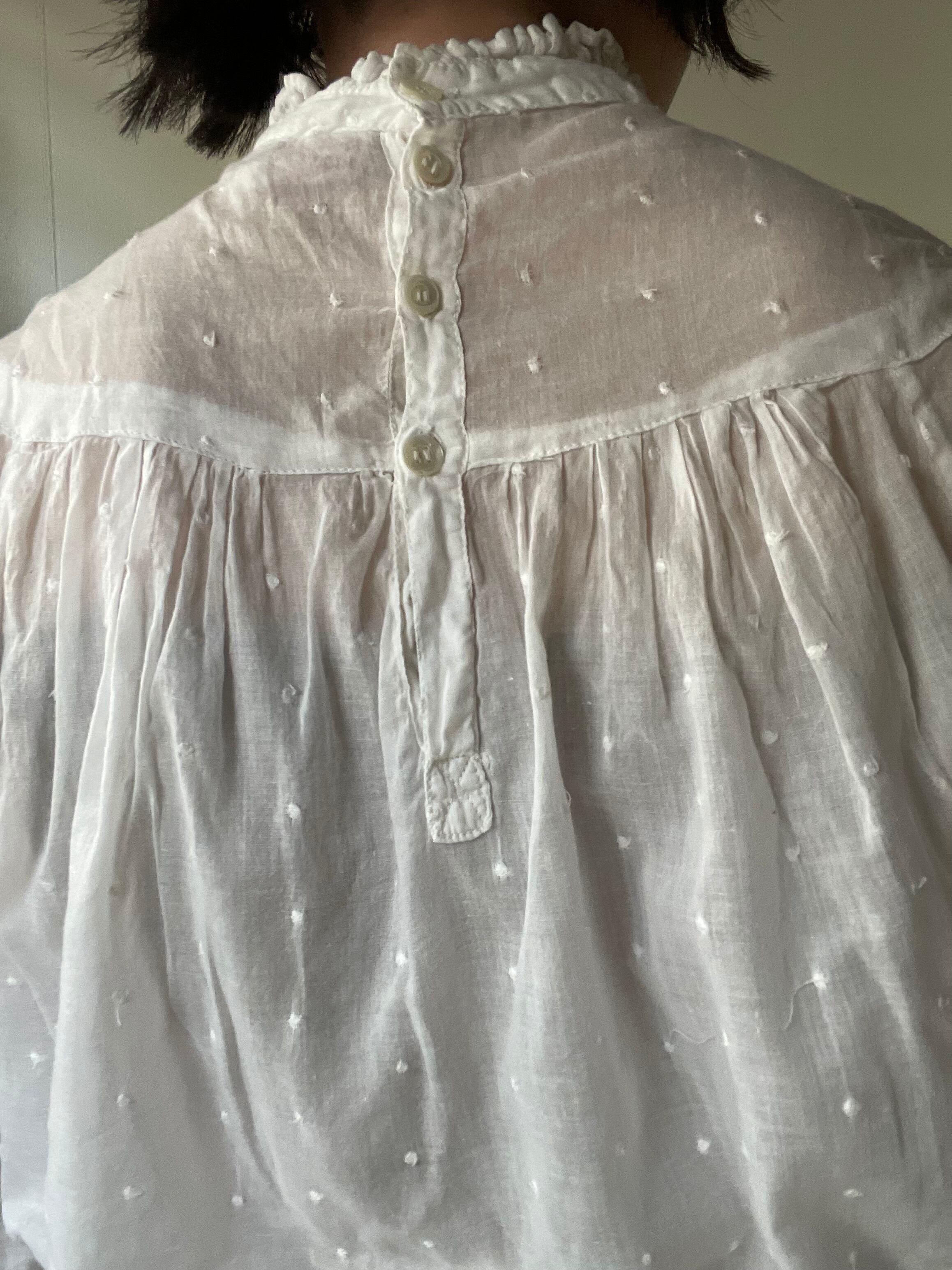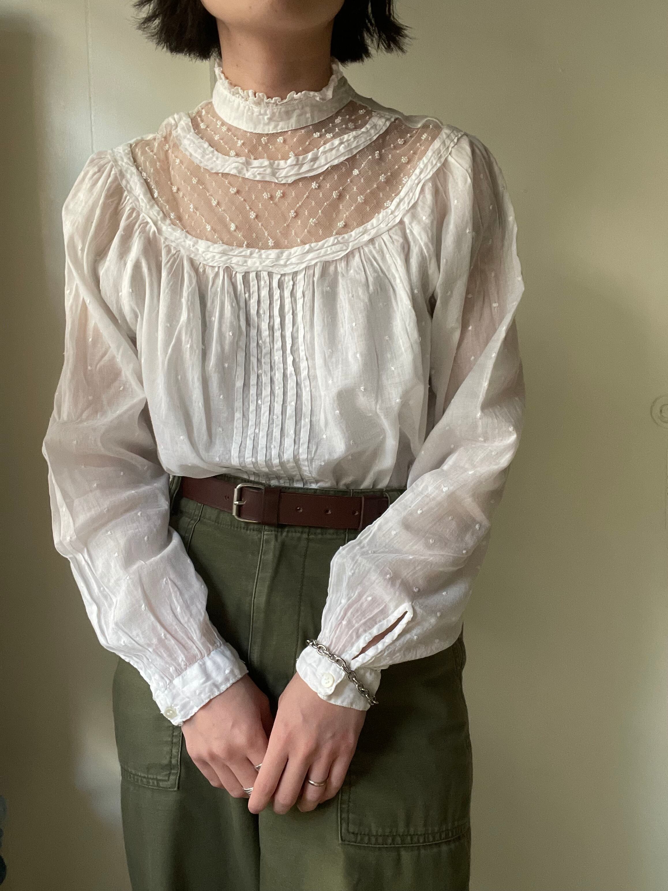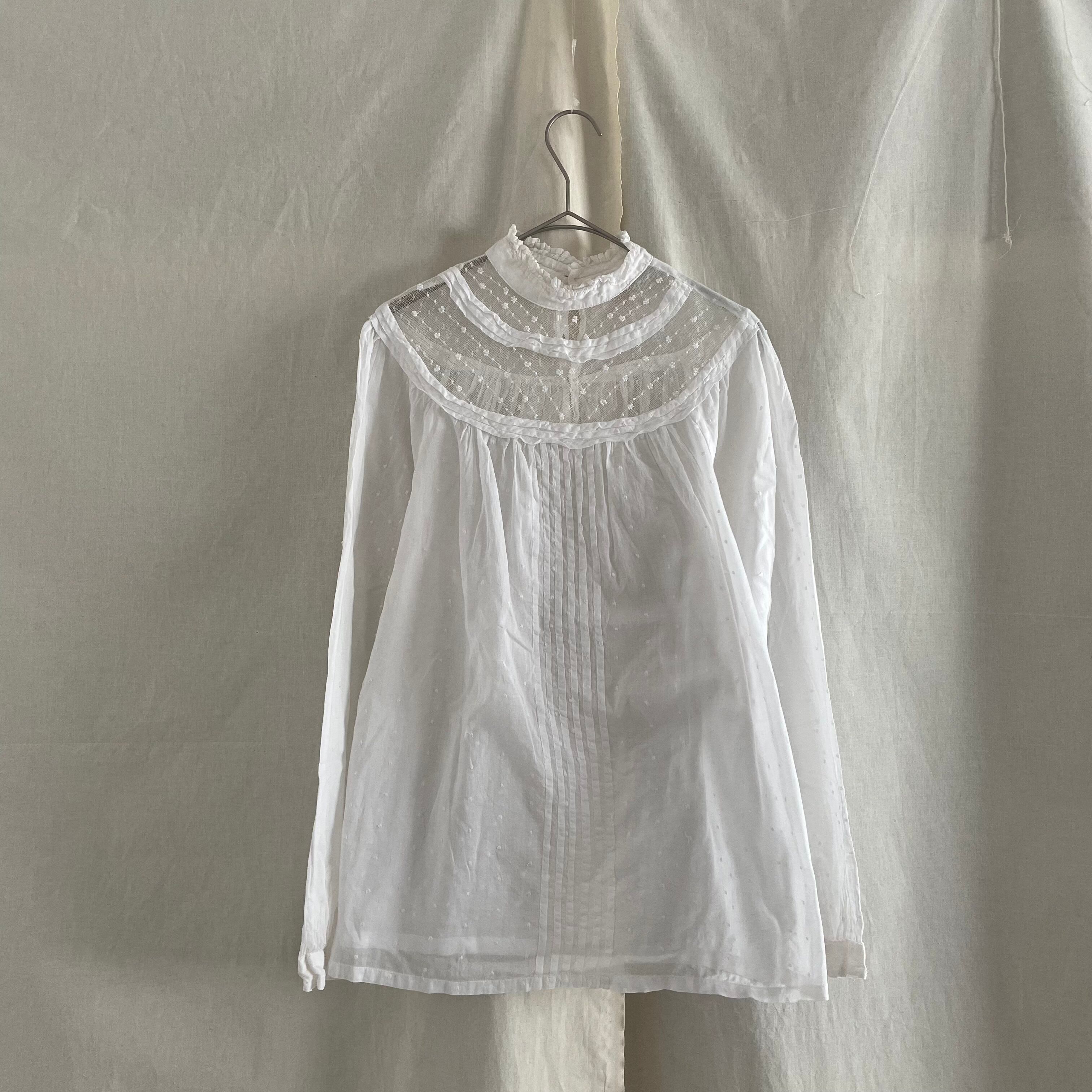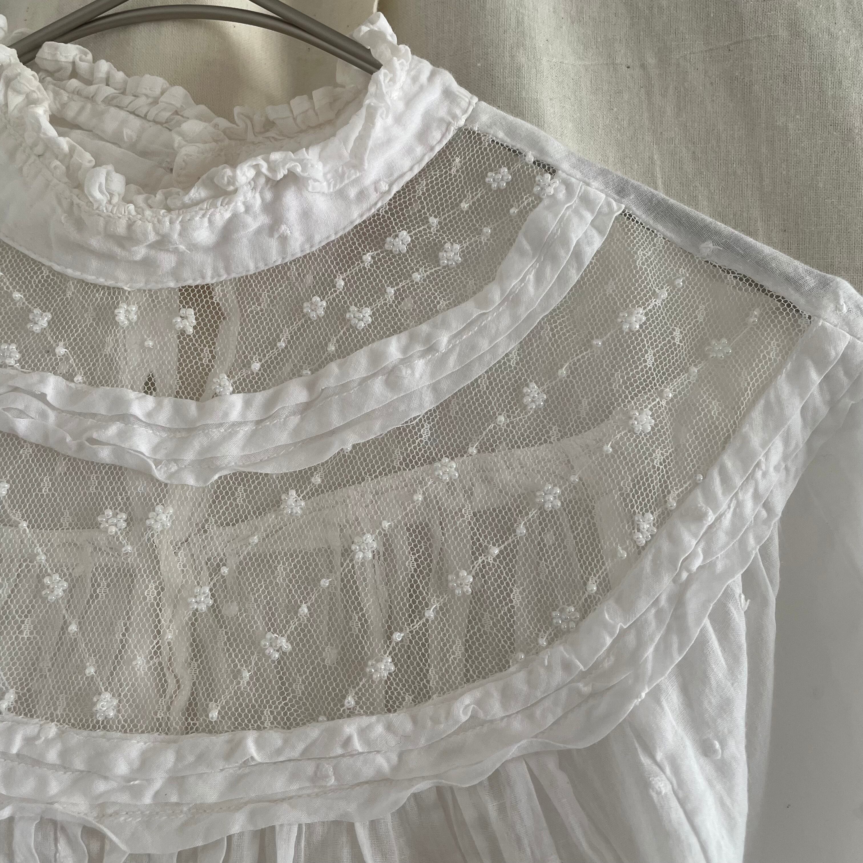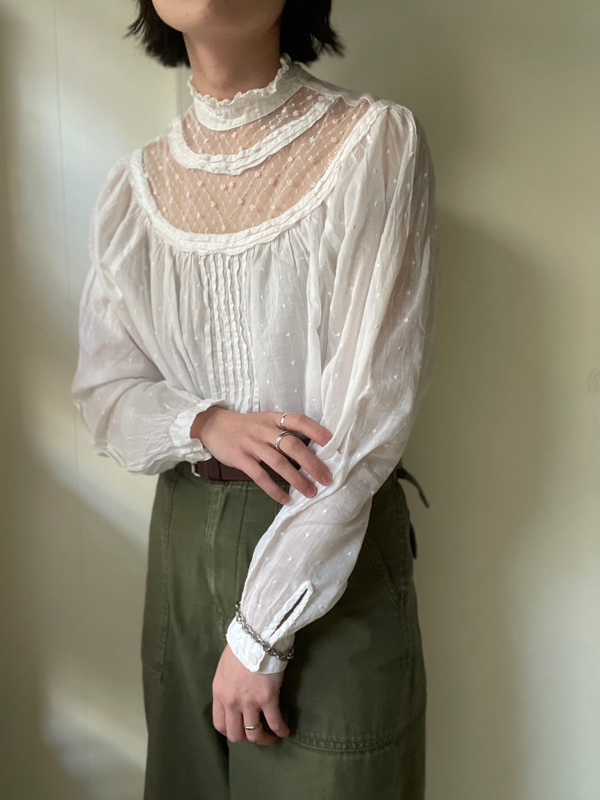 透け感のある胸元にビーズがあしらわれたコットンブラウス