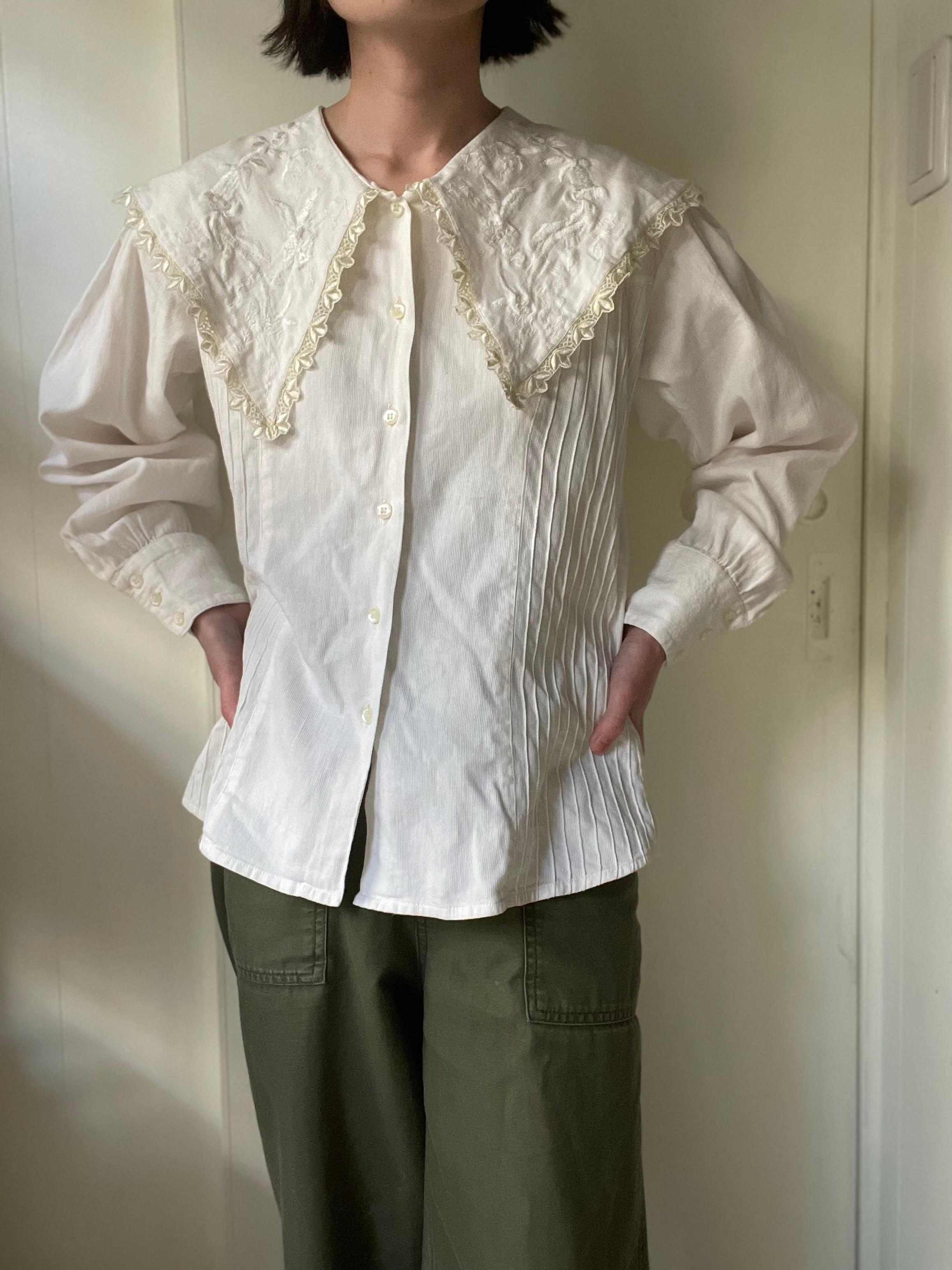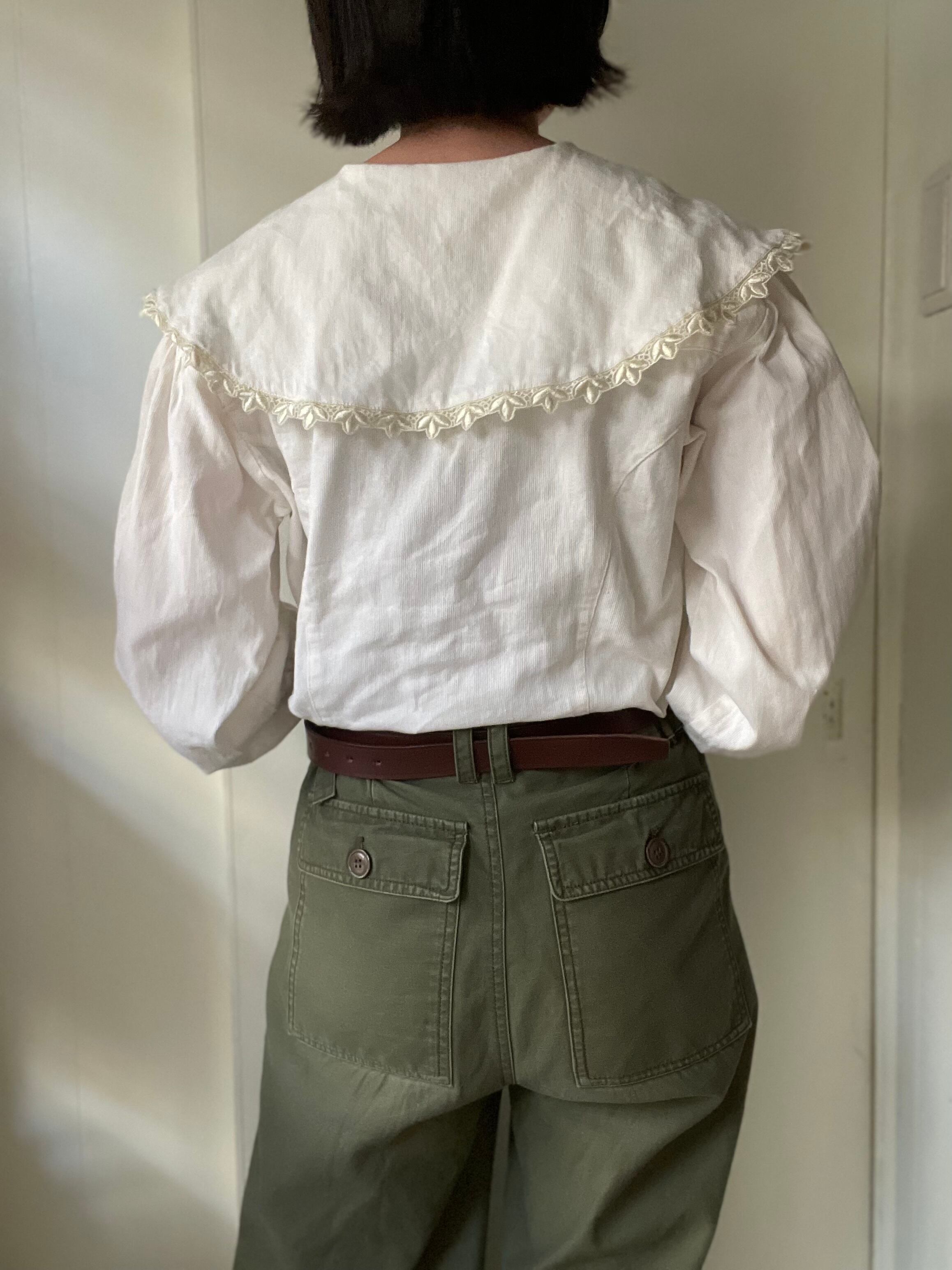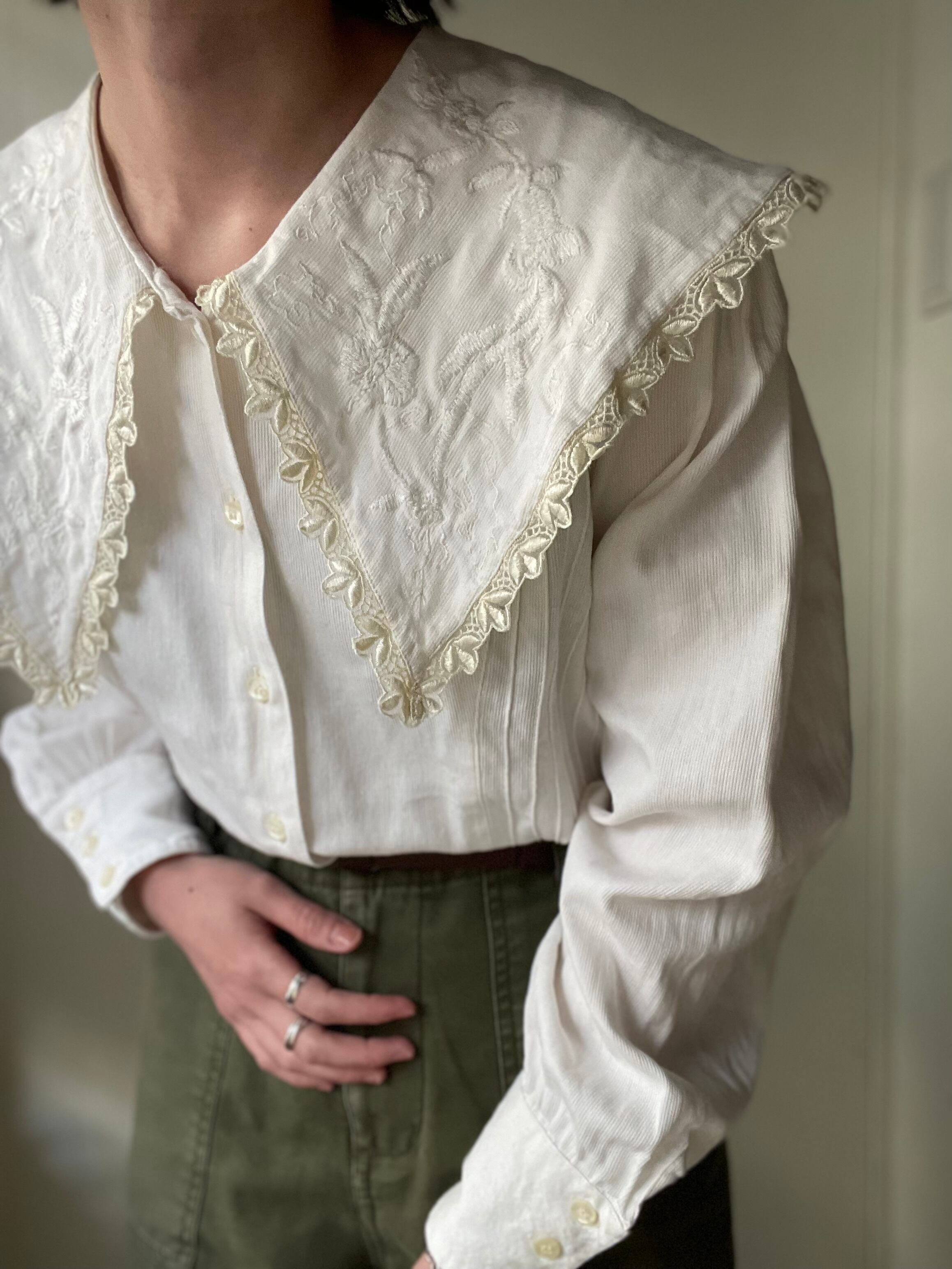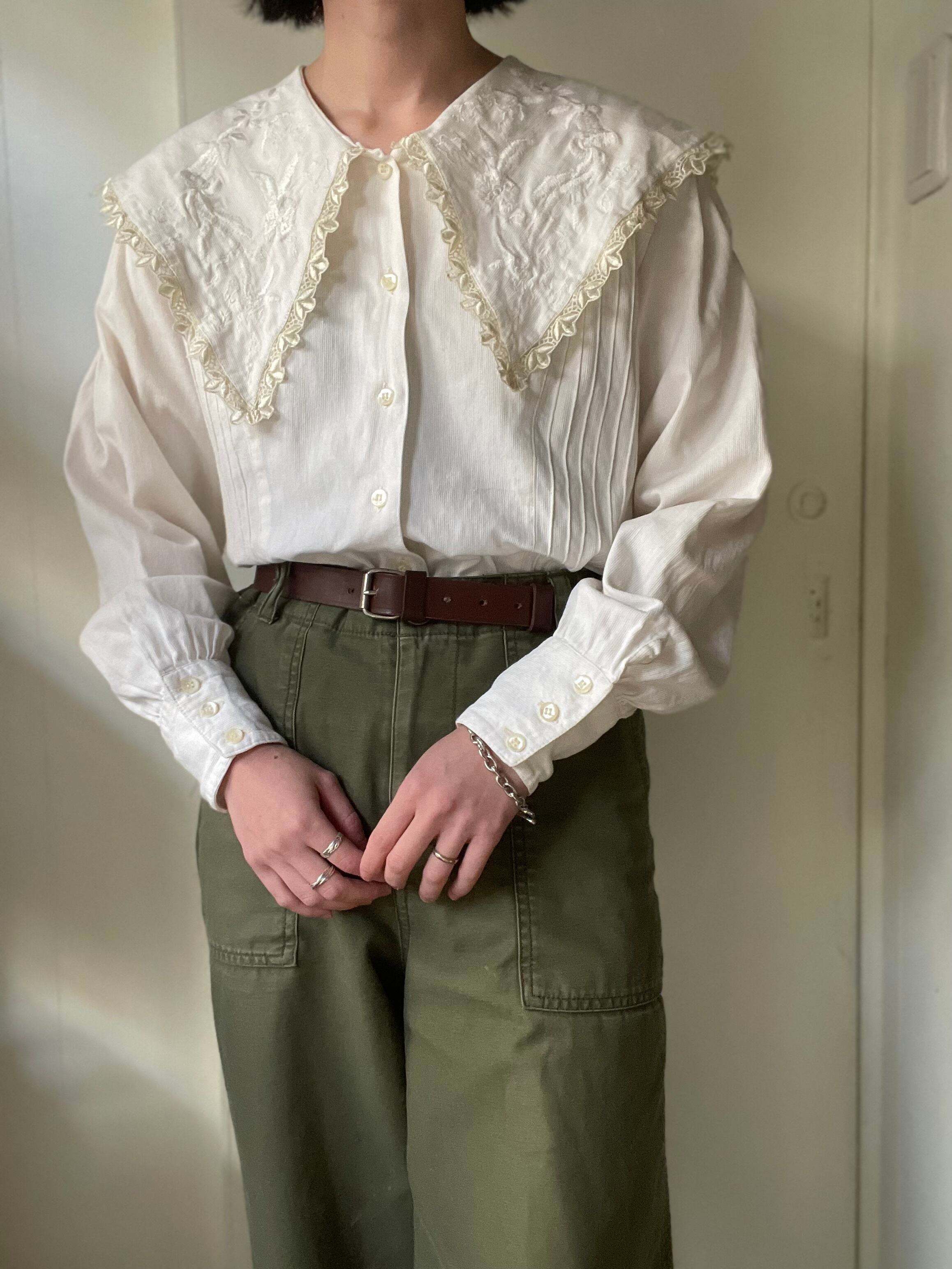 秋冬はスウェットやニットから襟元を出して着るのも可愛い1枚です