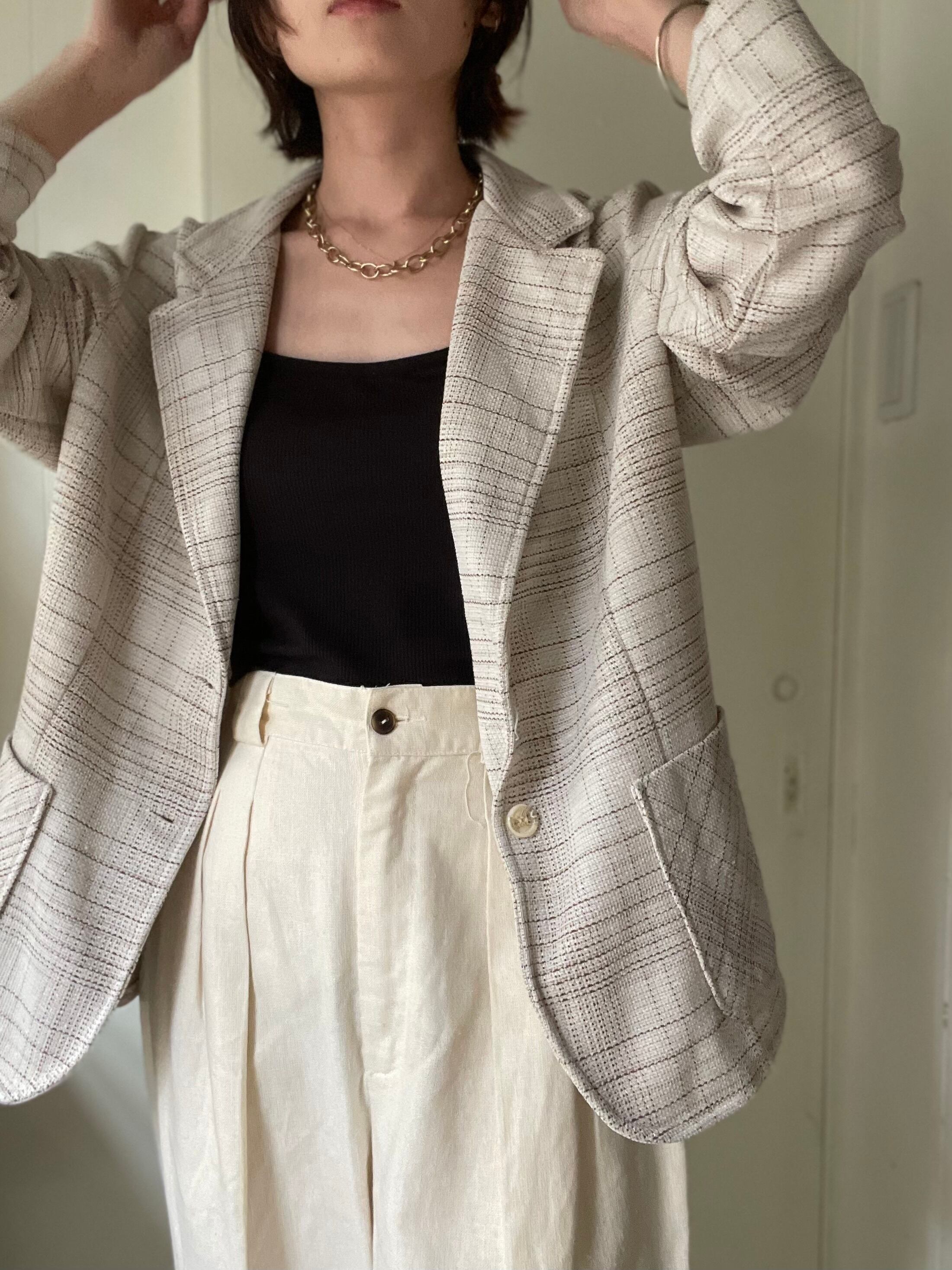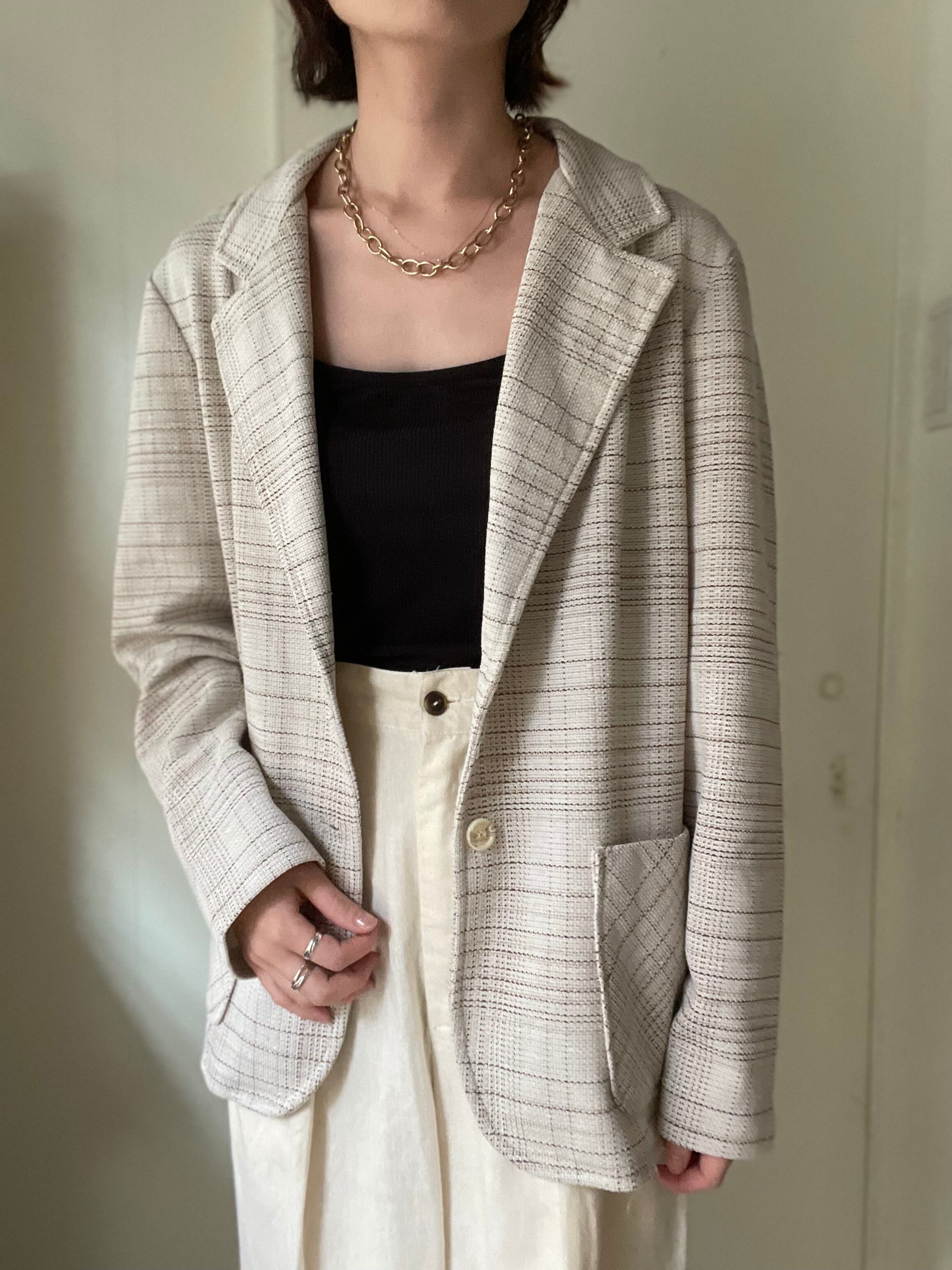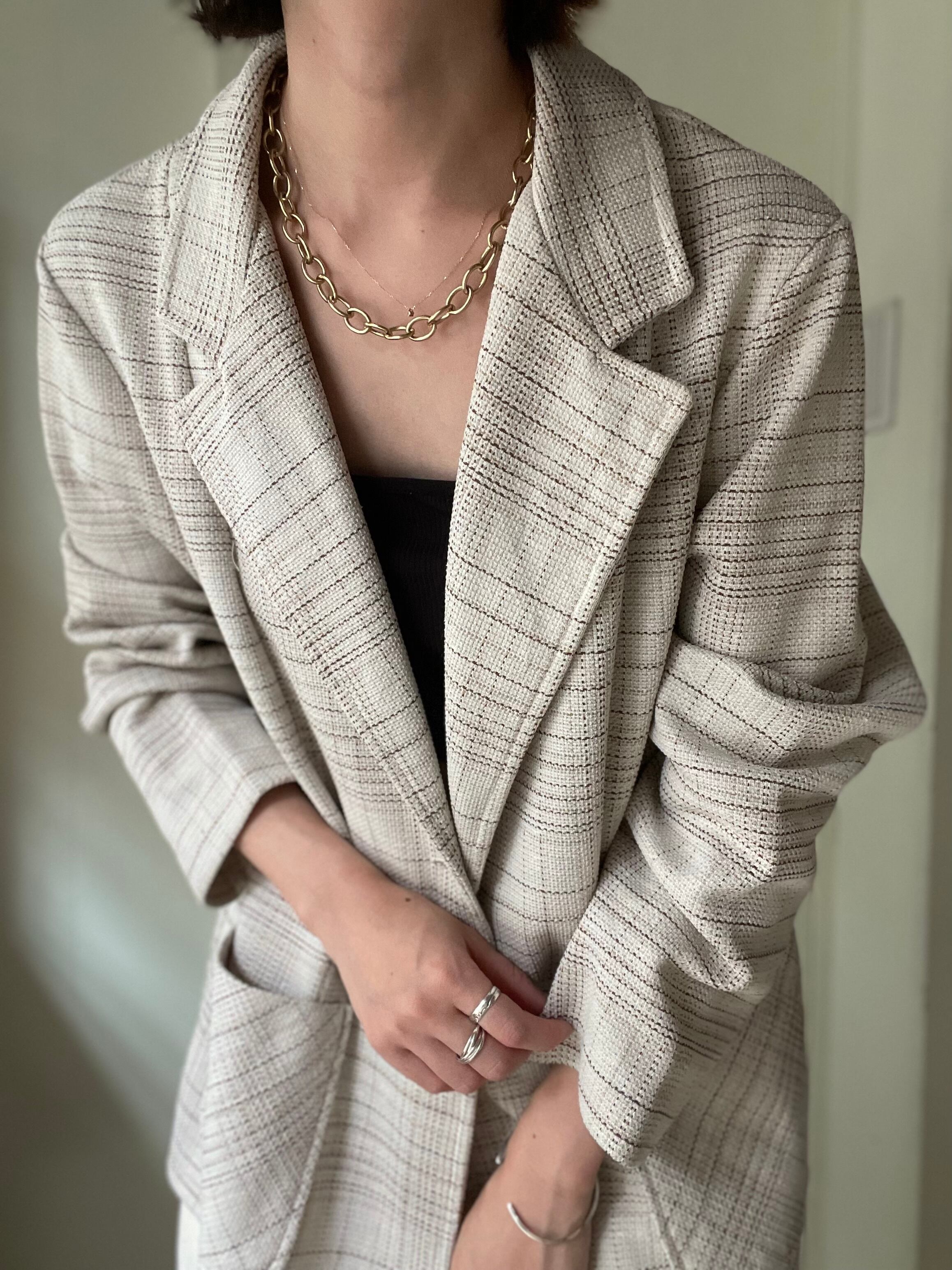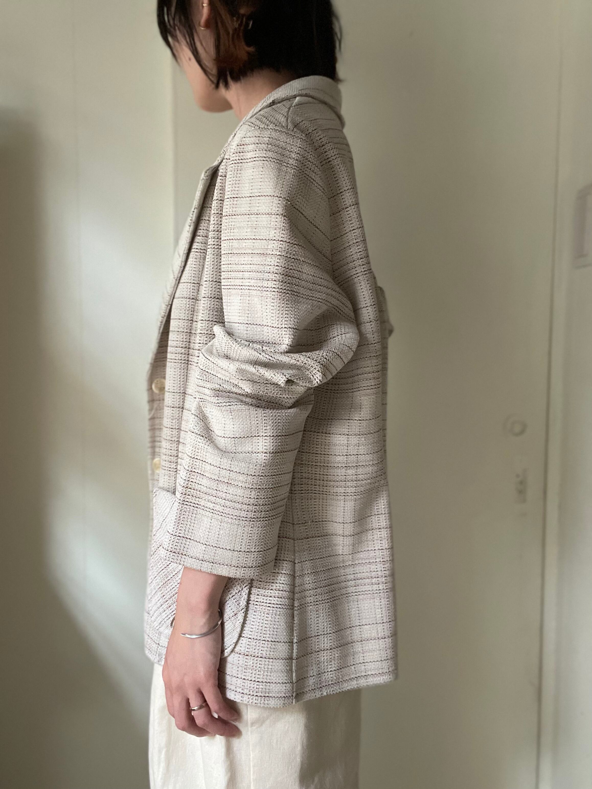 優しいグレージュにブラウンの色合わせが可愛いチェックジャケット