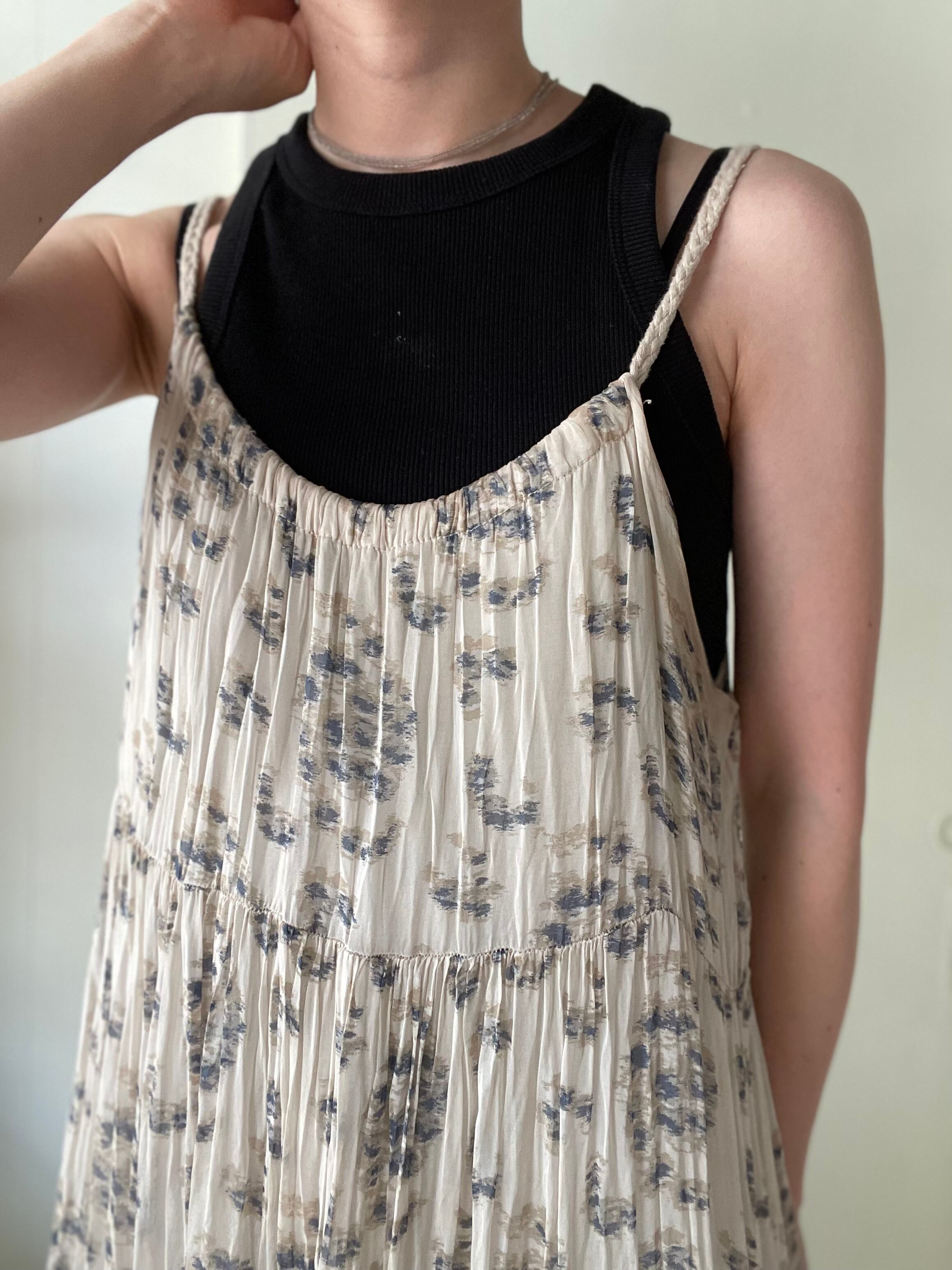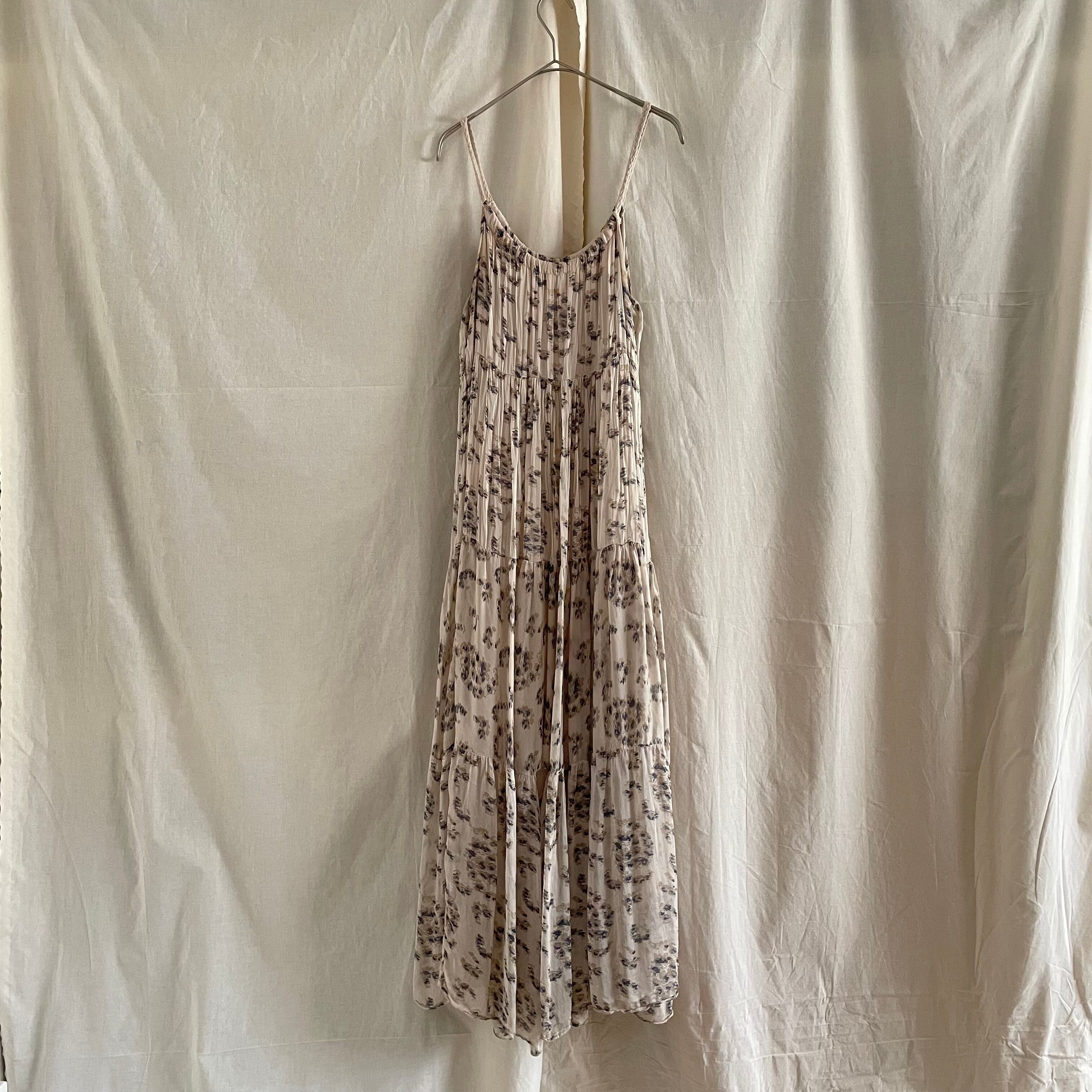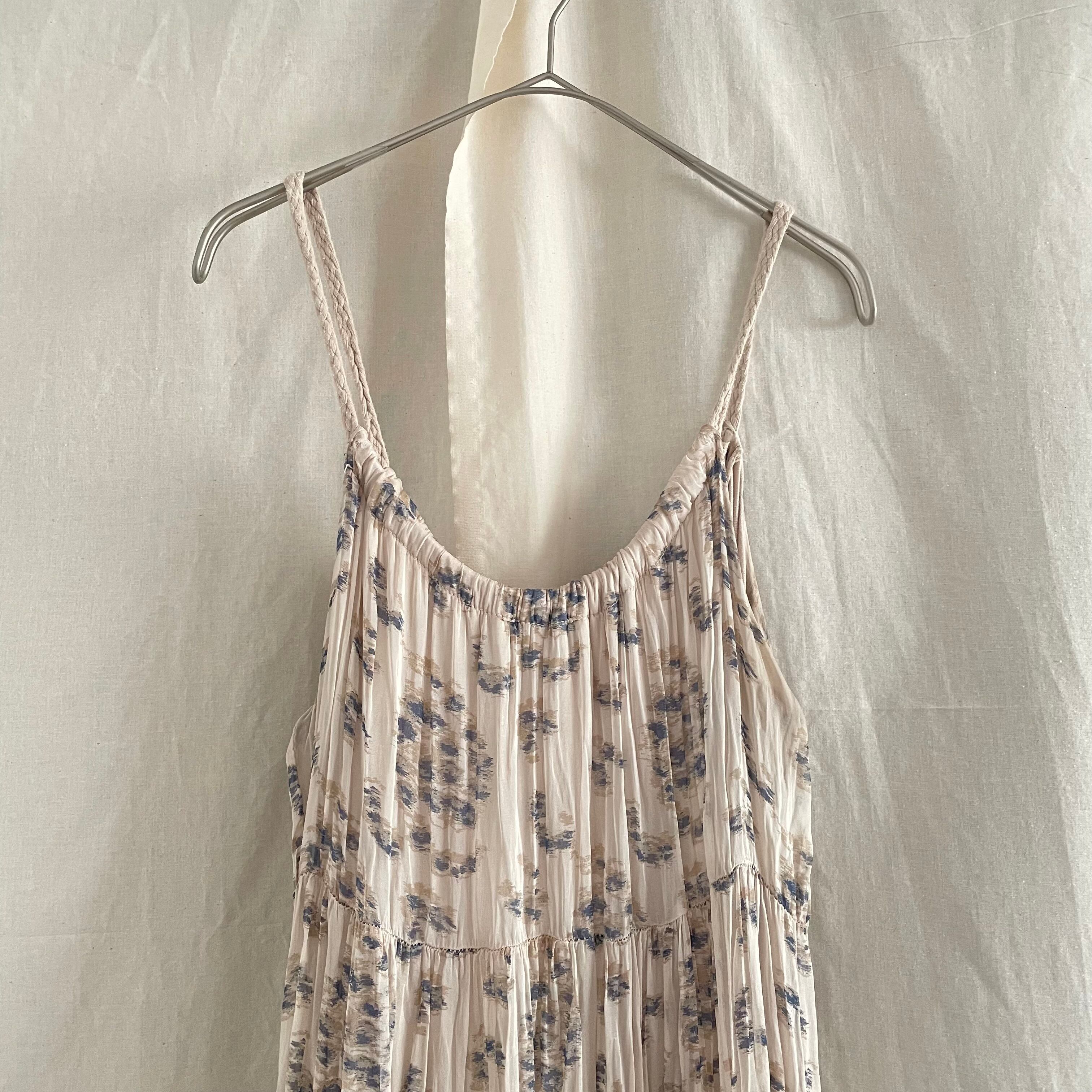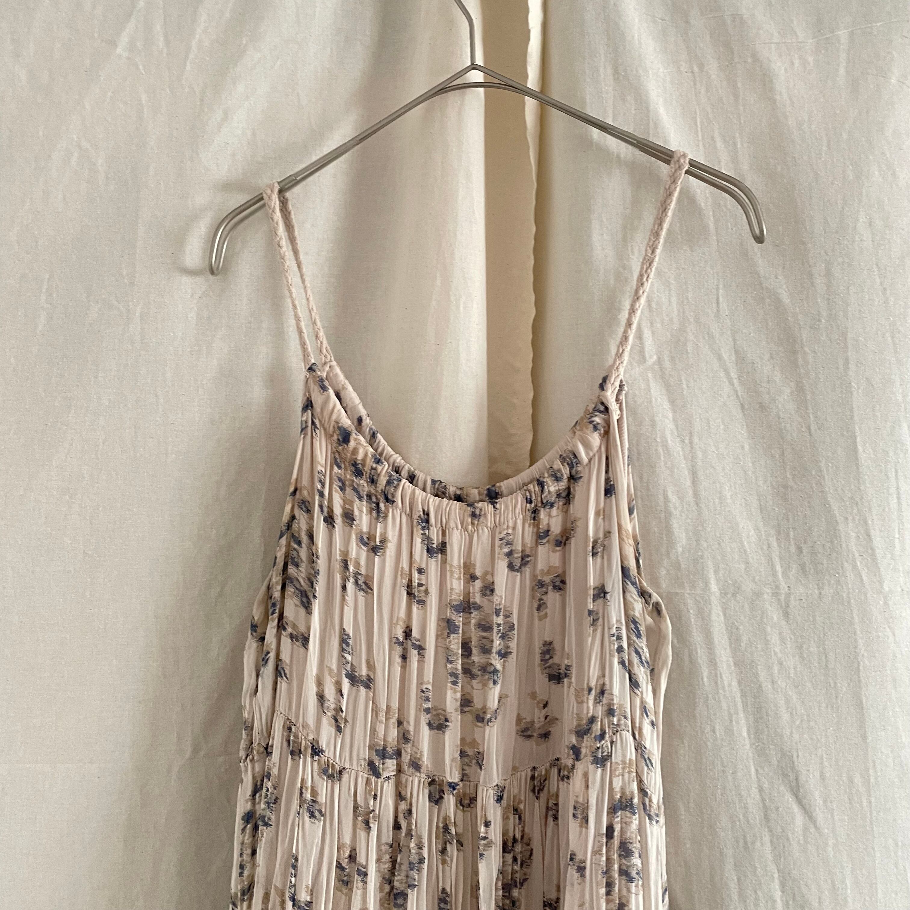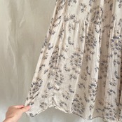 淡いカラーと、ニュアンス柄が大人な雰囲気のティアードワンピース