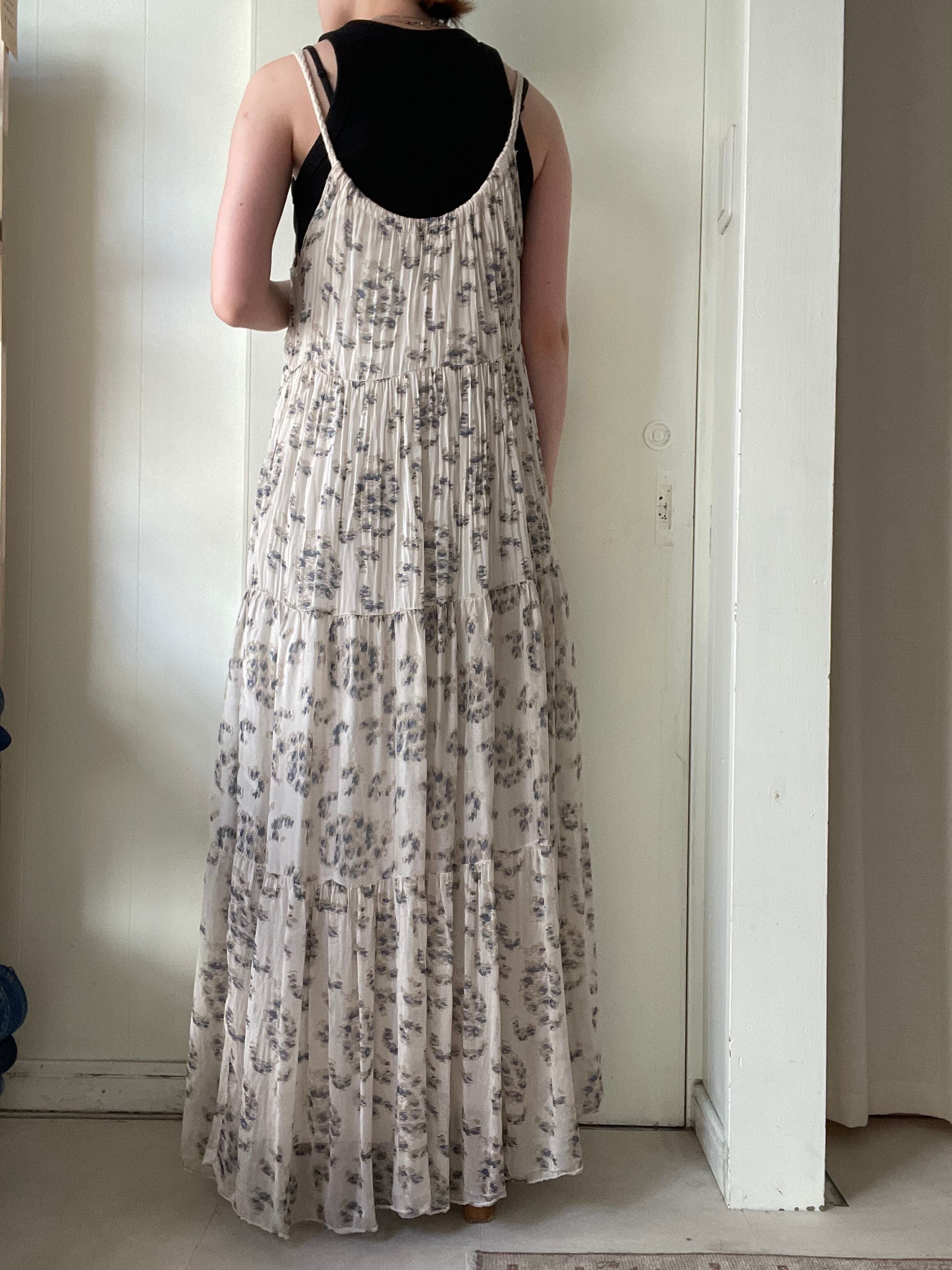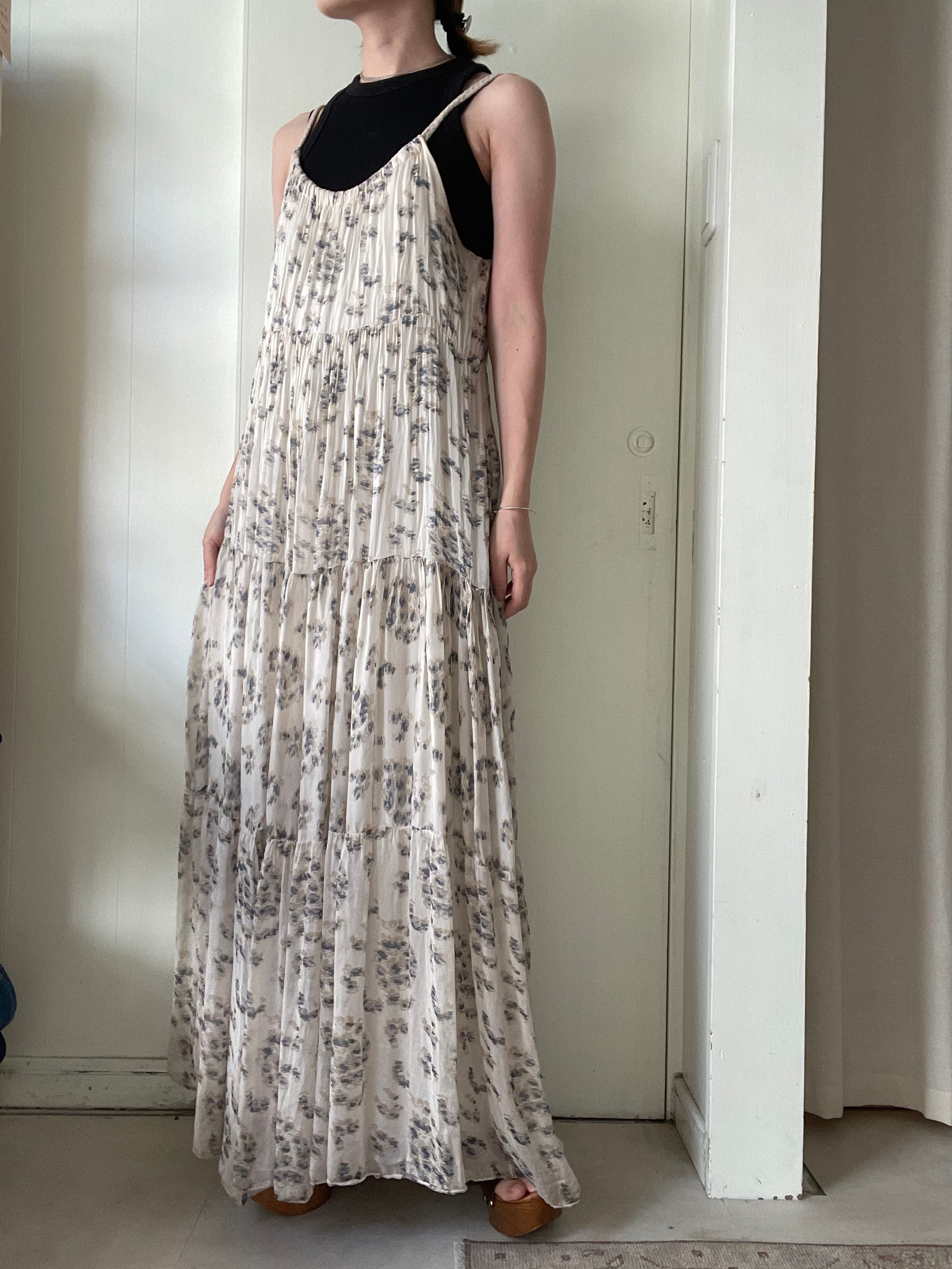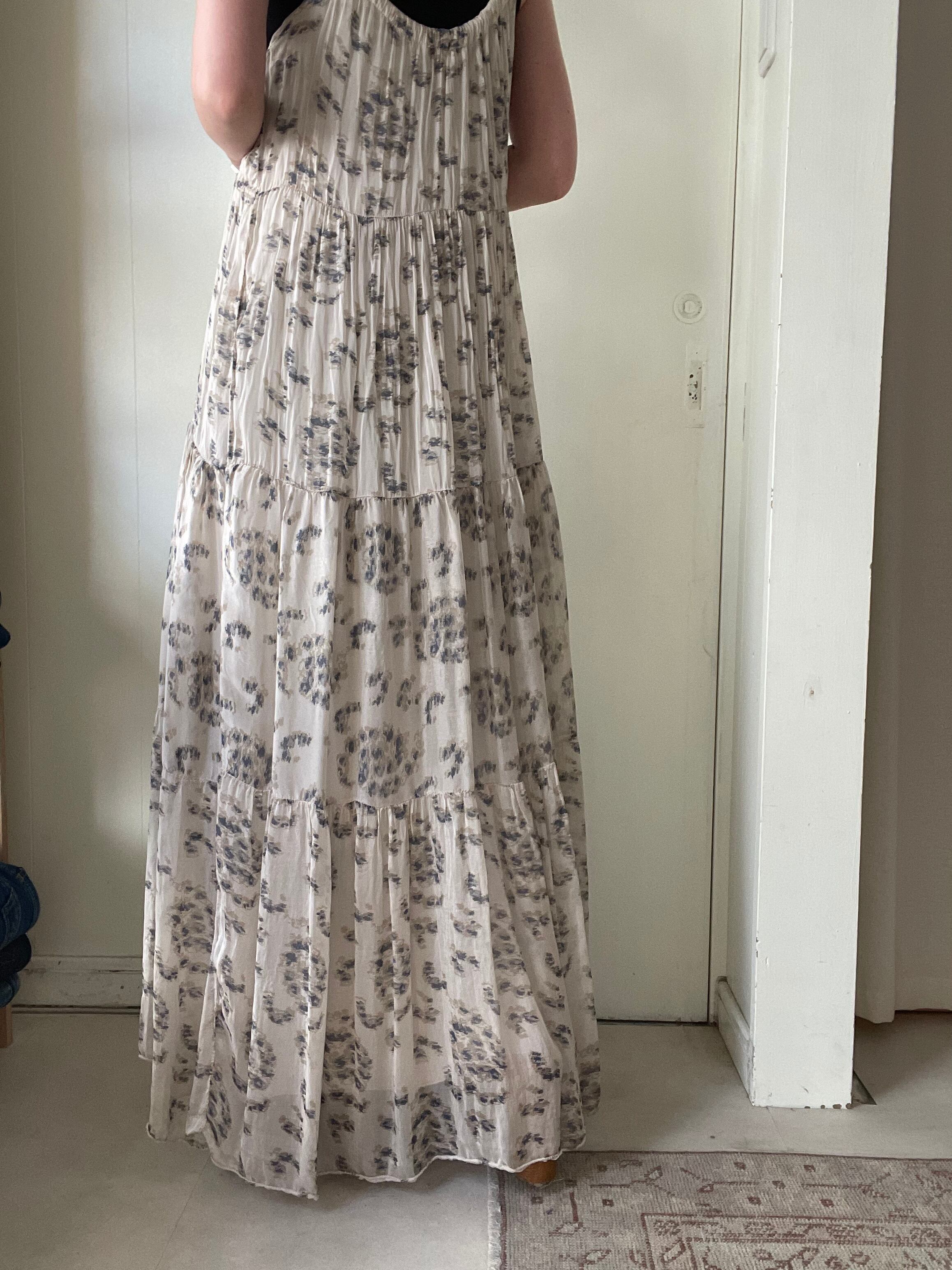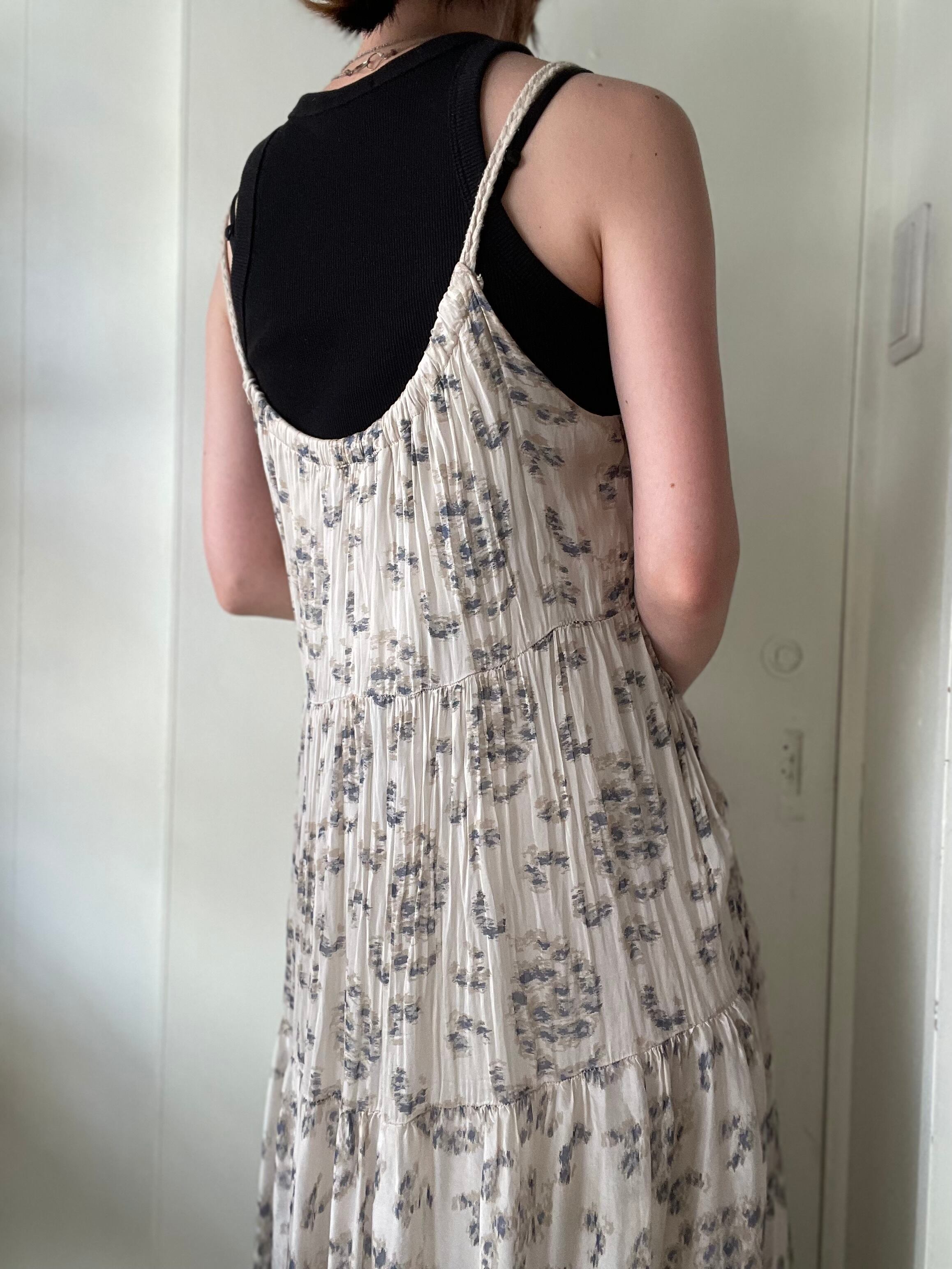 淡いカラーと、ニュアンス柄が大人な雰囲気のティアードワンピース