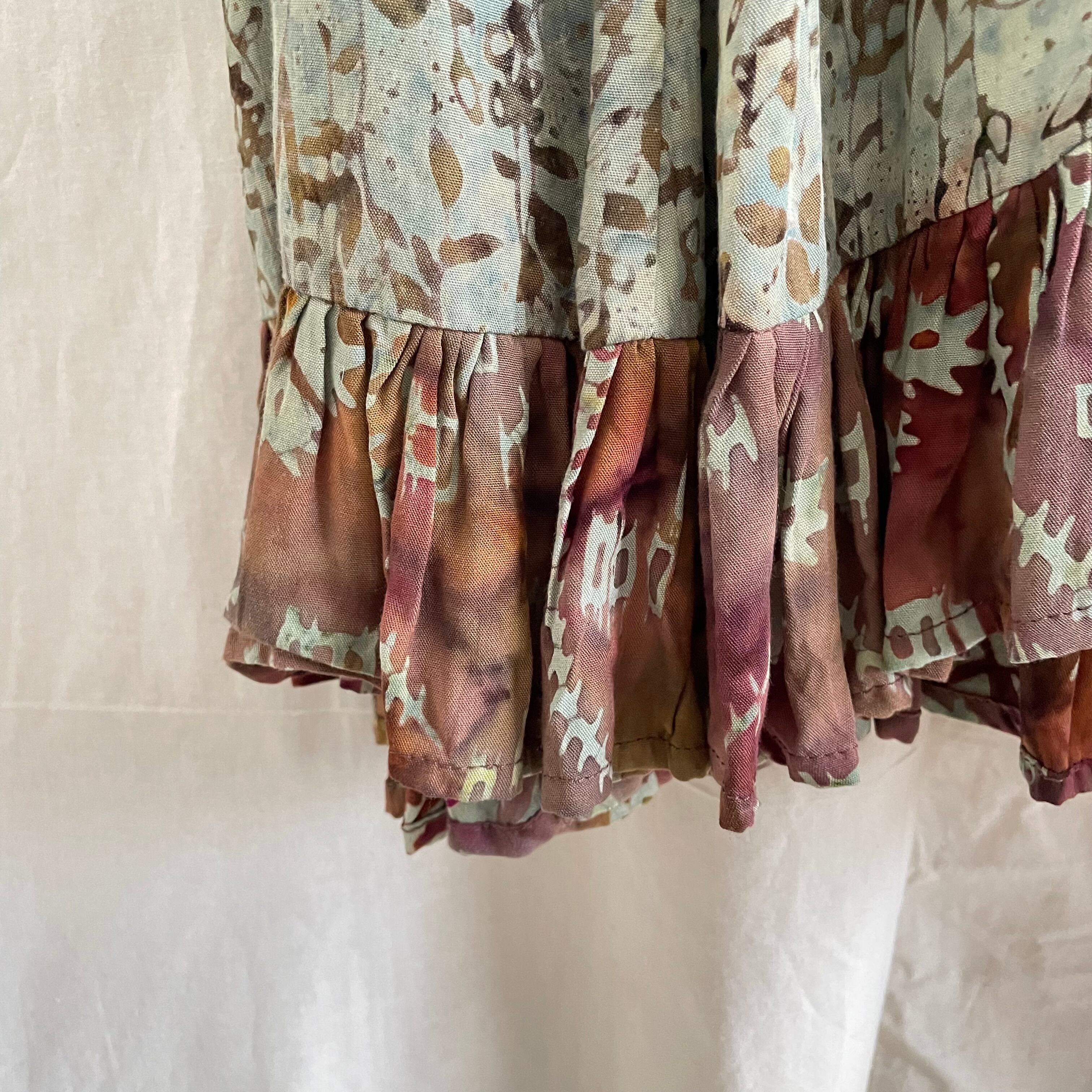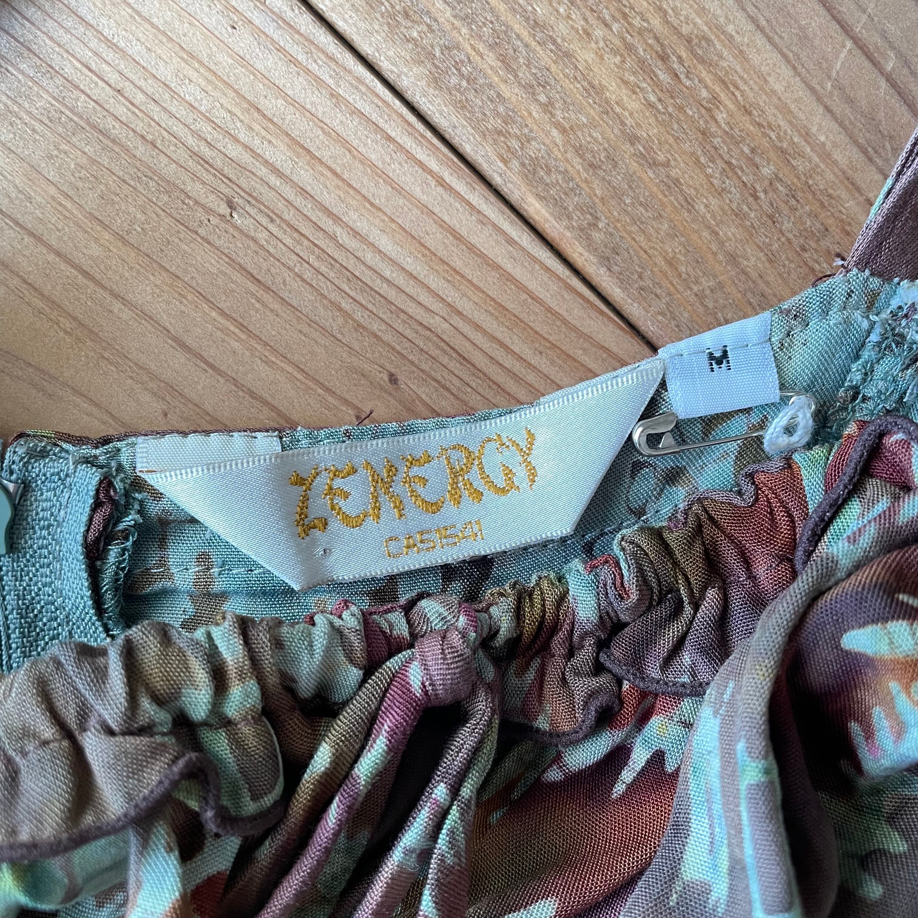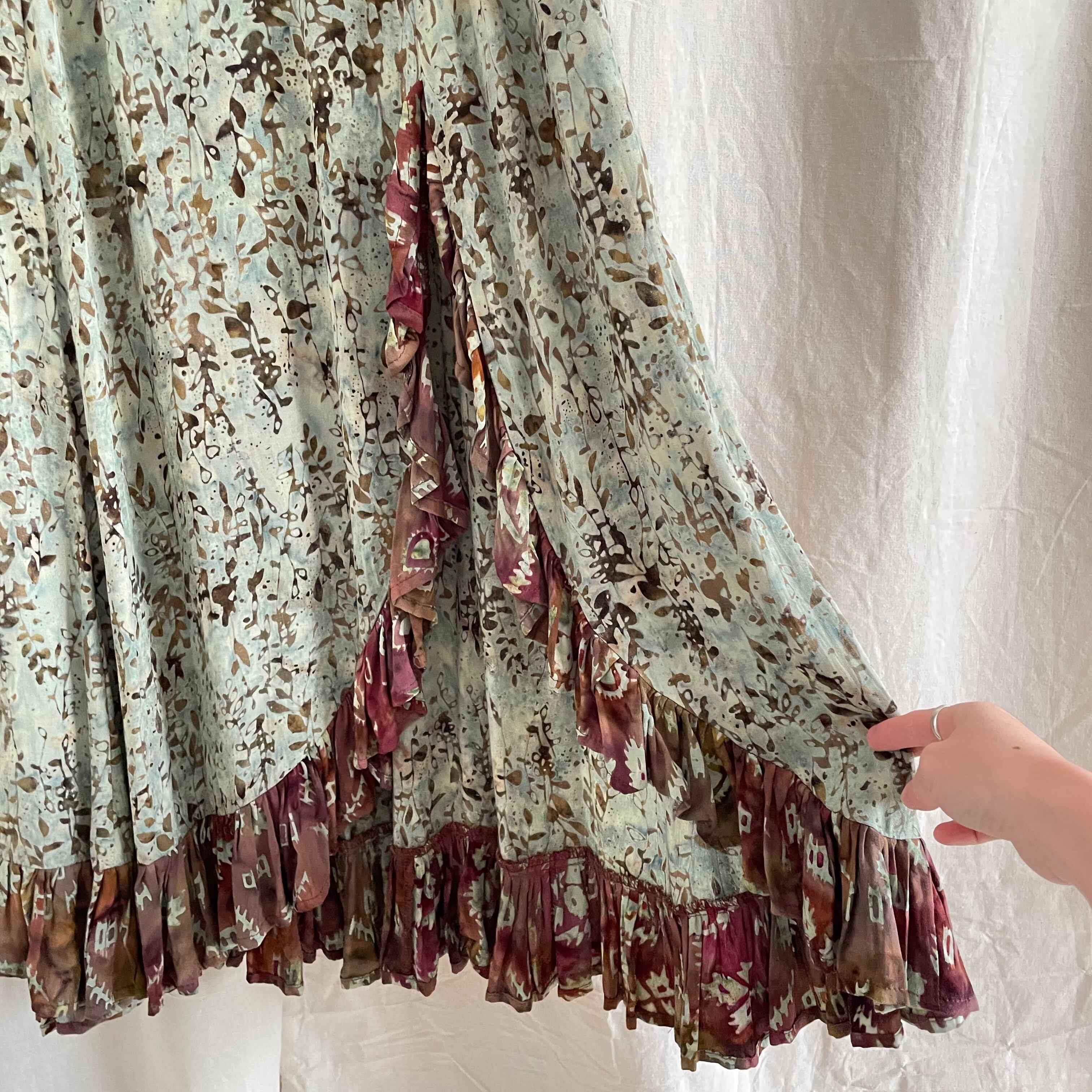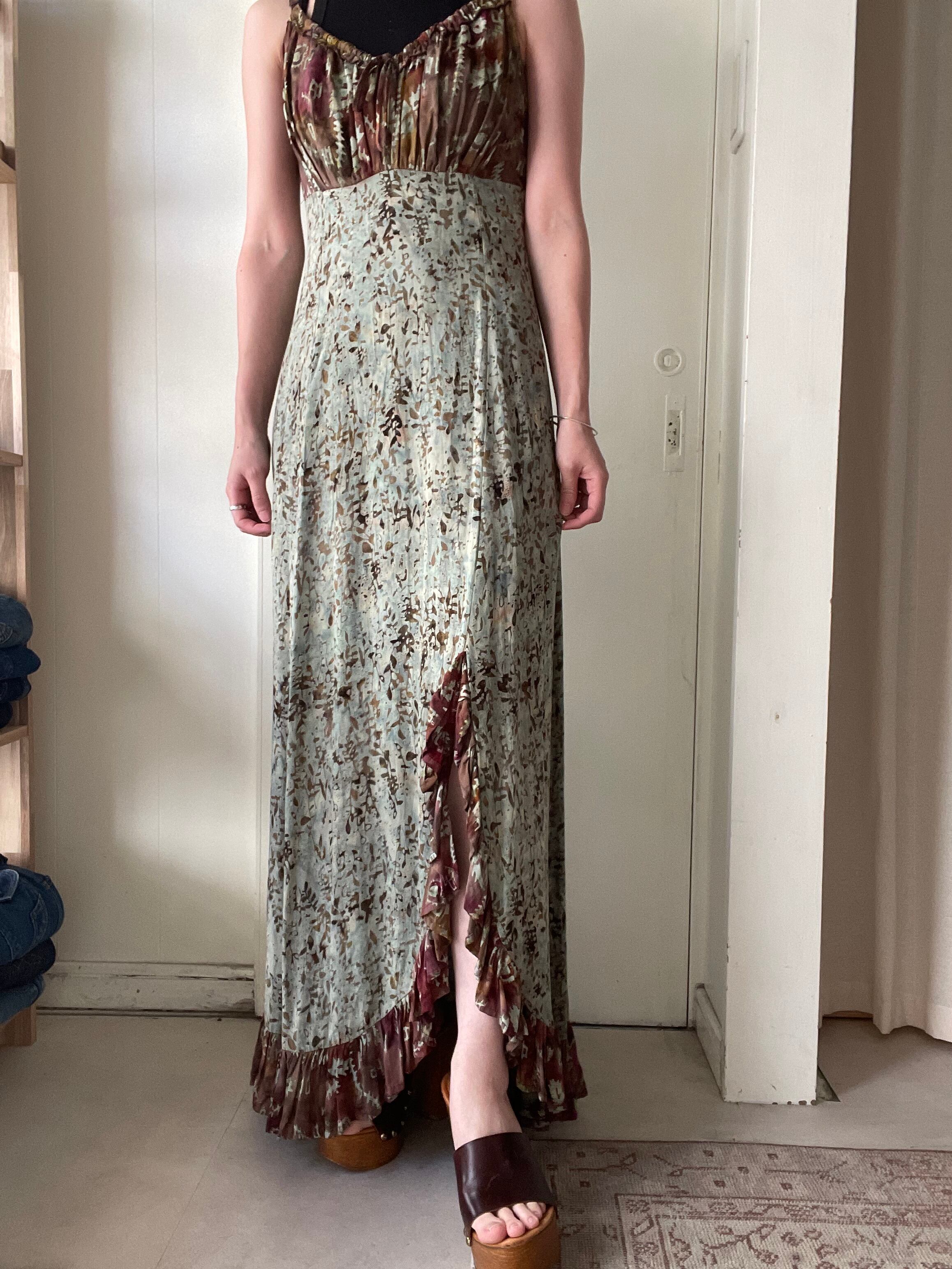 センターに入ったスリットや裾にあしらわれたフリルが華やかな1枚です