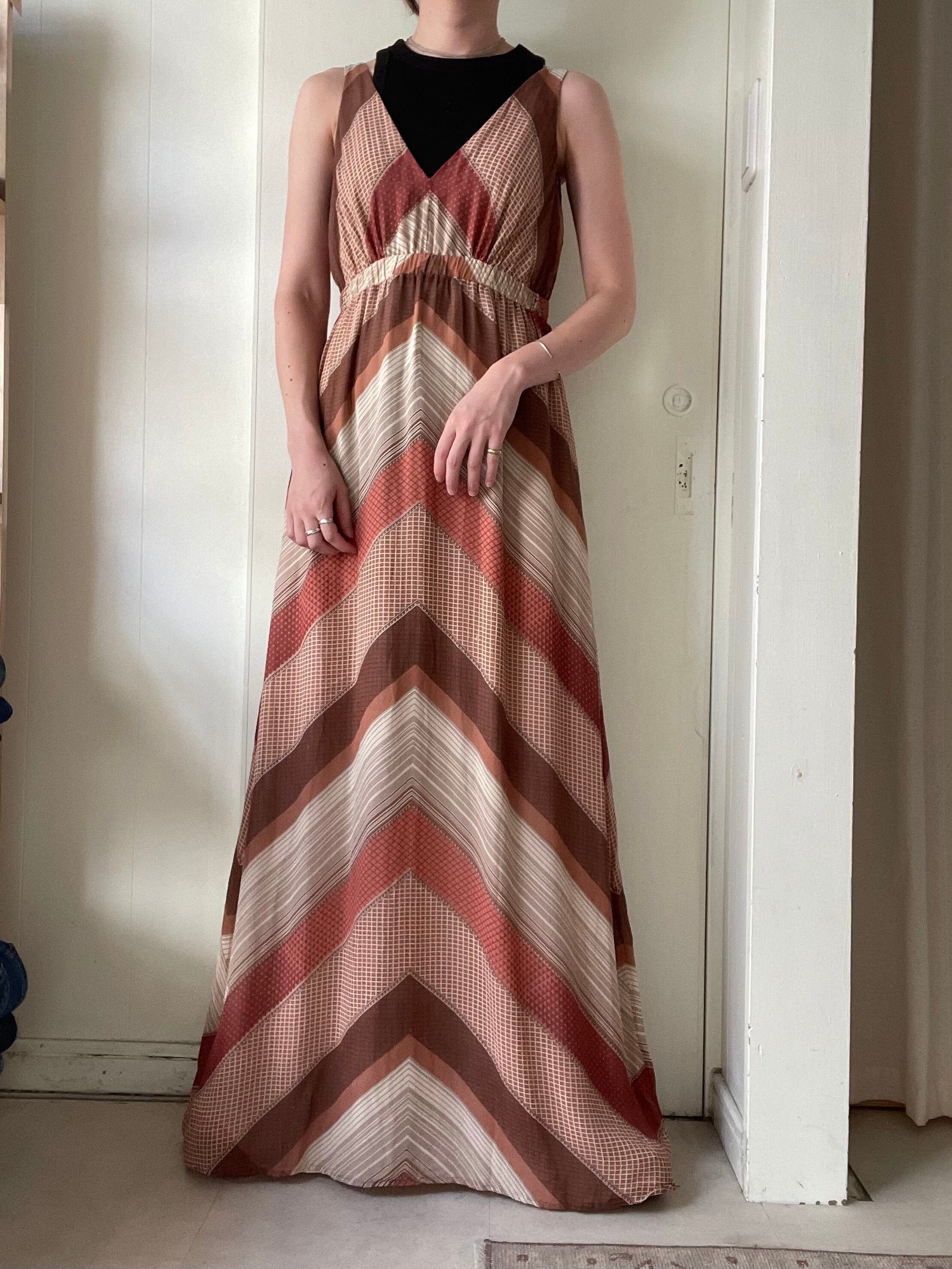 全体的に落ち着いたブラウンやテラコッタカラーが大人な雰囲気のワンピースです