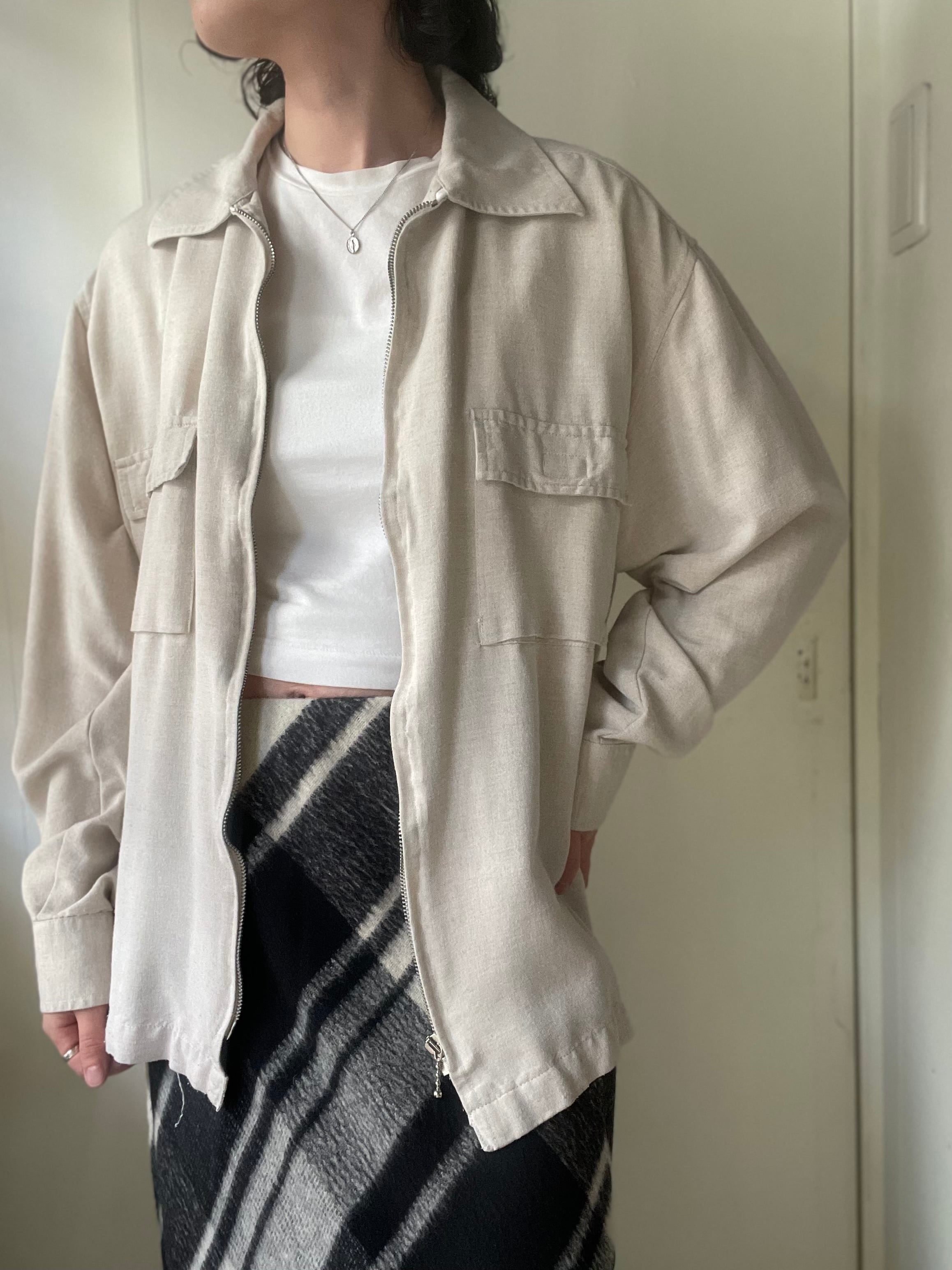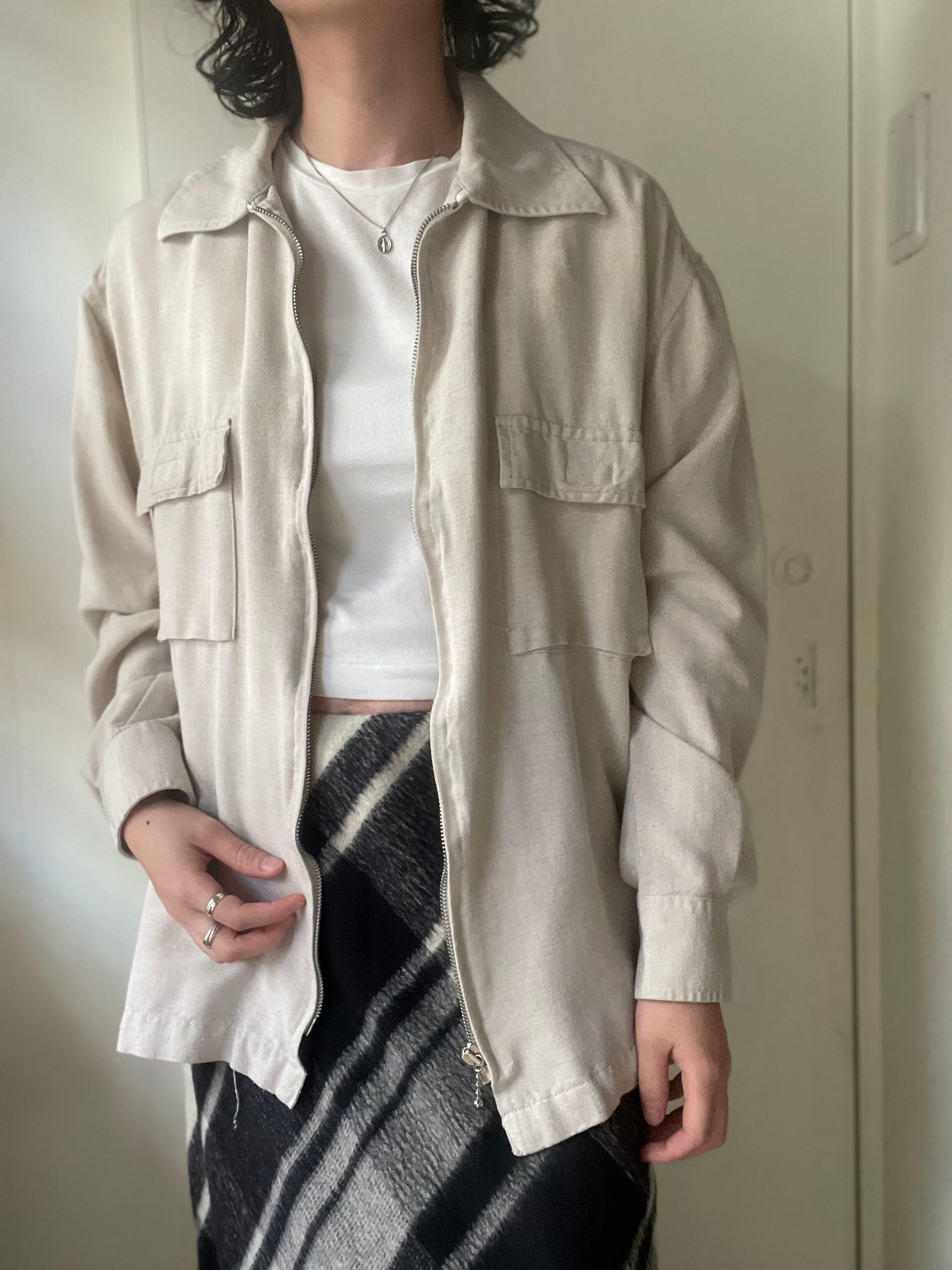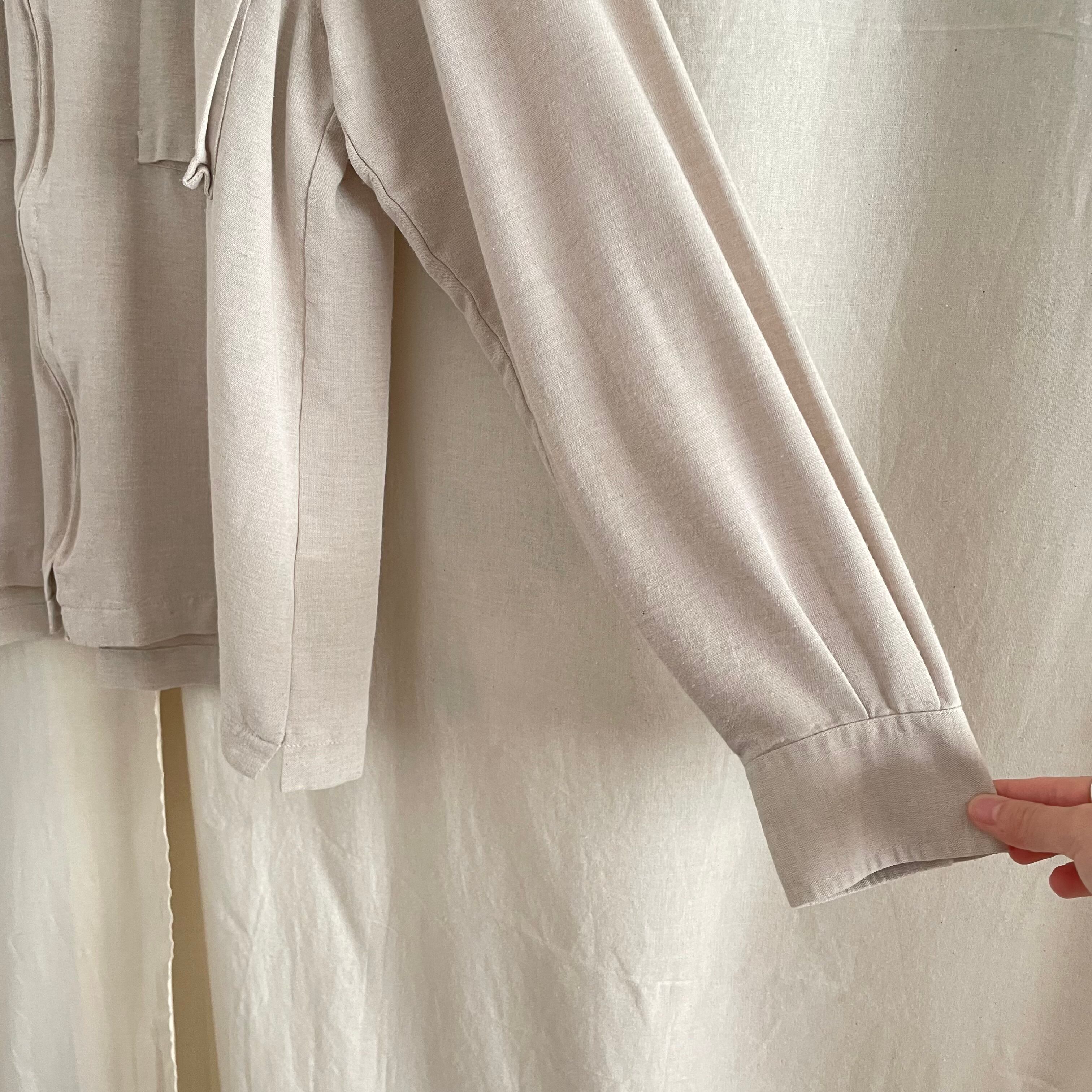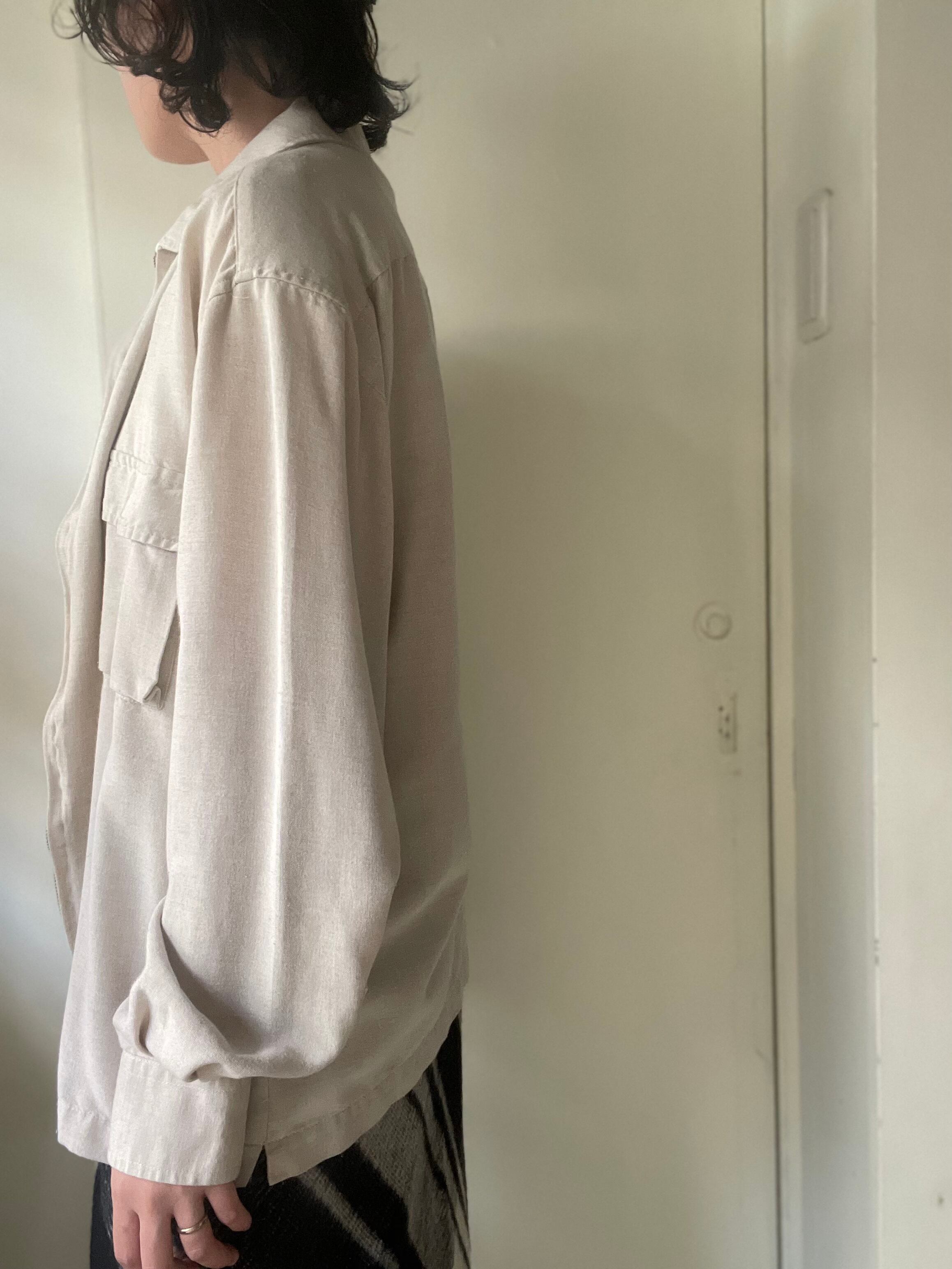 薄い生地感で体温調節の難しい、今の時期にサラッと羽織れるアイテム