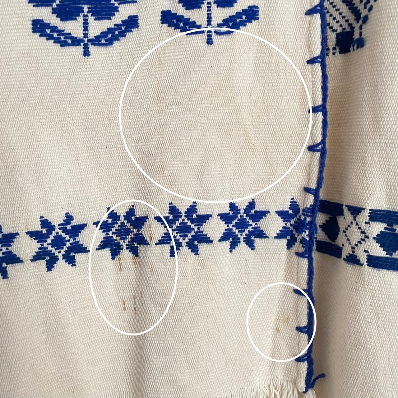 前左肩、脇腹、見頃、すそ付近に汚れあり