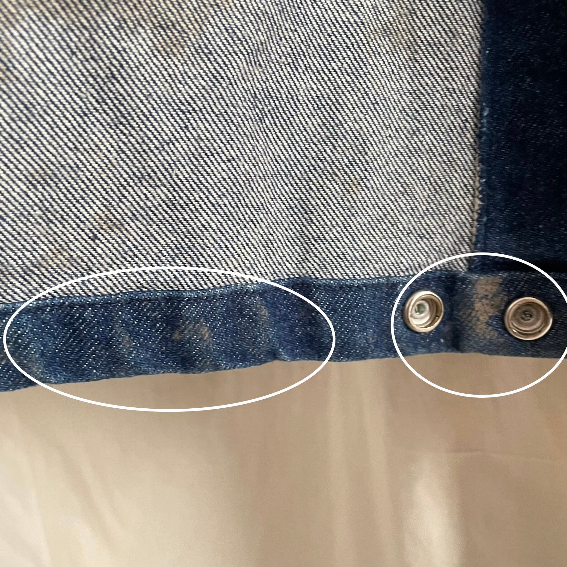 感じ方には個人差があるかと思いますが、目立つもの以外は記載しておりません。小さな汚れやダメージ、使用感などは古着の特性としてご理解お願いします。