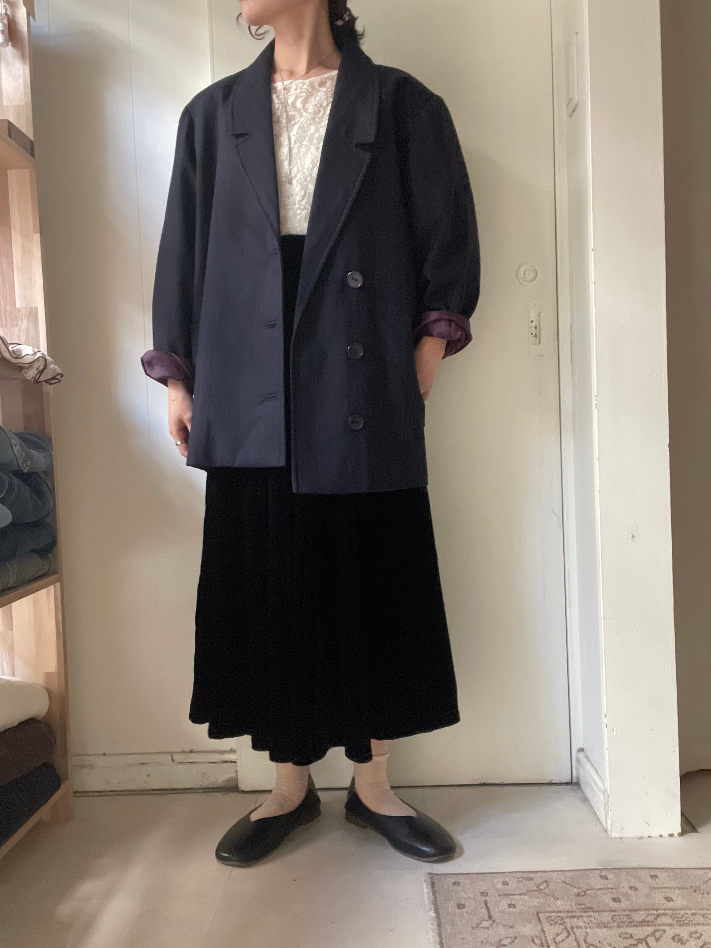 黒っぽく見えますが、濃いめのネイビーカラーでよく見ると細いストライプ柄がさり気ないポイントです◎