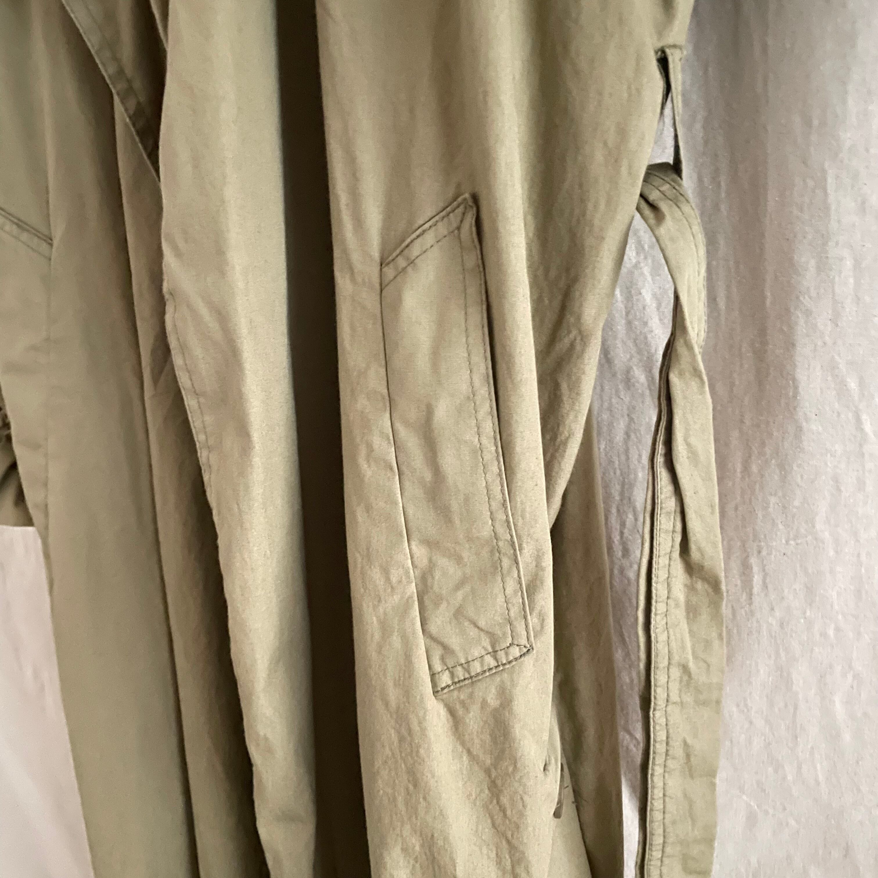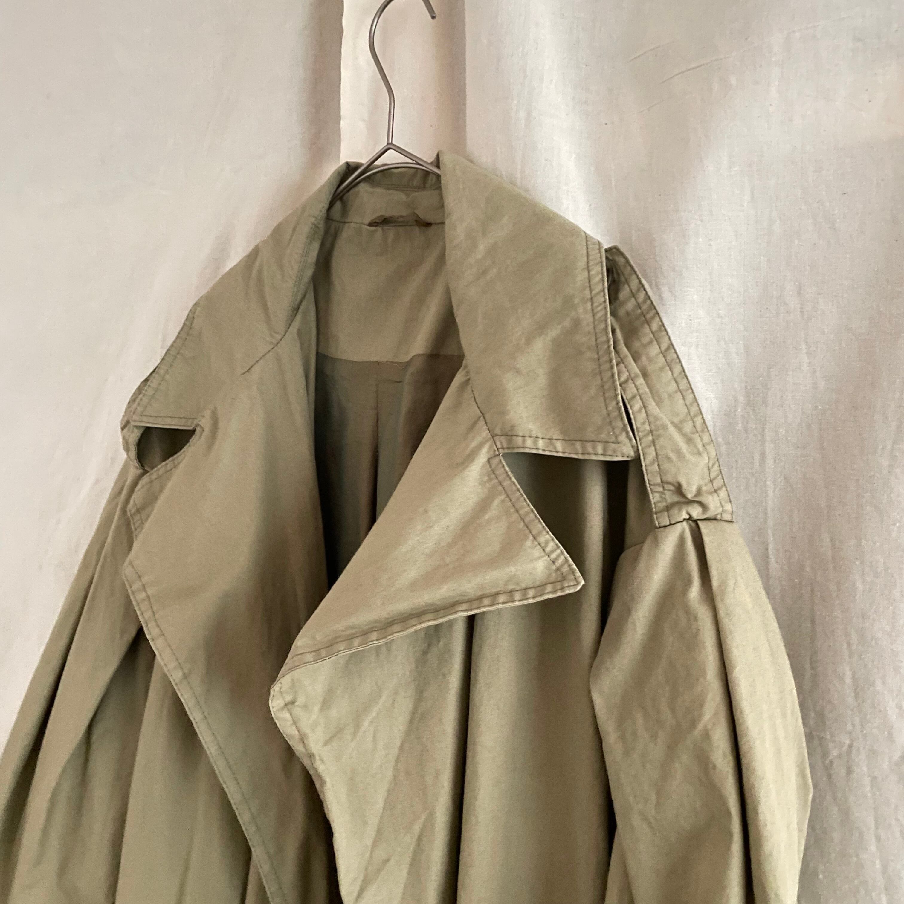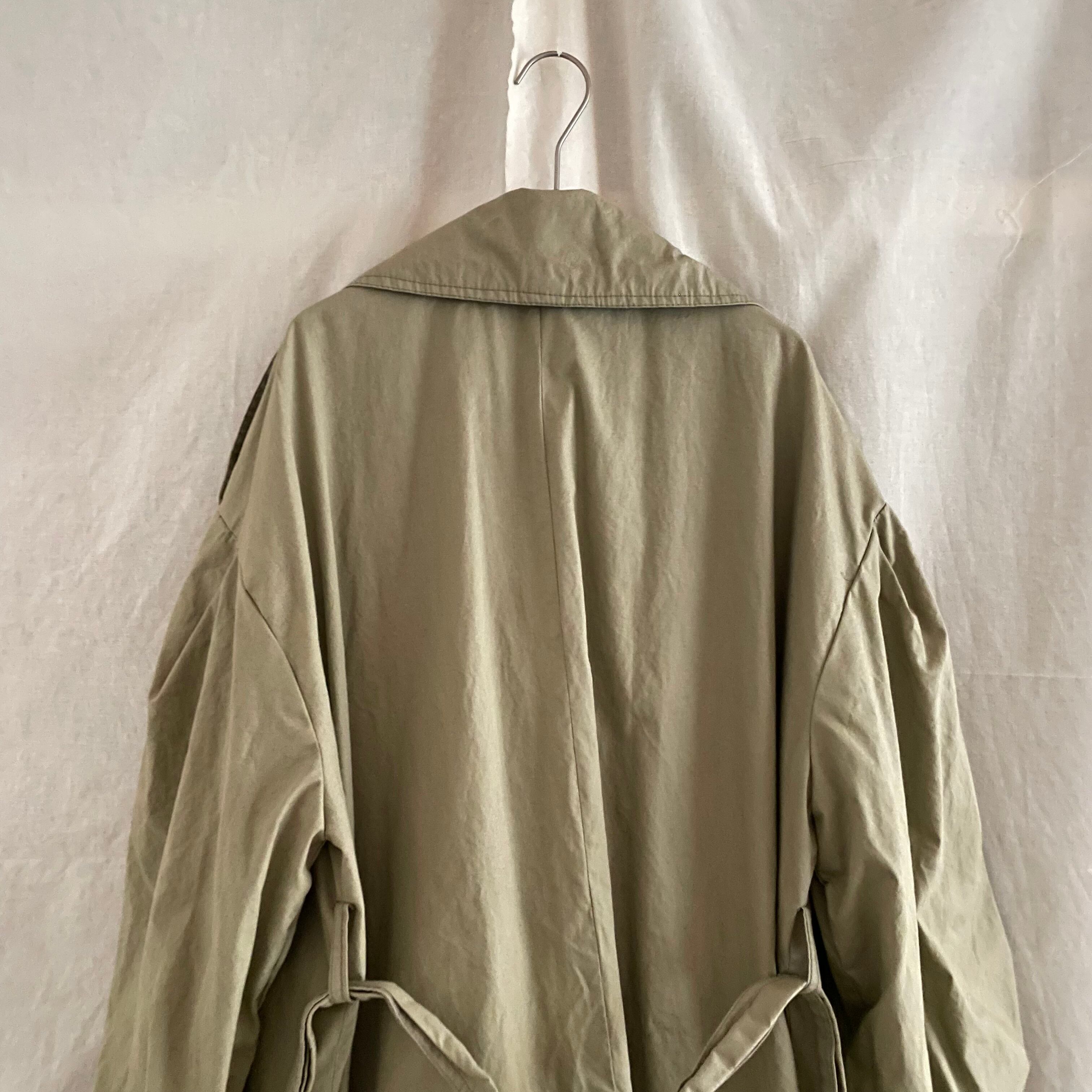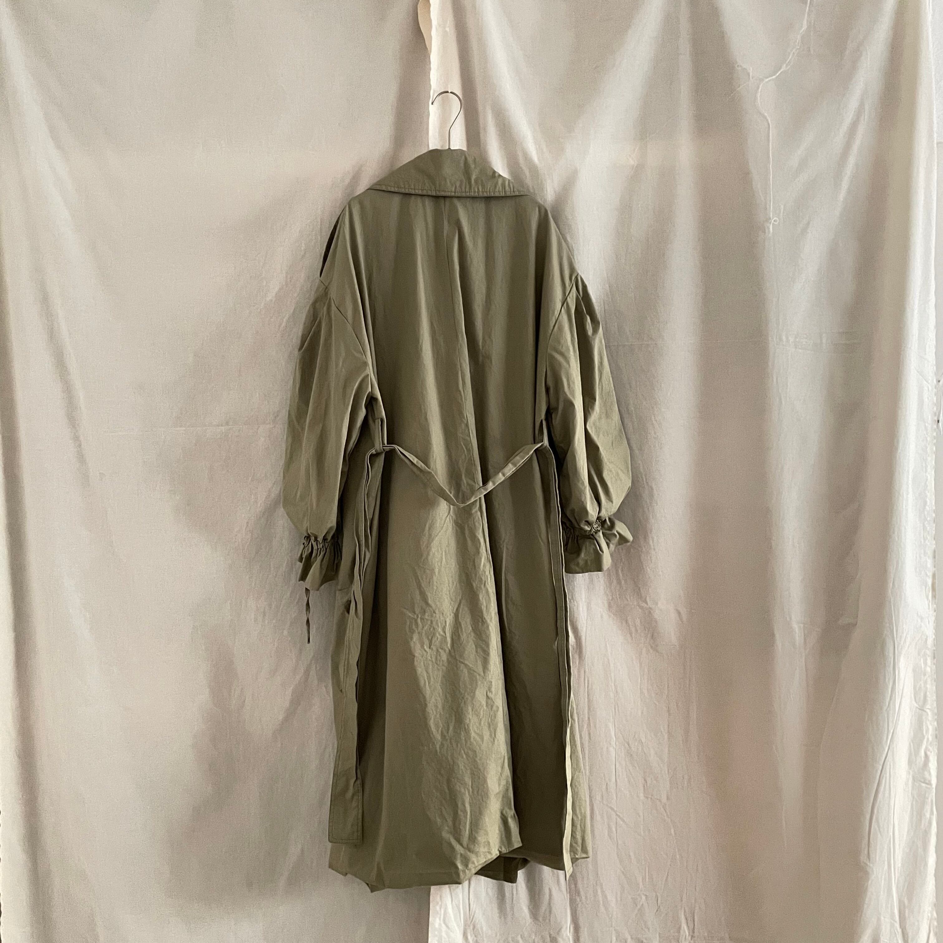 ベージュにグリーンが混ざったような絶妙なオリーブカラーのお色味が可愛いトレンチコート