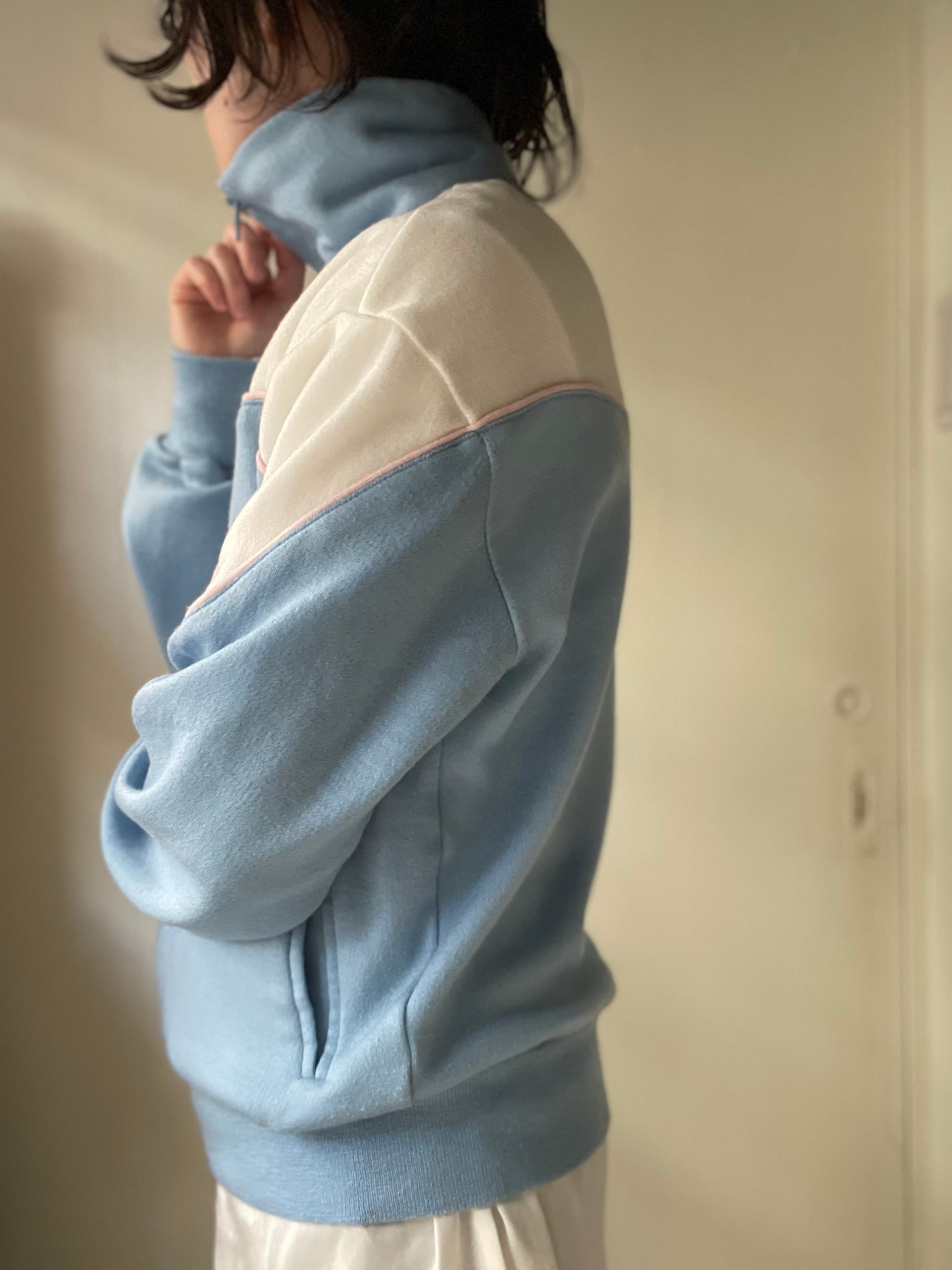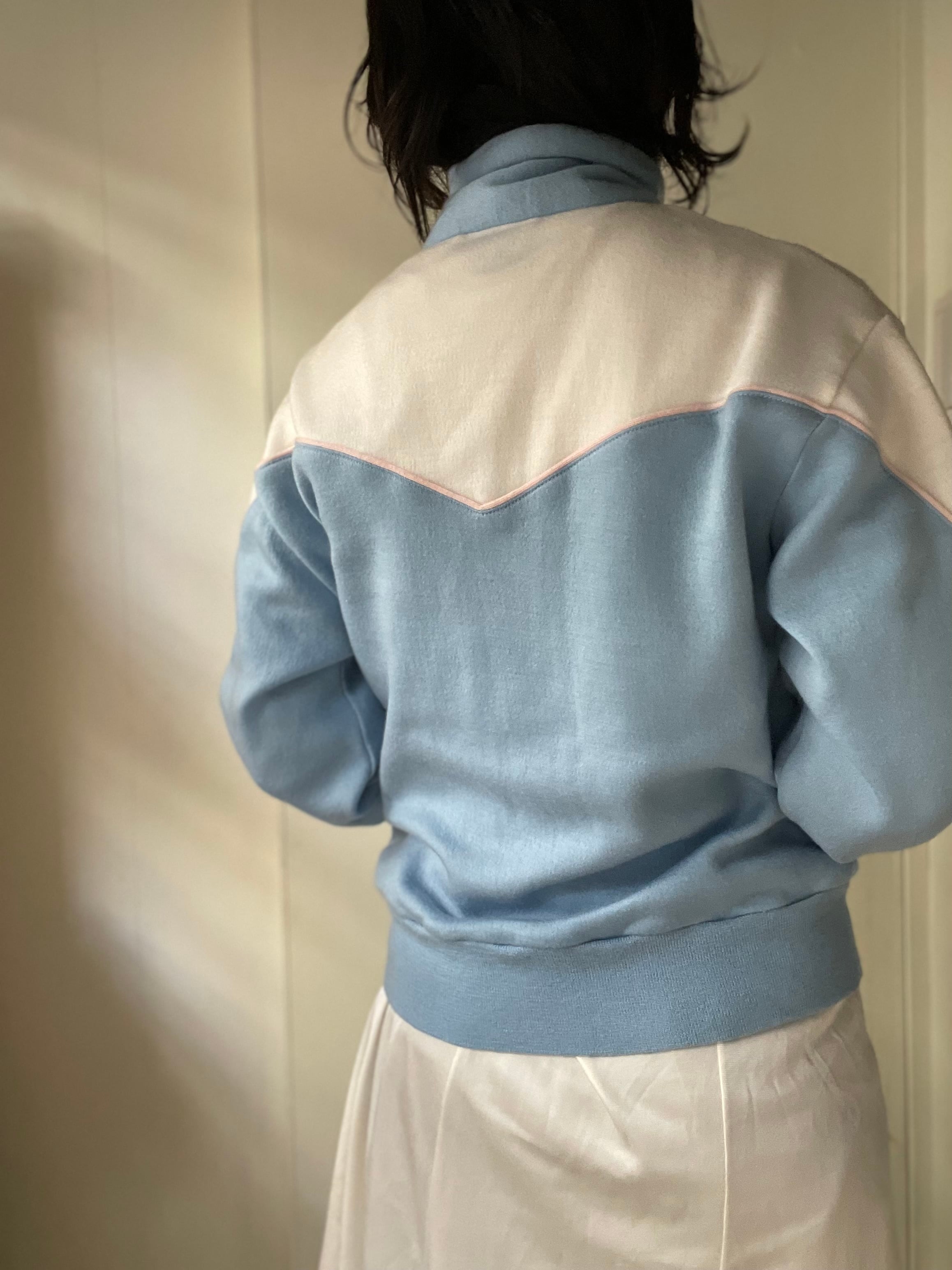 淡いブルーにピンクのパイピングが