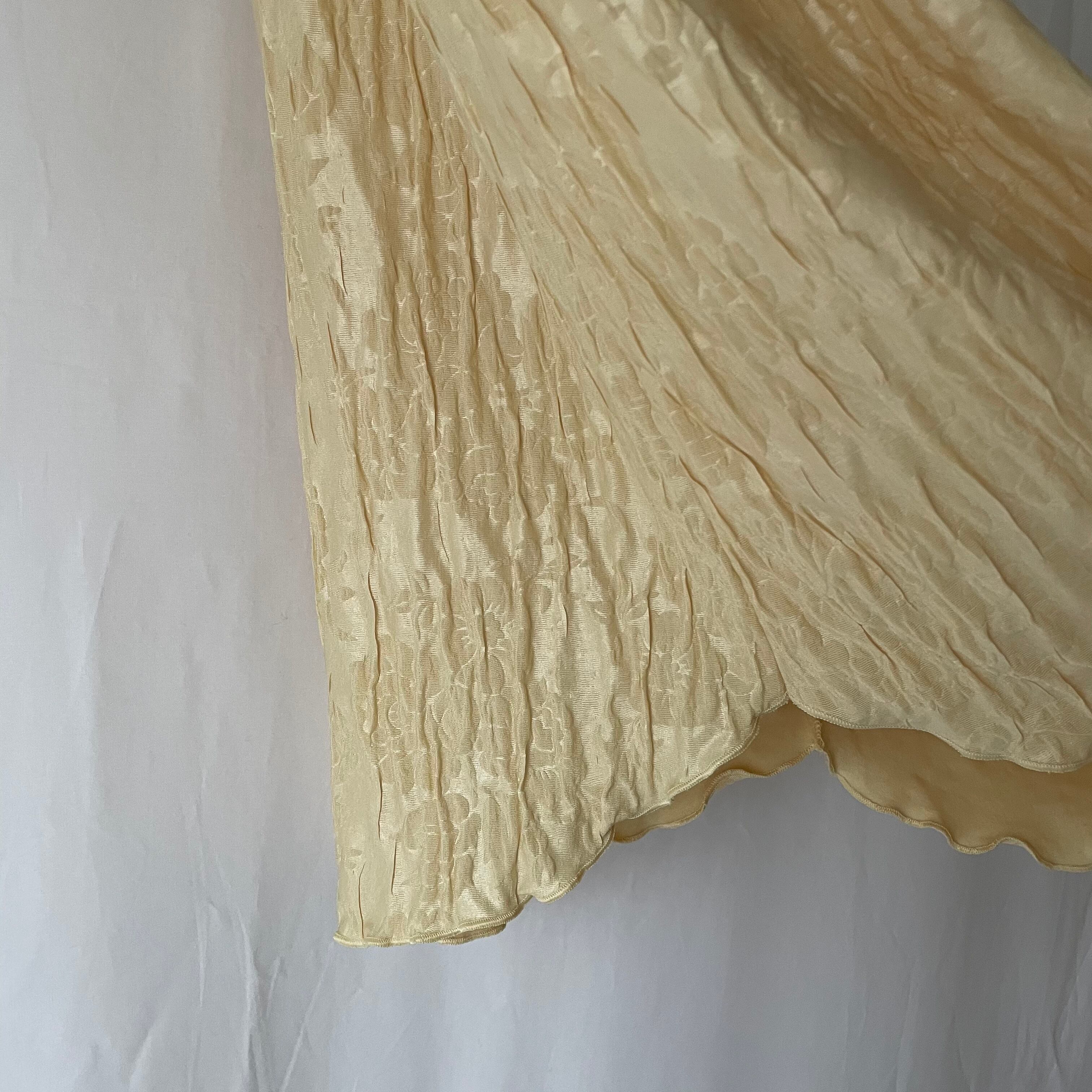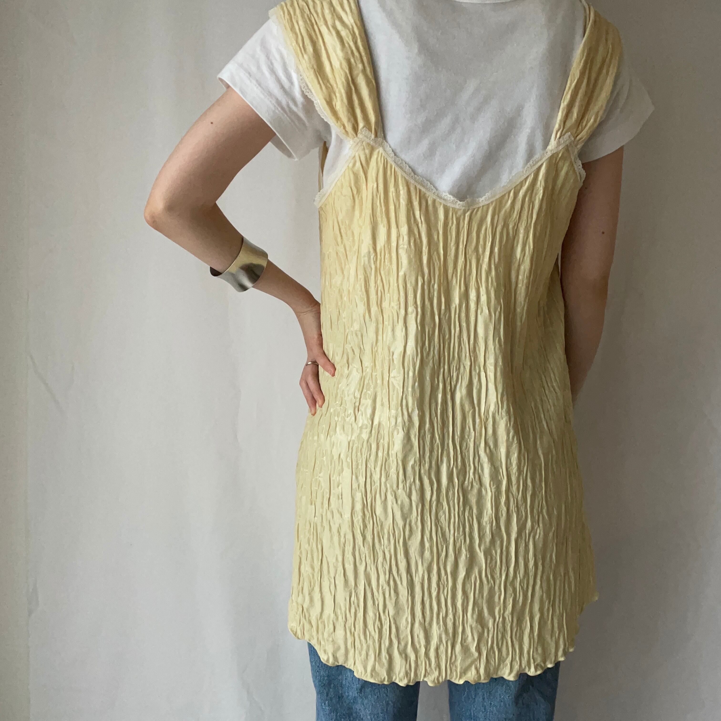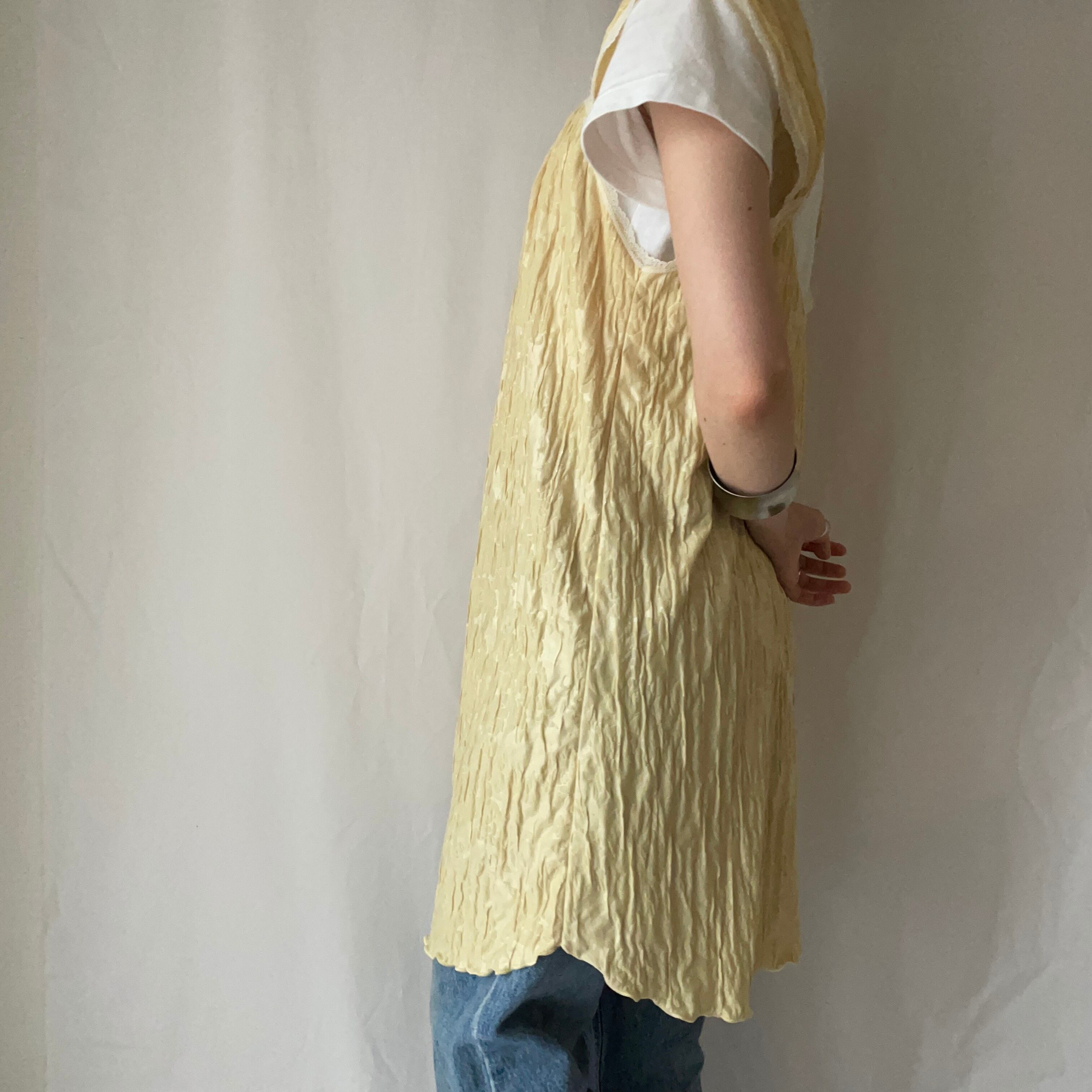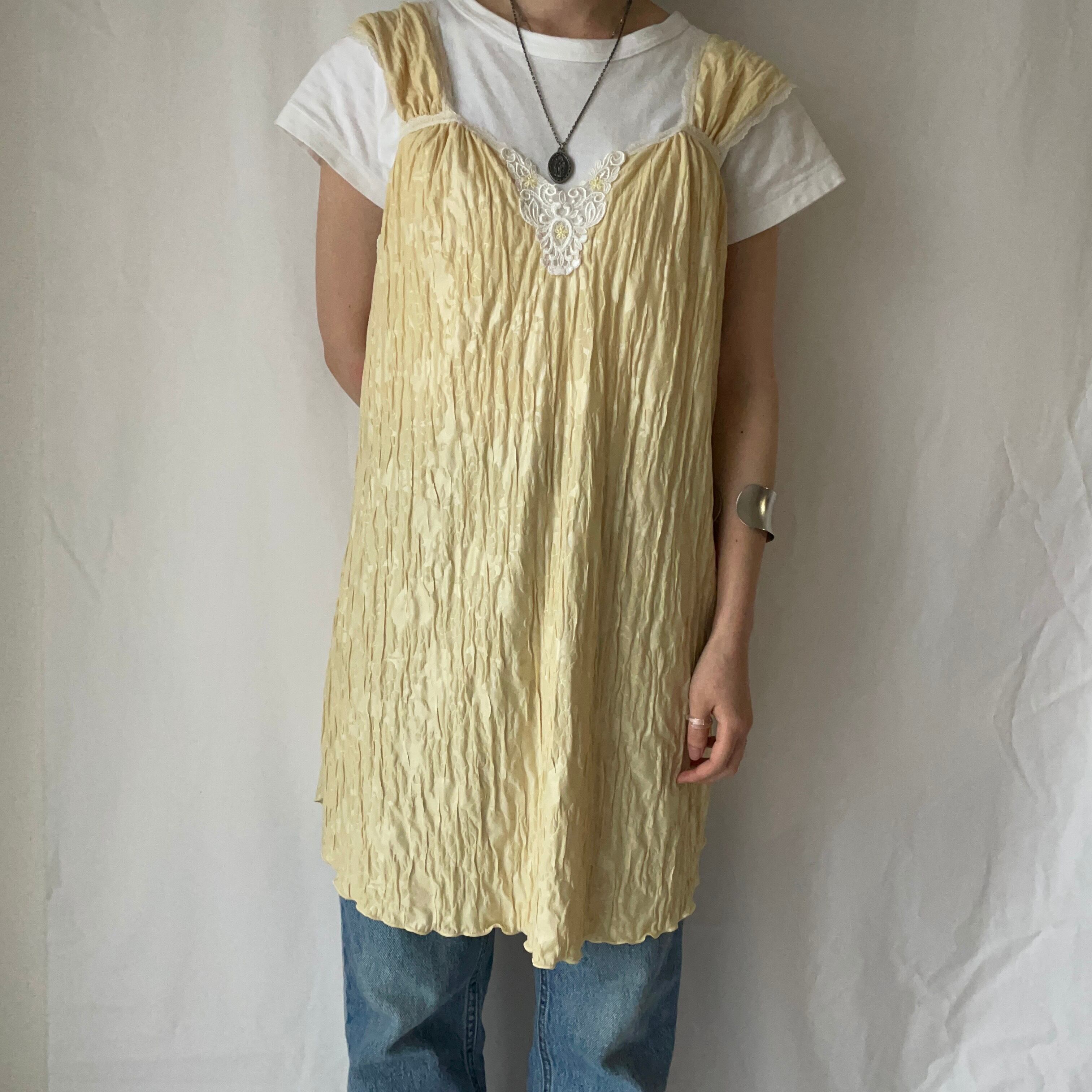 肩や胸部分のレースや、シワ加工の生地感、裾部分がラウンドカットされているなど、ポイントが散りばめられた1枚。