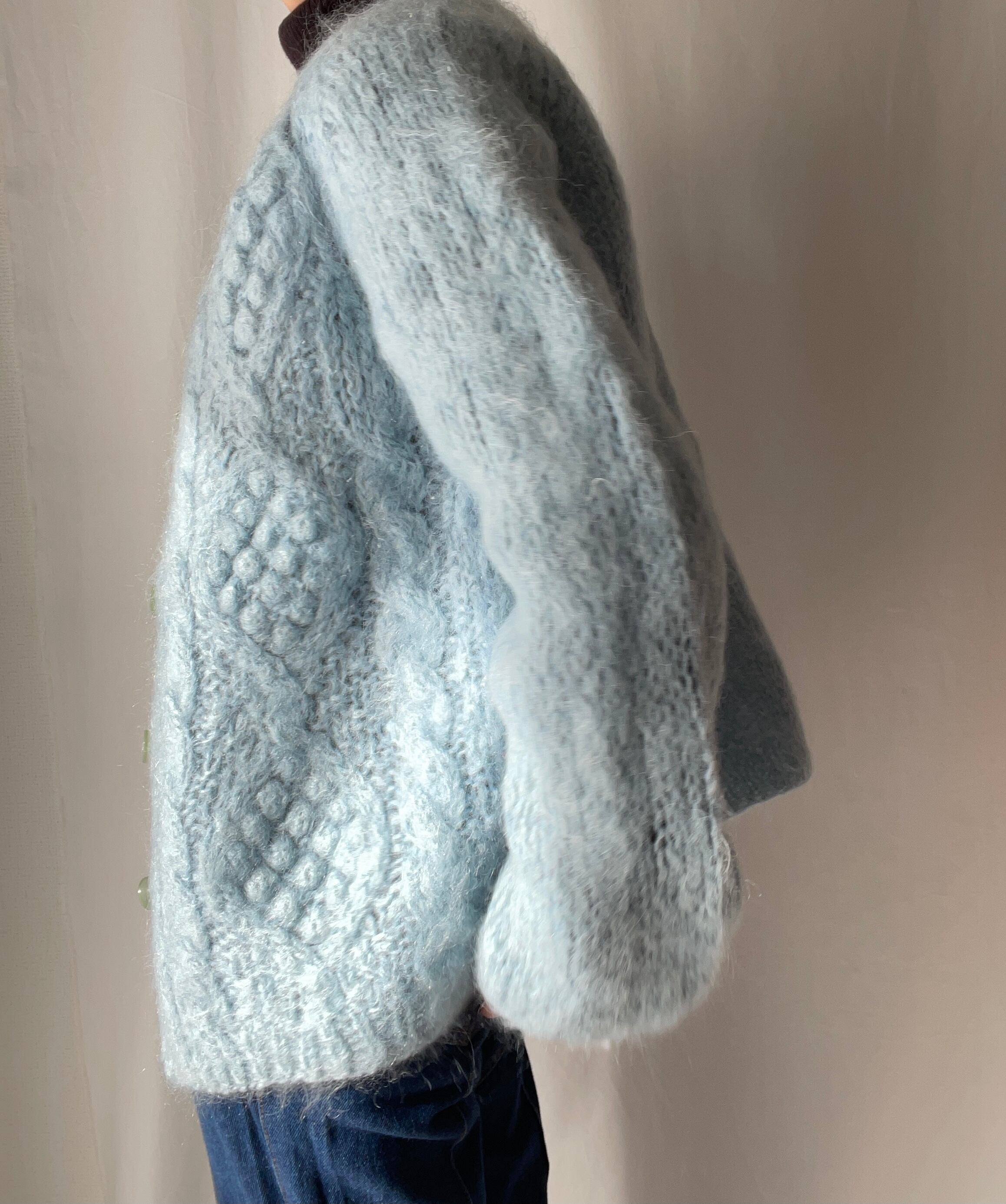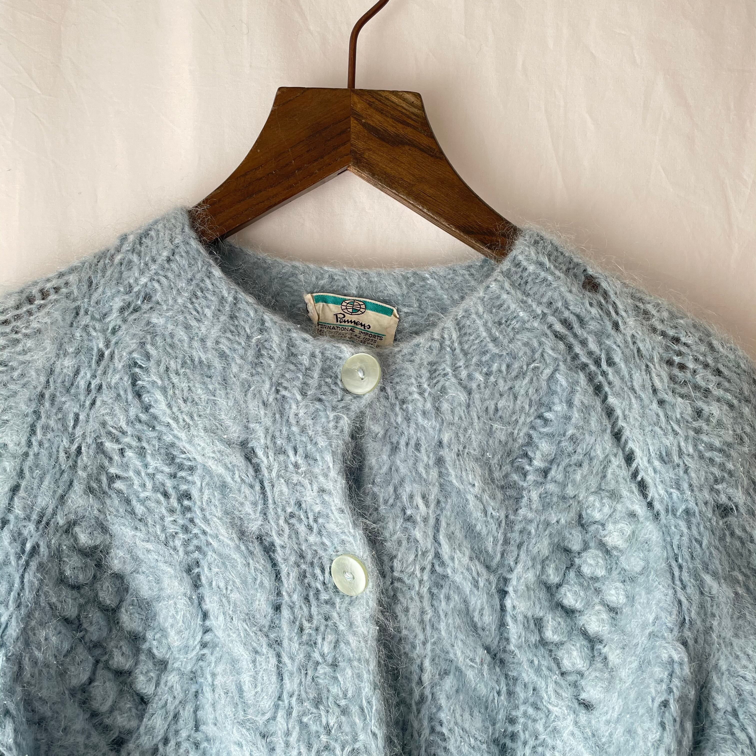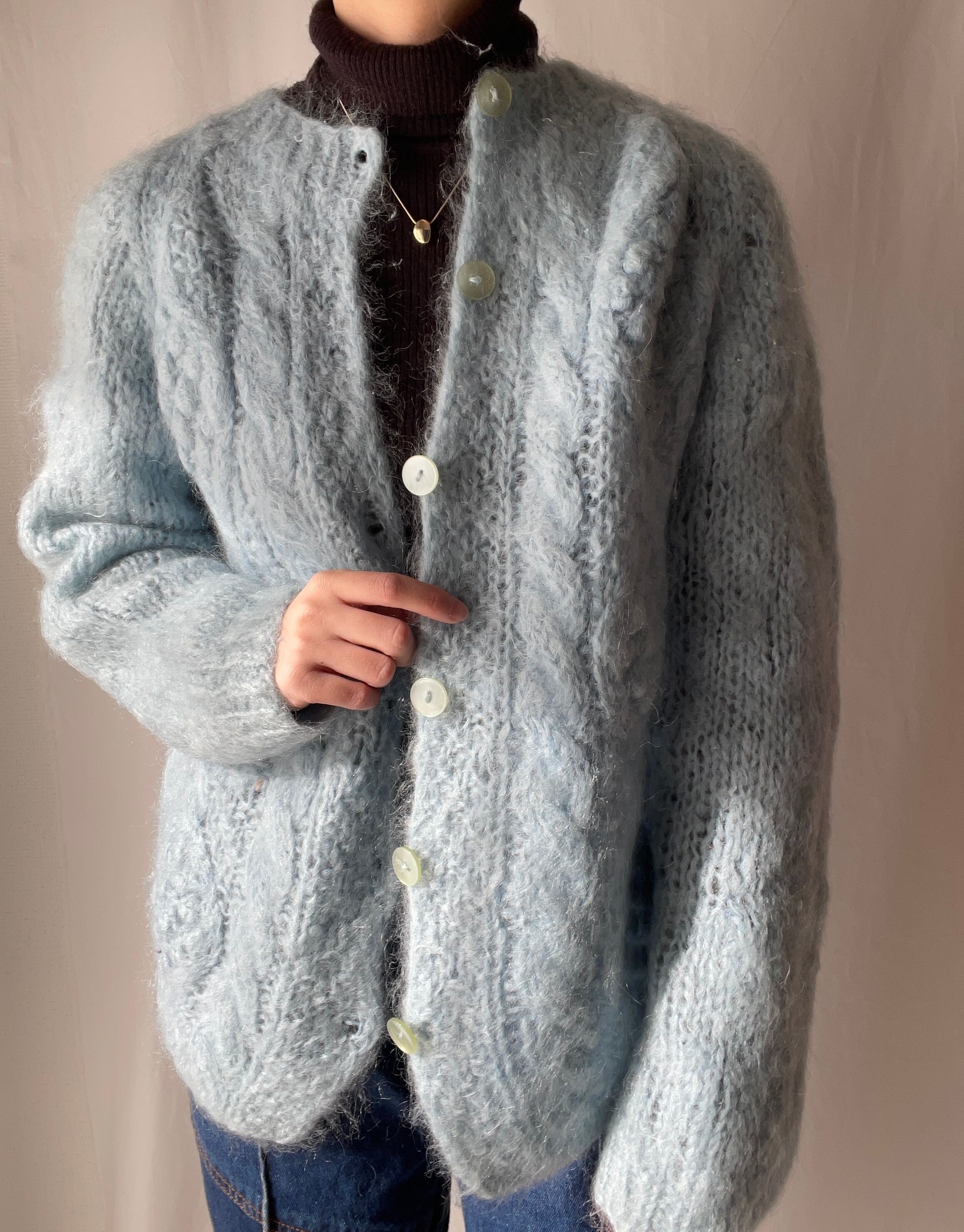 透き通るようなアイスブルーが目を惹くモヘアカーディガン