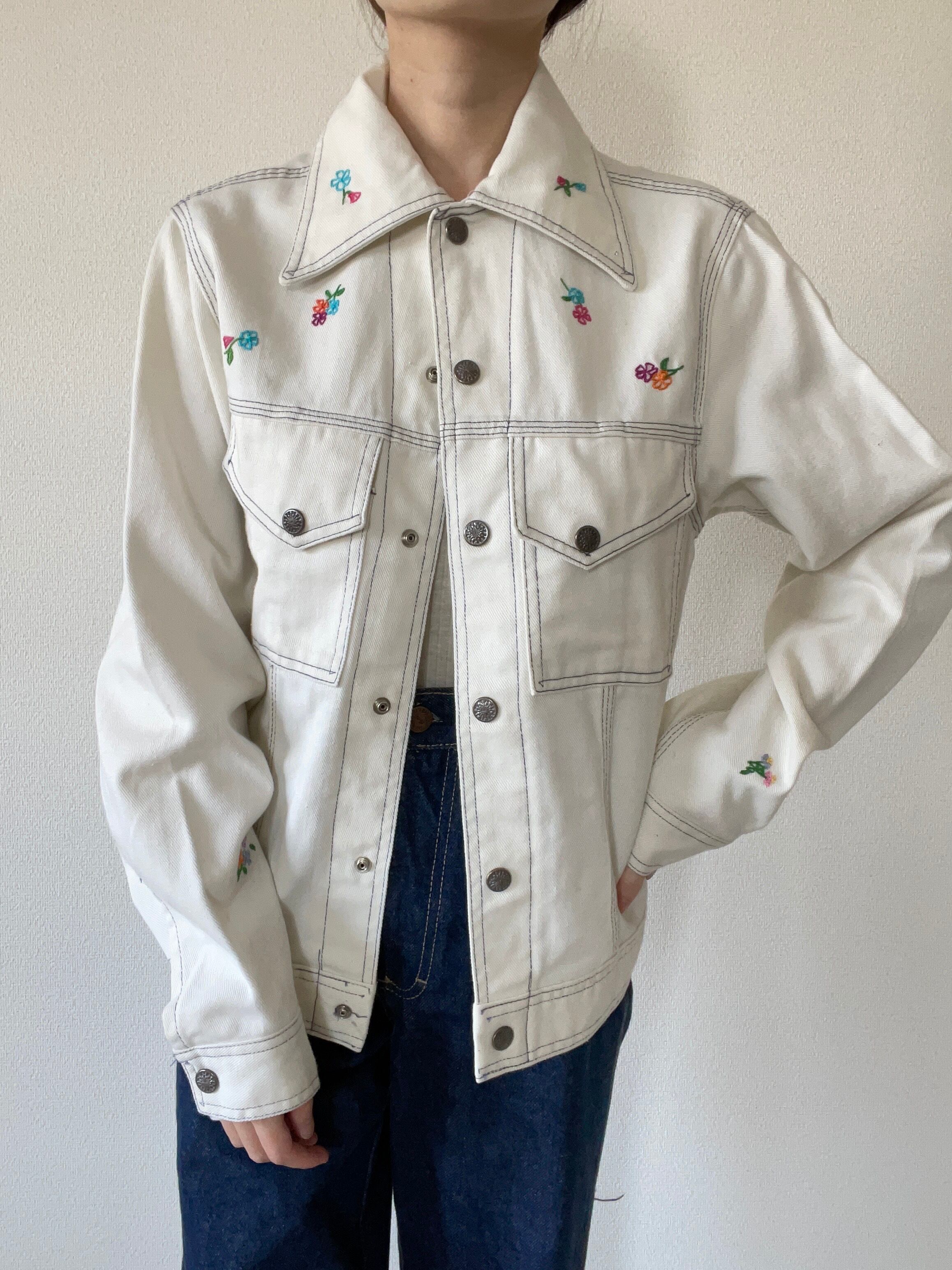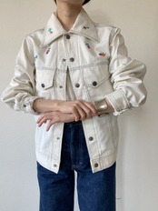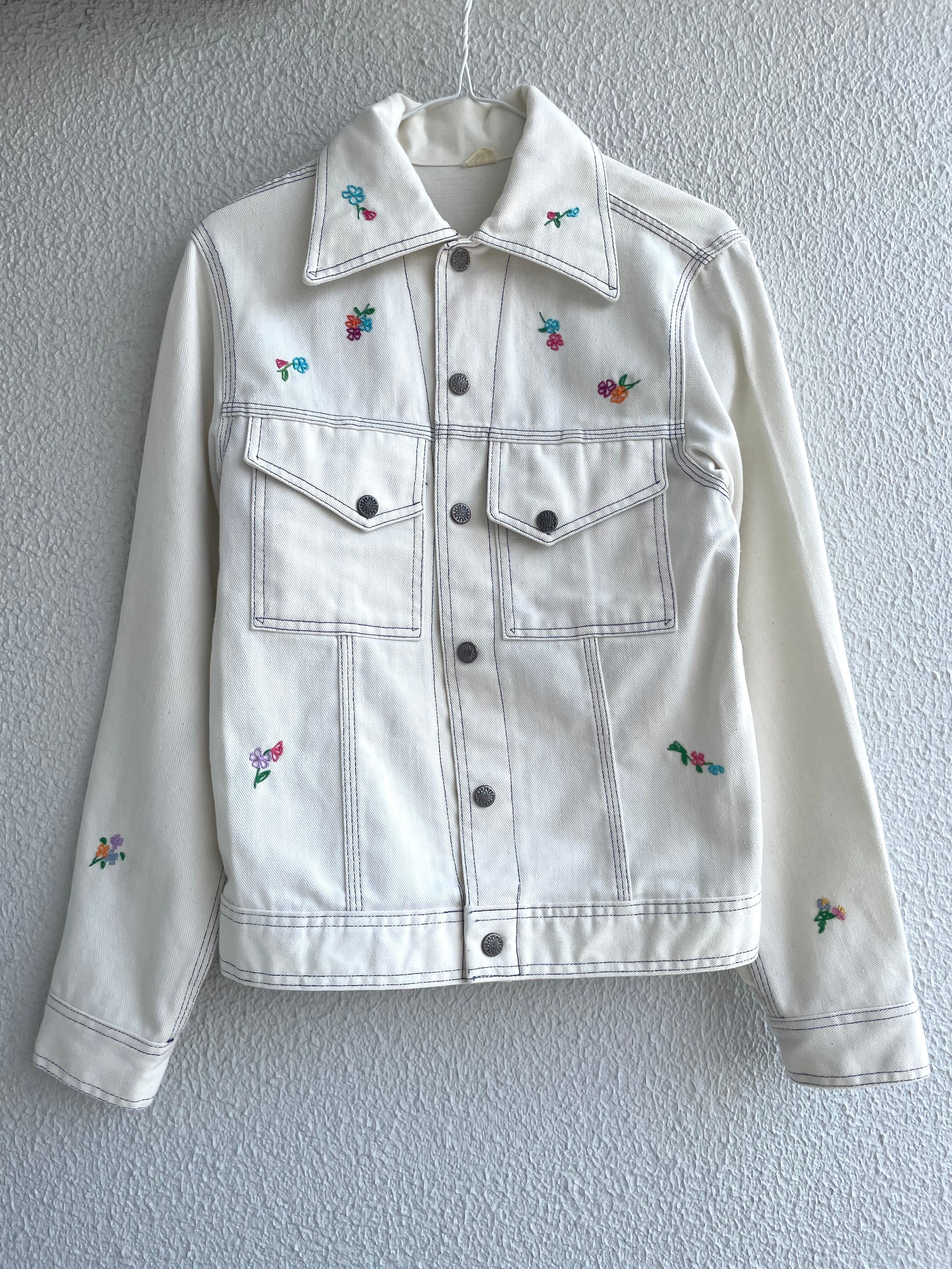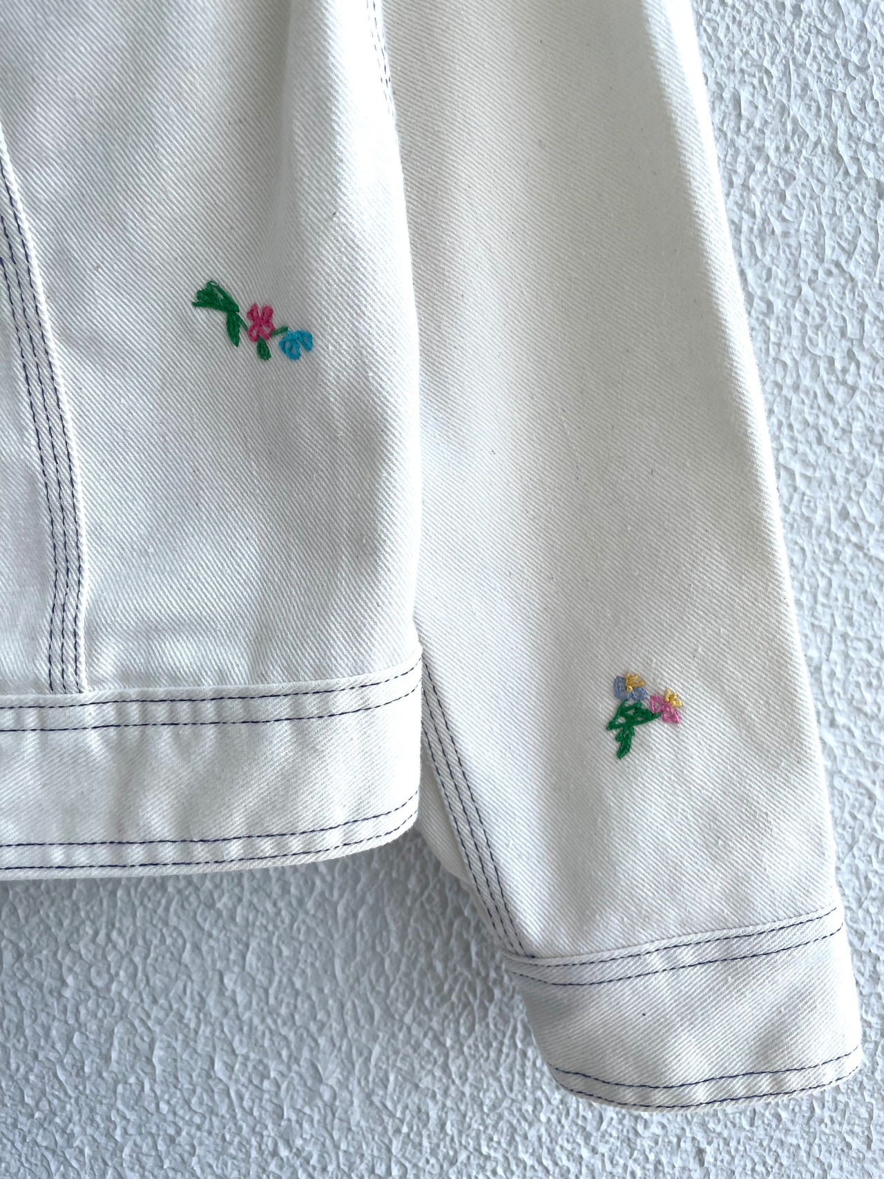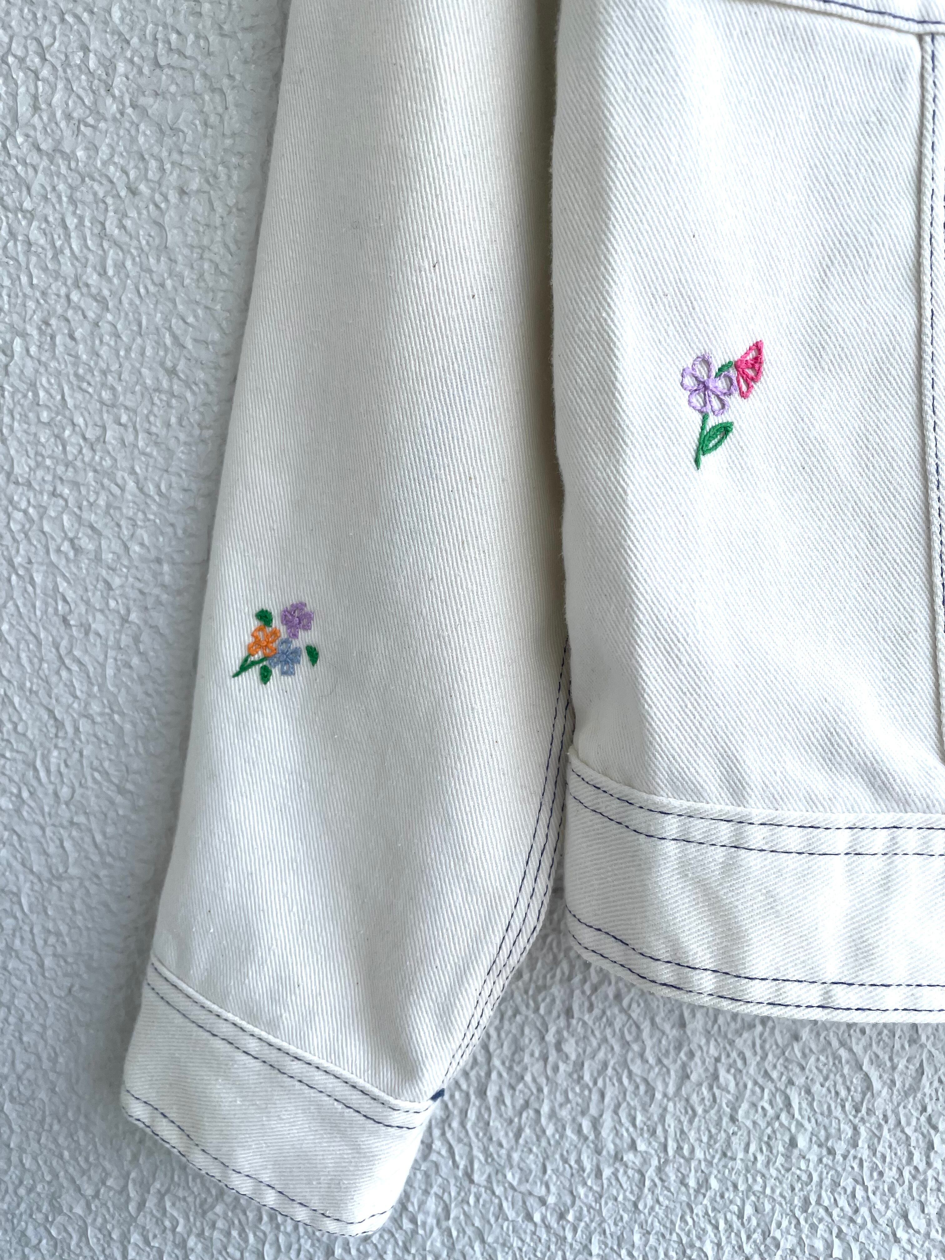 フロントにはお花が散りばめられ、バックには恐竜の刺繍で遊び心満載のデニムジャケット
