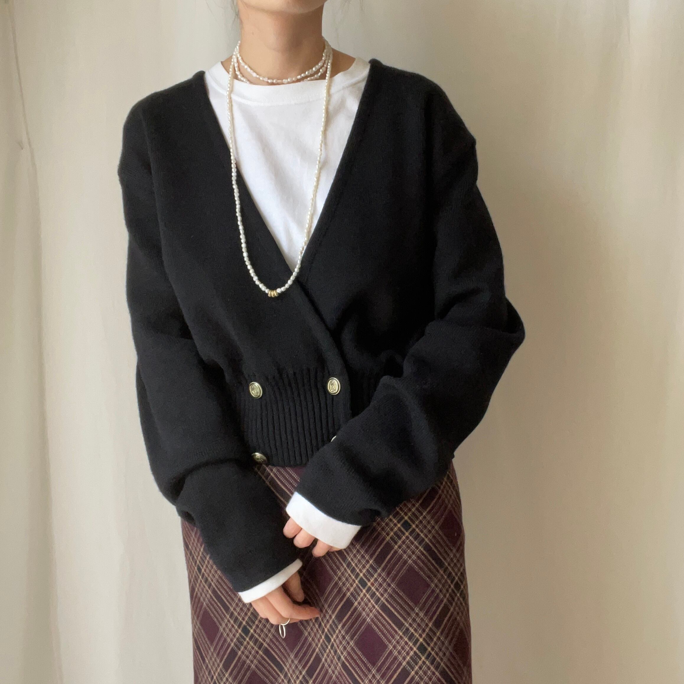 ダブルボタンのデザインとクロップド丈が可愛いカーディガン