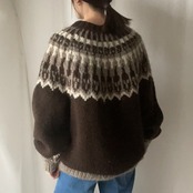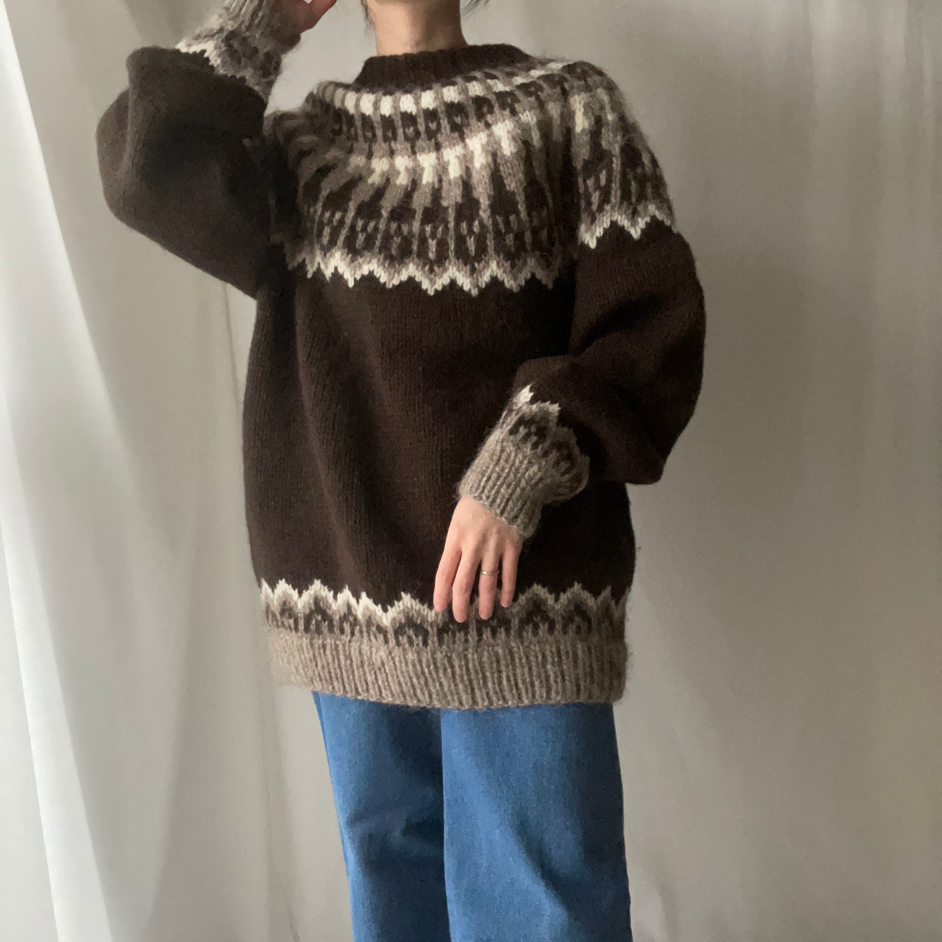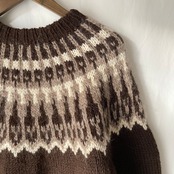 濃いブラウンとベージュの落ち着いた組み合わせのノルディックニット