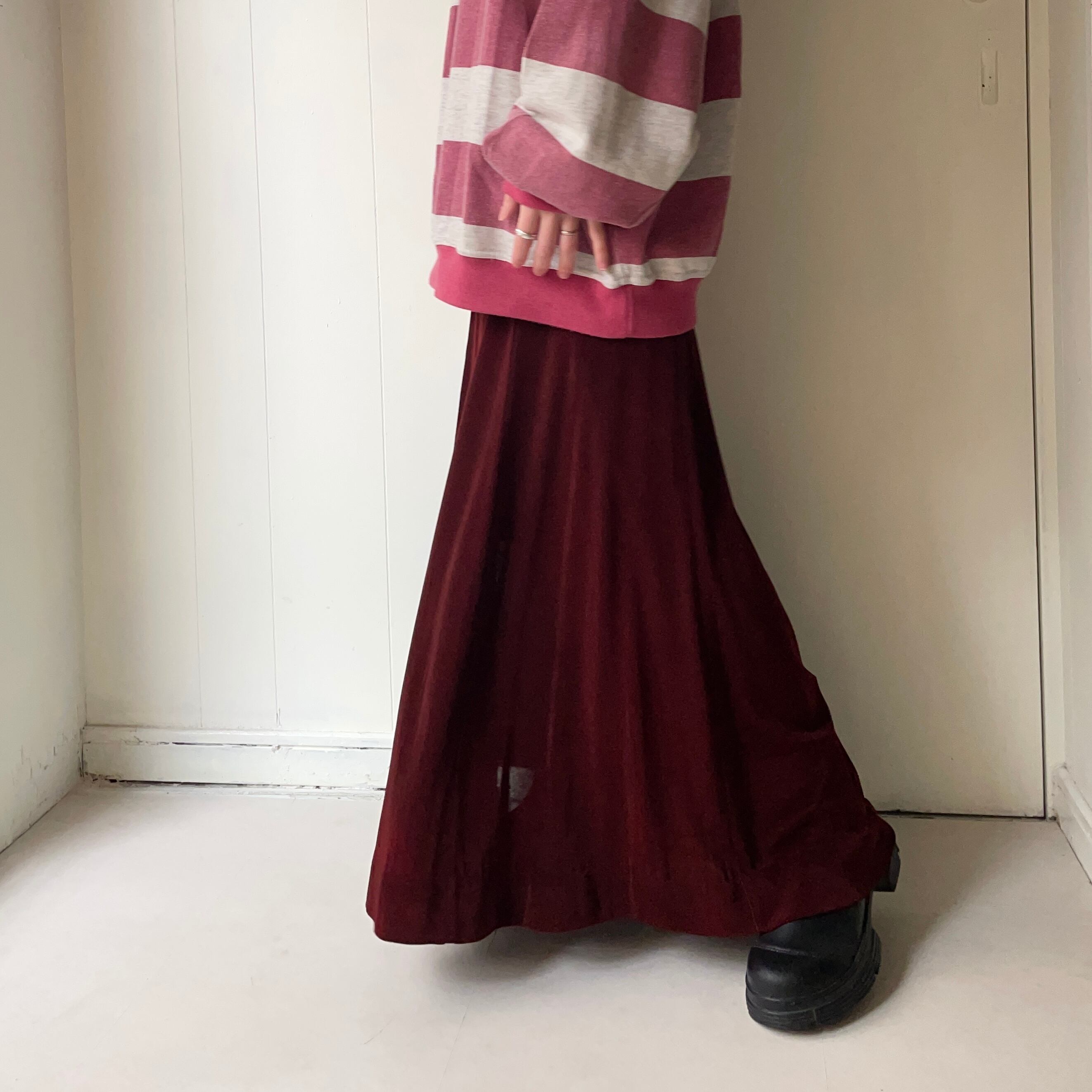 深いワインレッドのお色味がコーディネートを引き締めてくれそうなロングスカート