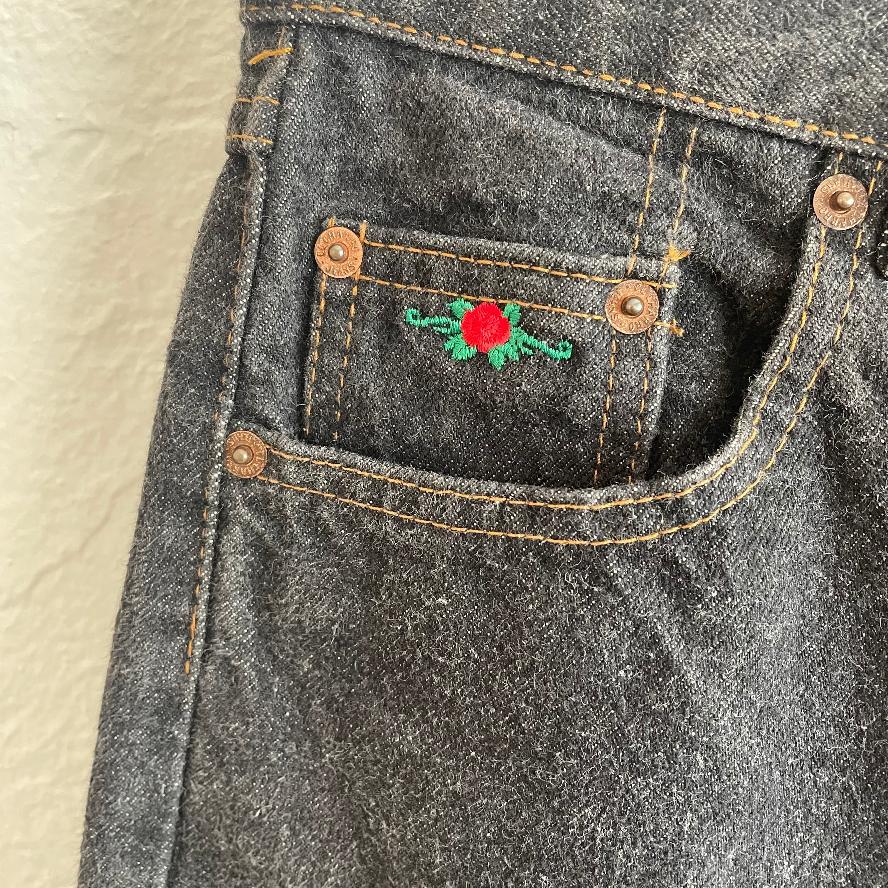 コインポケットに施されたバラのような刺繍や、LEVI’S501のようなボタンフライのデザイン等もオススメの1枚です