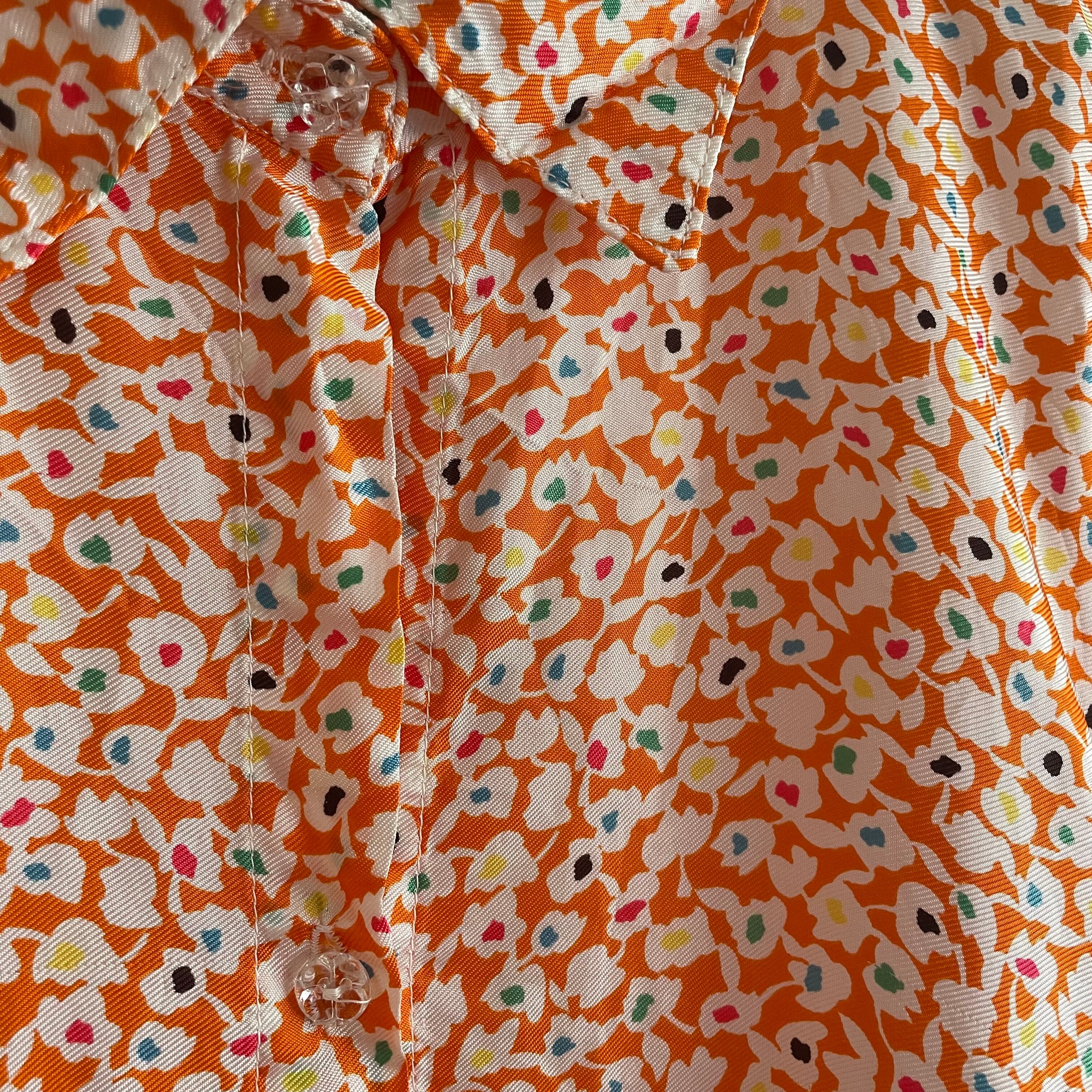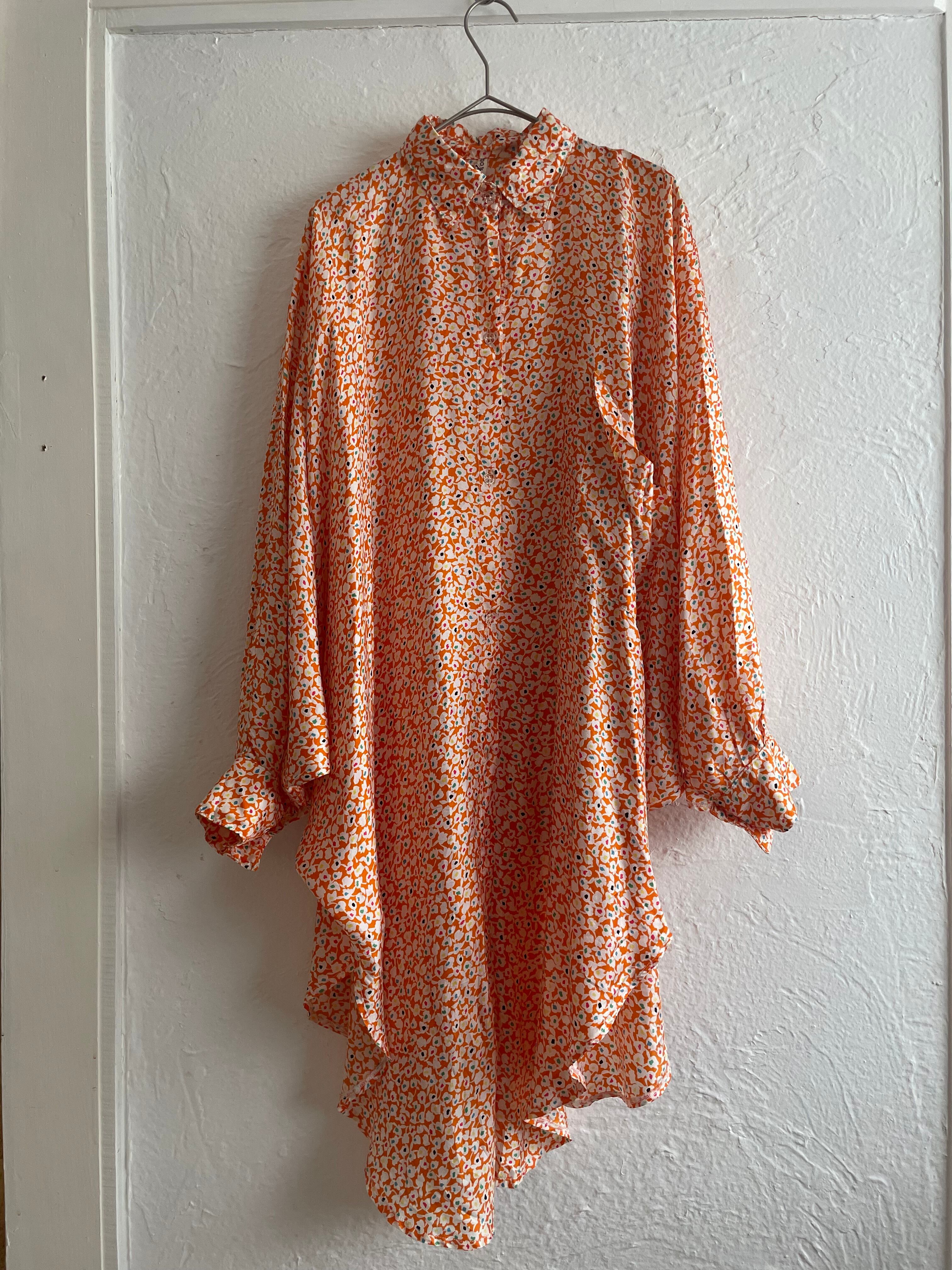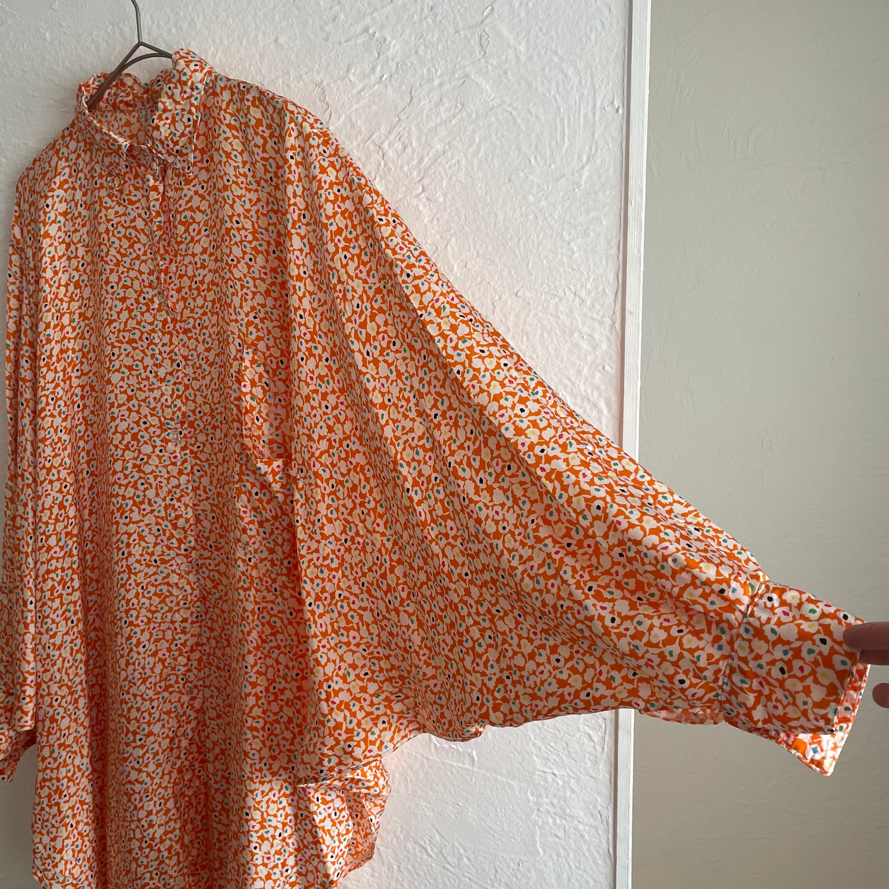 とろりとしたビスコースのお素材に、透明のビーズのようなボタンや、よく見るとカラフルなお花柄など可愛いポイントがたくさん詰まった1枚です
