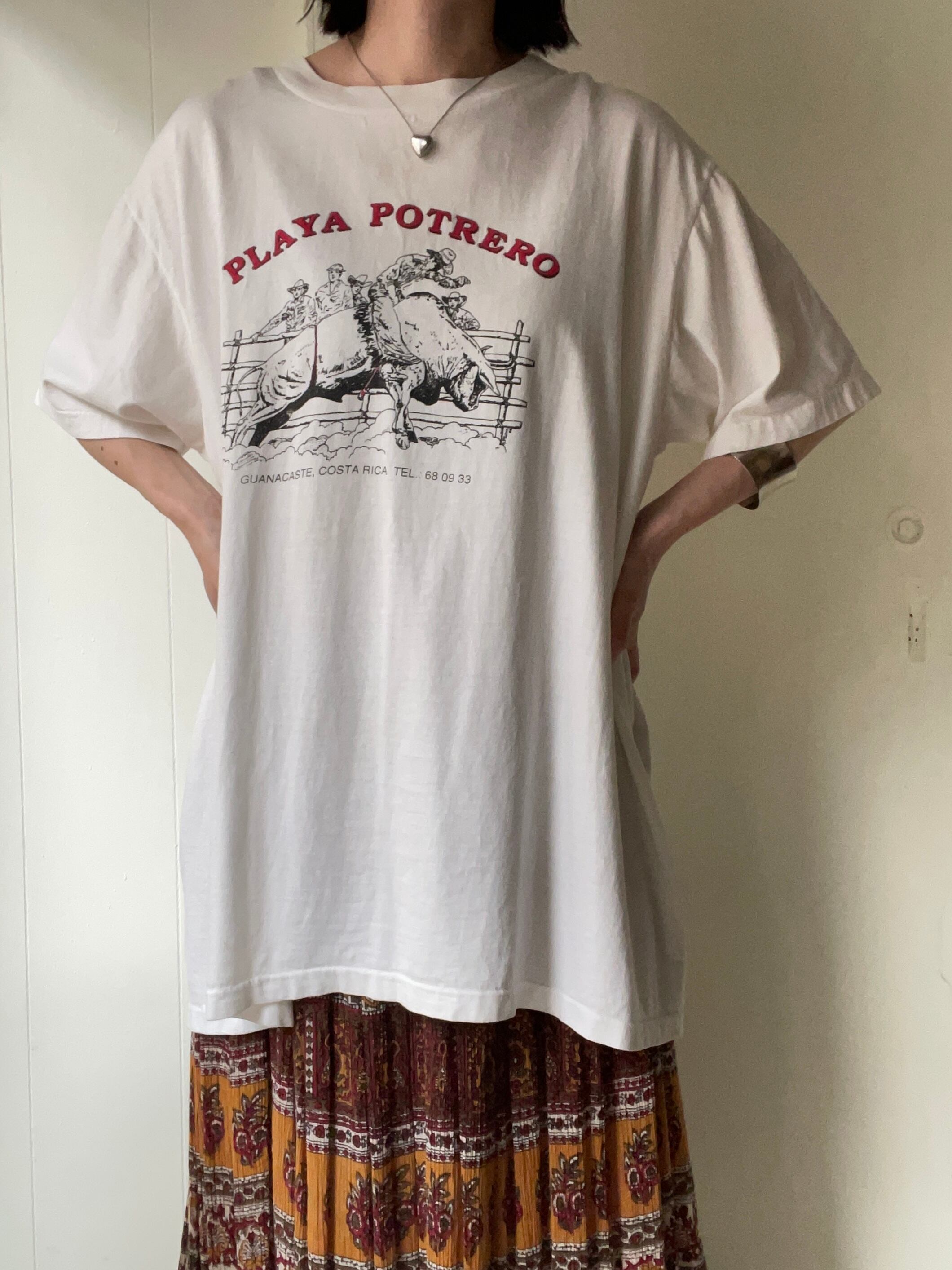 前後に大判のプリント入りでコーディネートが決まる1枚です