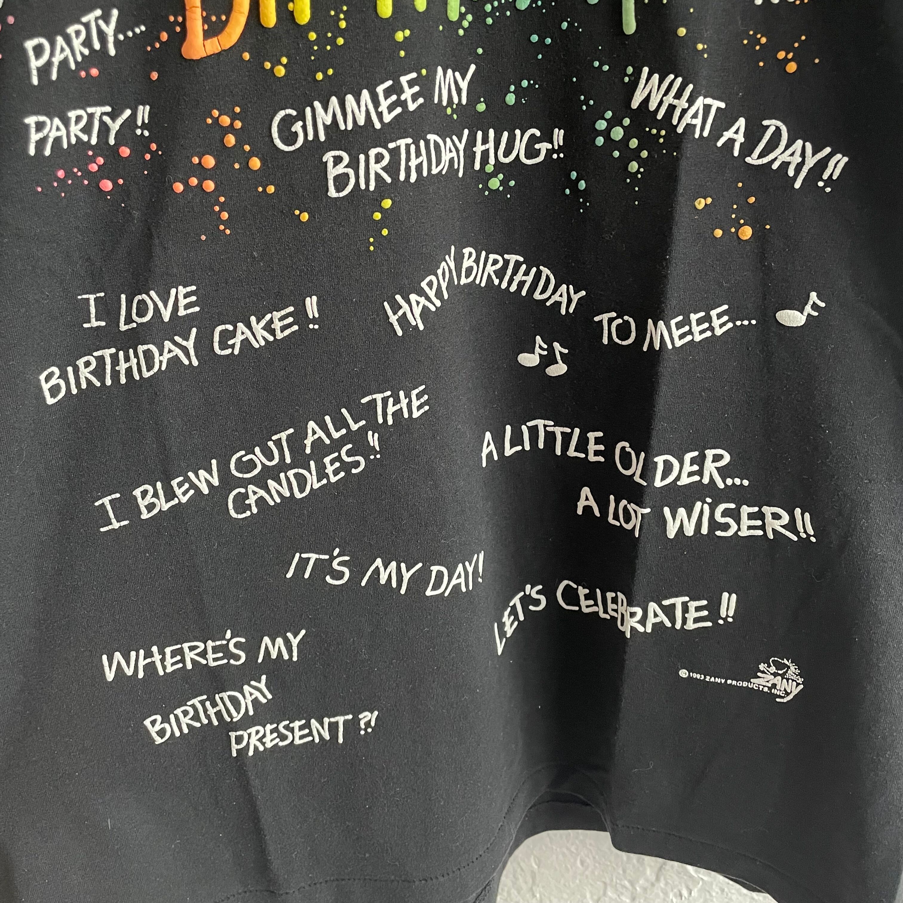 色々なお誕生日あるある?がプリントされたTシャツです