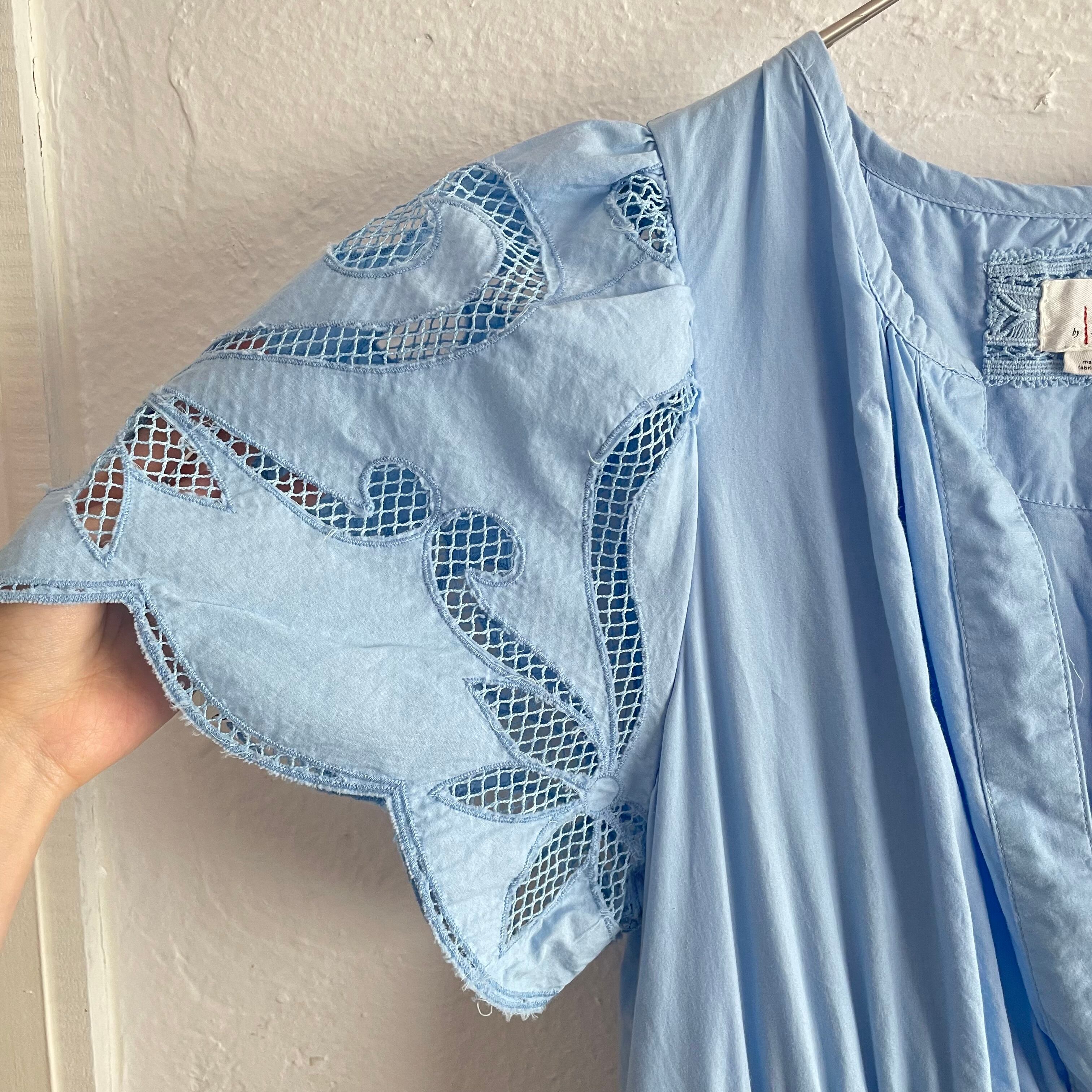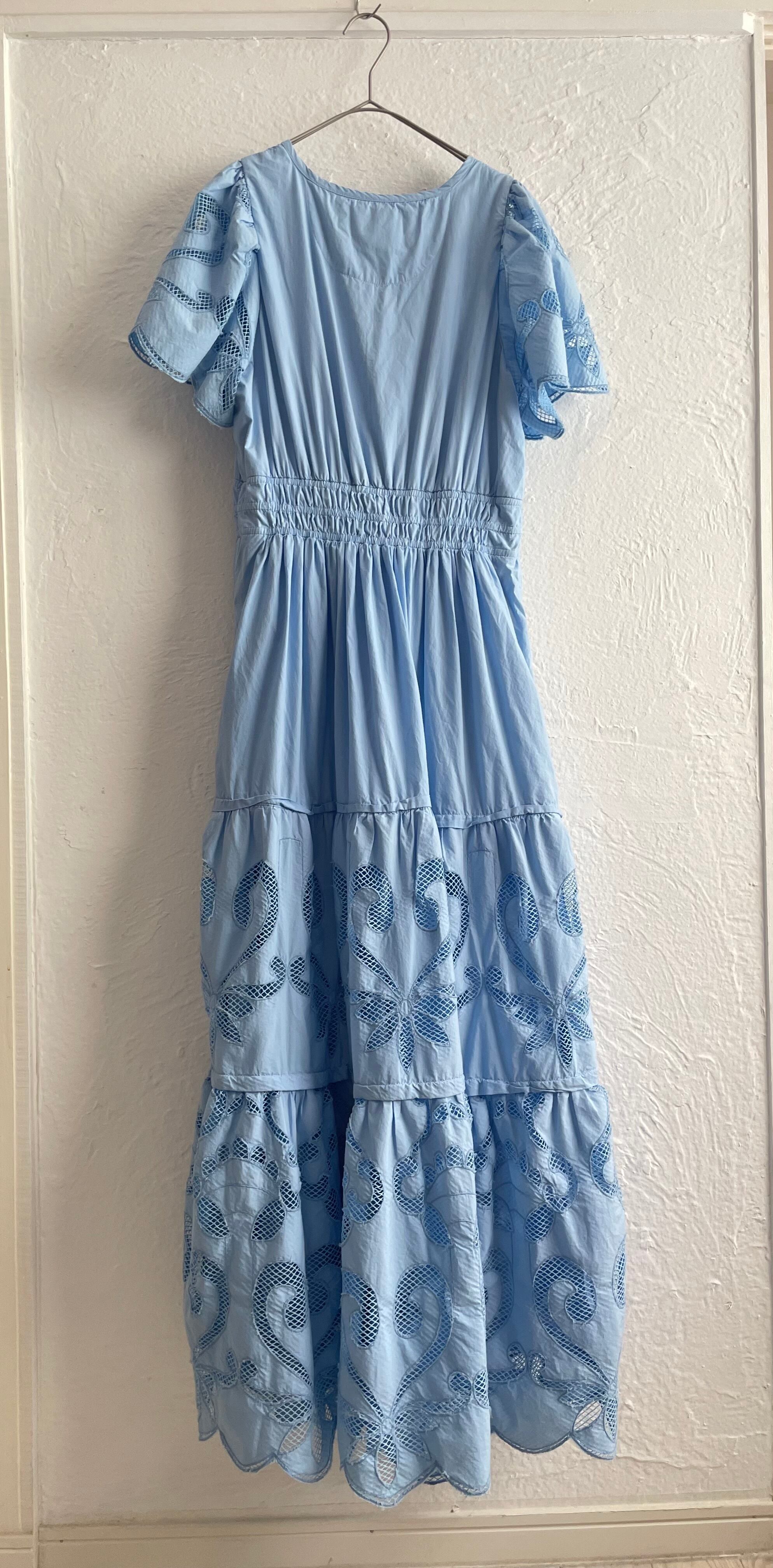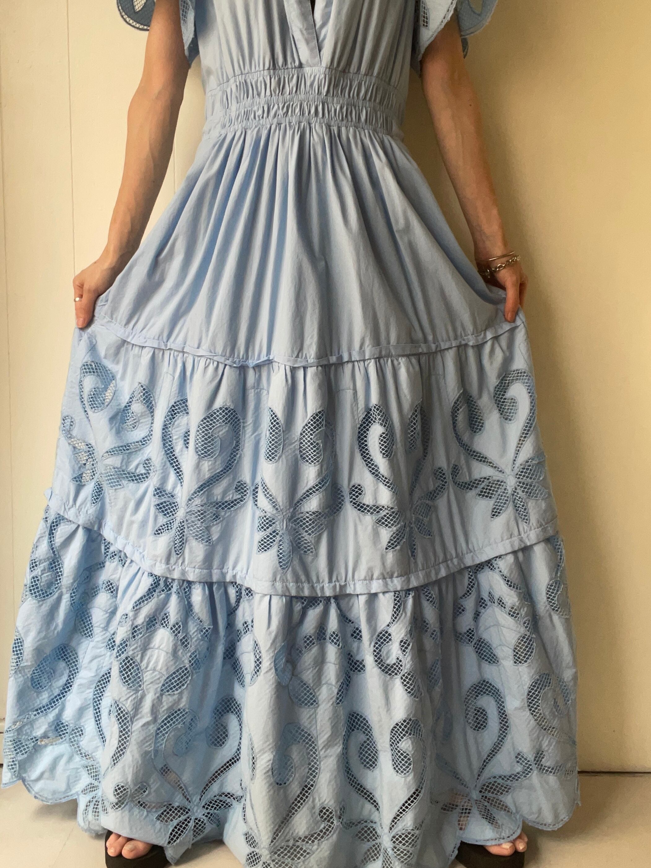 パステルブルーのお色味と、ティアードスカートボリュームのあるAラインシルエットがプリンセスのような雰囲気のワンピース