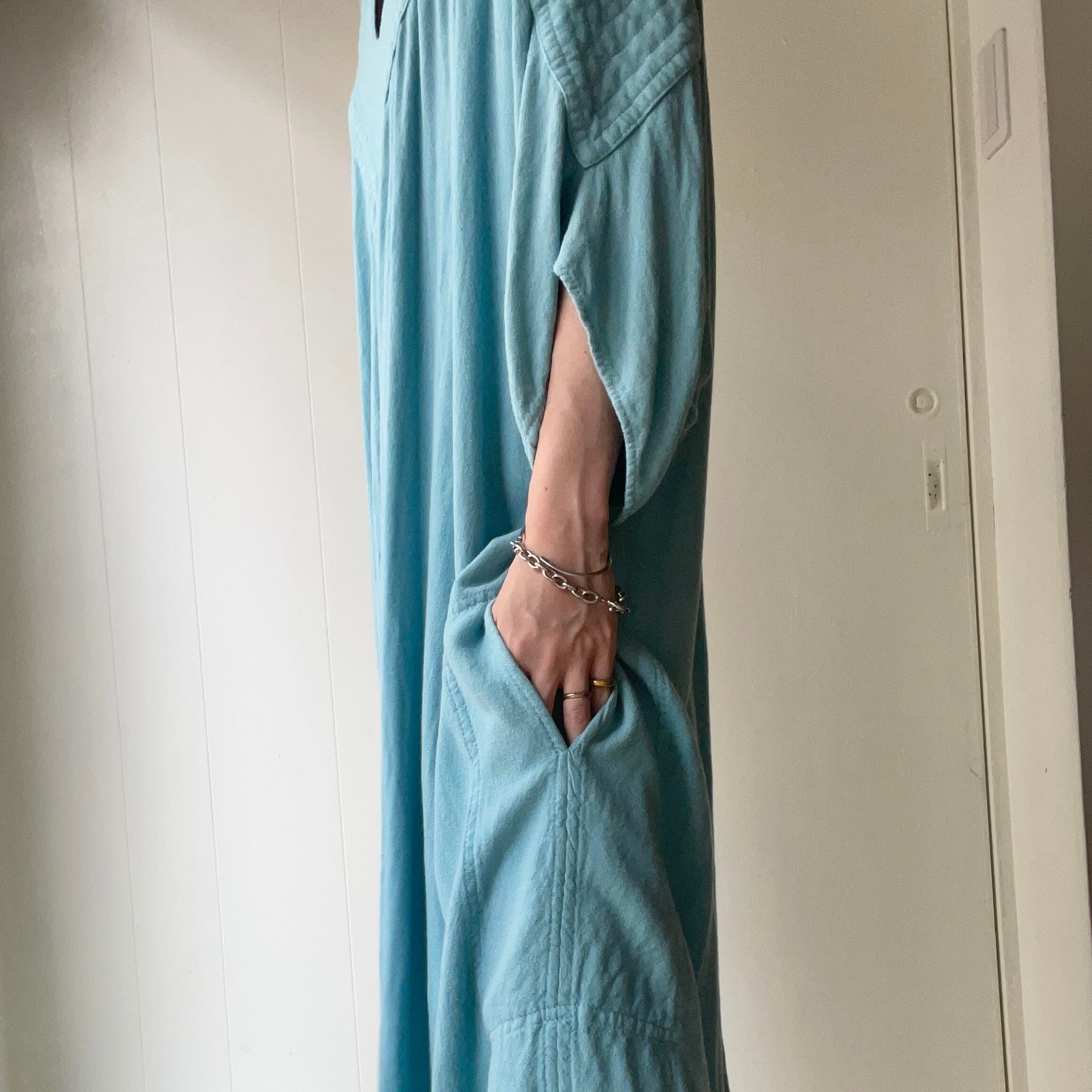 たっぷりの生地をつかったゆったりとしたサイズ感で、裏地なしの透け感なしの1枚なので、これ1枚ばさっと着てサンダルで外に出かけたくなるくらい楽ちんなワンピースです ◎