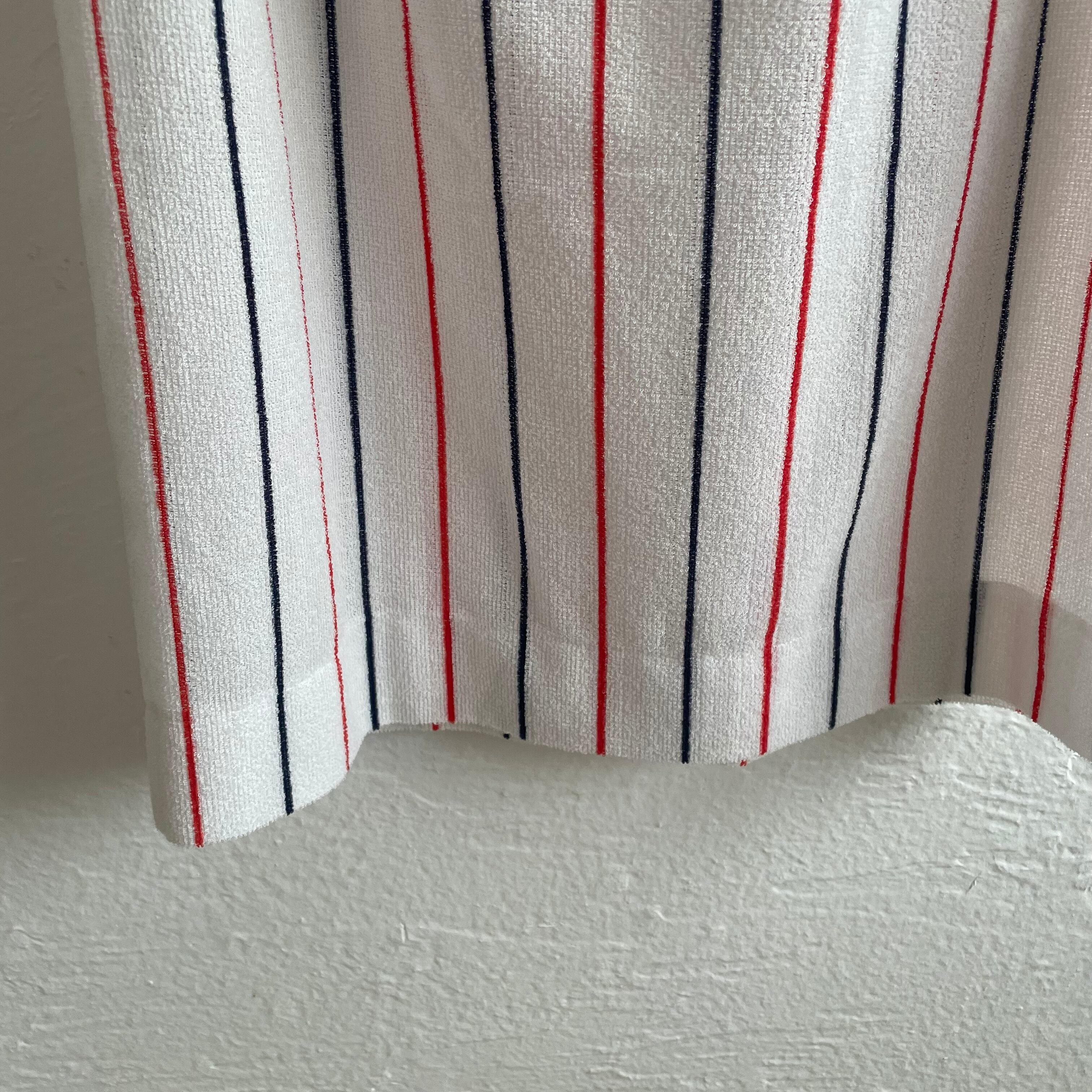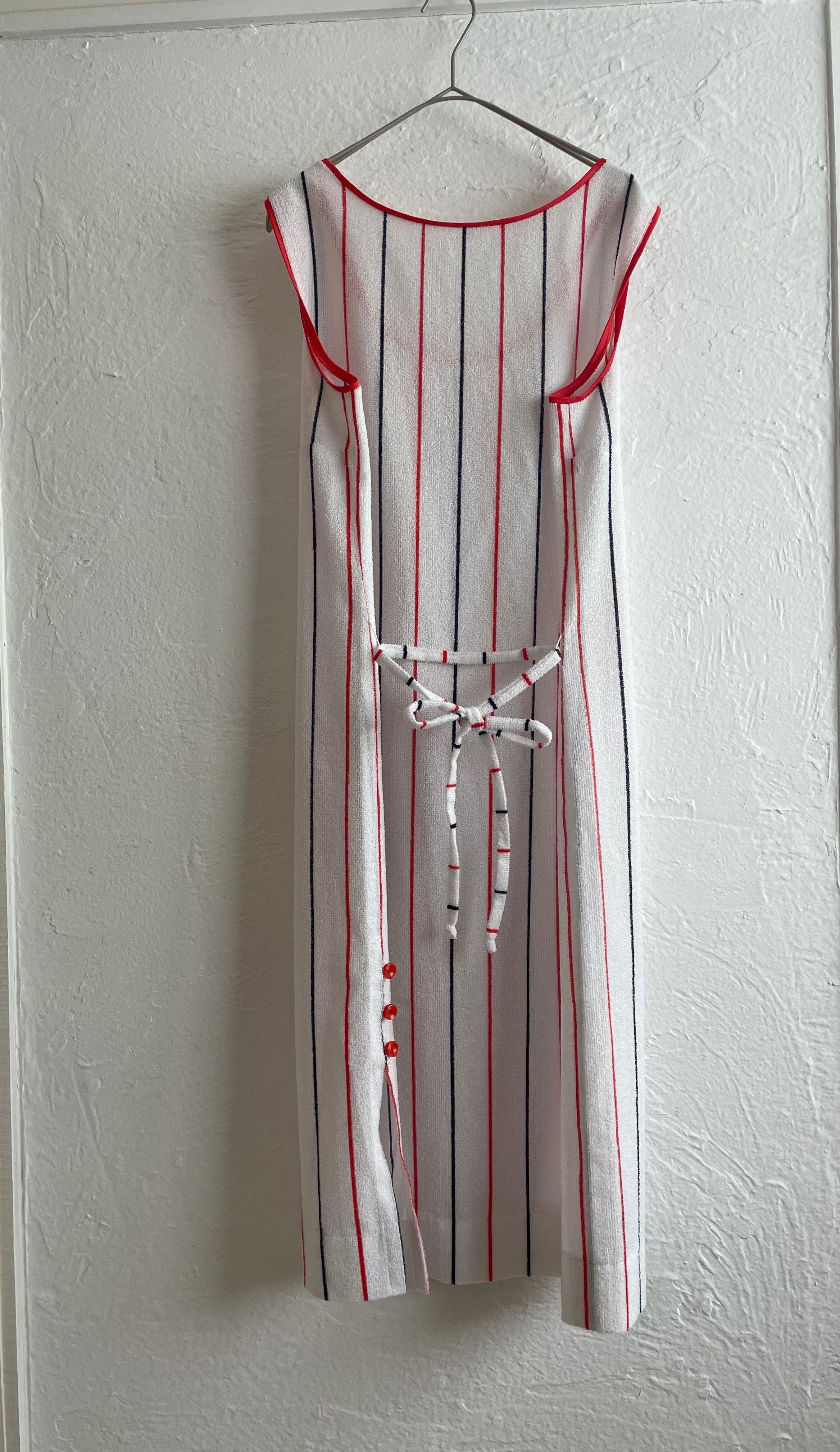 こちらは襟ぐり、腕ぐりのパイピングやプラスチックのボタンがレトロで可愛いのがポイント