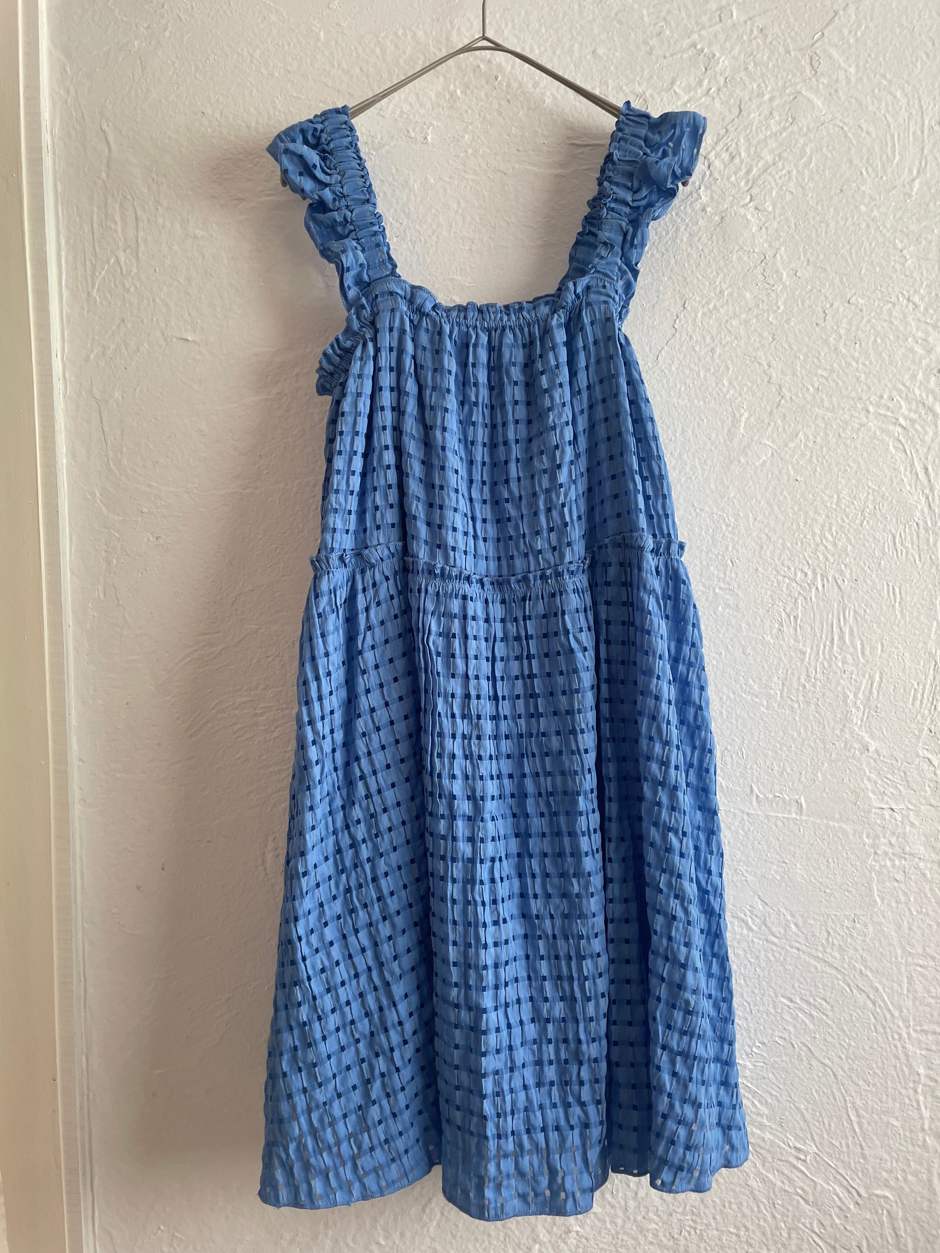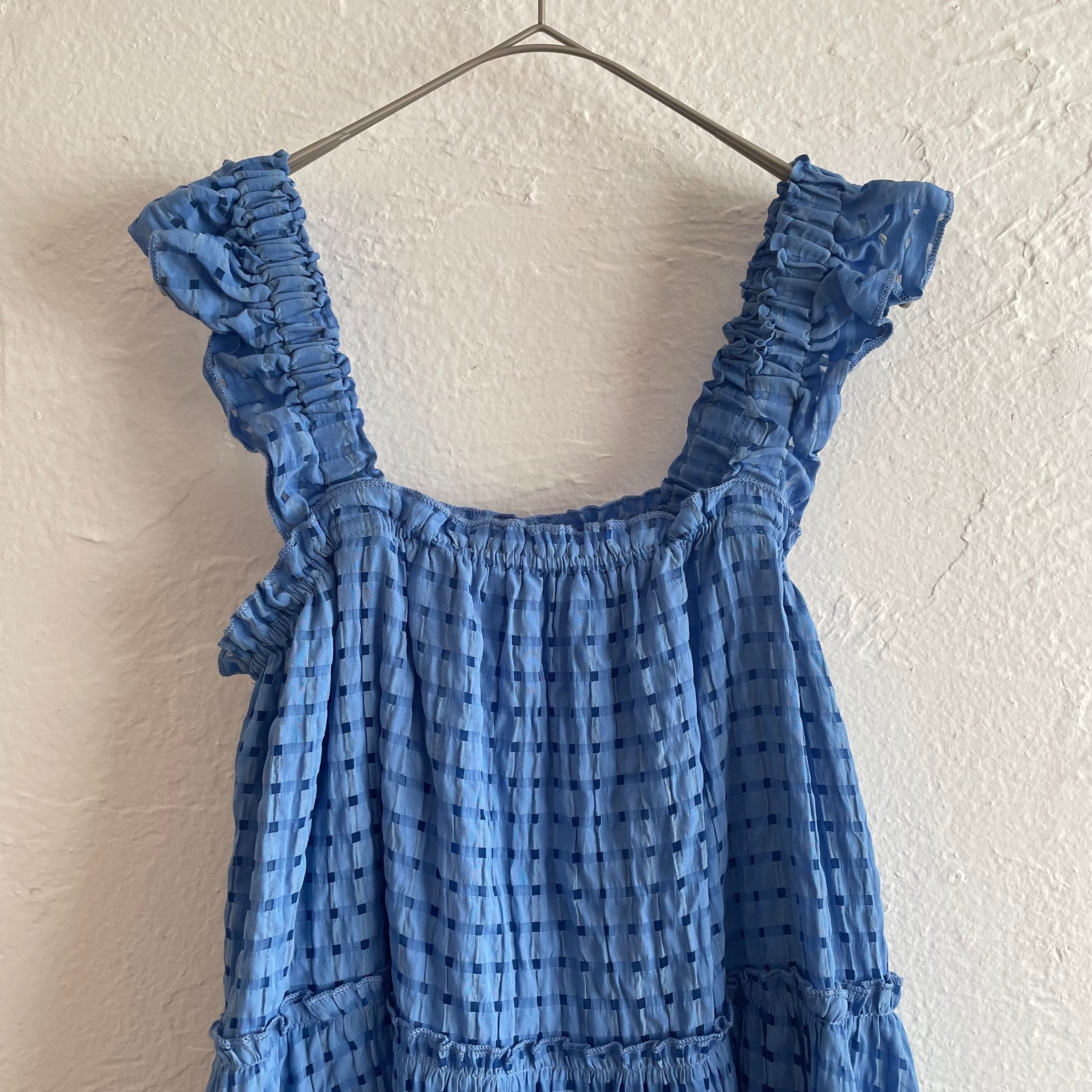 大人っぽいロイヤルブルーのお色味と、ふりふりとしたデザインのミックスが可愛いミニワンピ