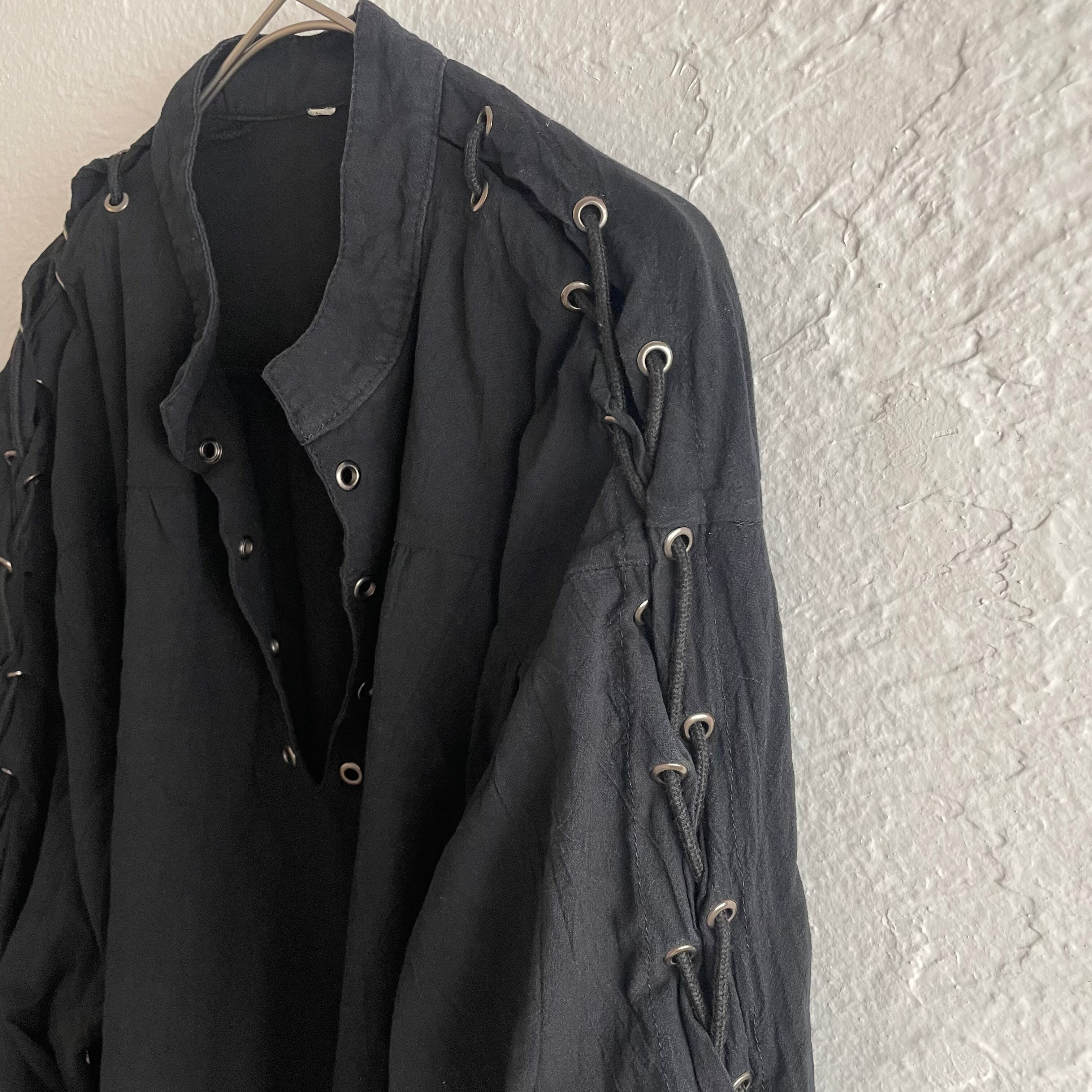 胸元、袖がレースアップデザインの1枚でコーディネートが決まる主役ブラウスです