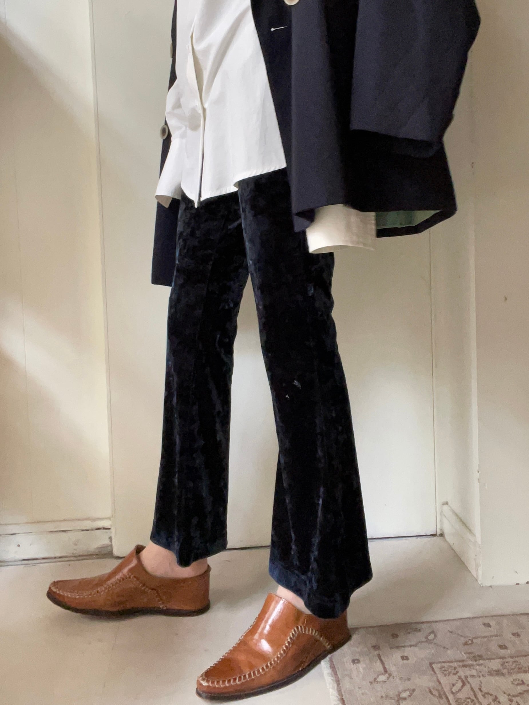 くるぶしが見えるくらいのスッキリとした丈感のパンツ