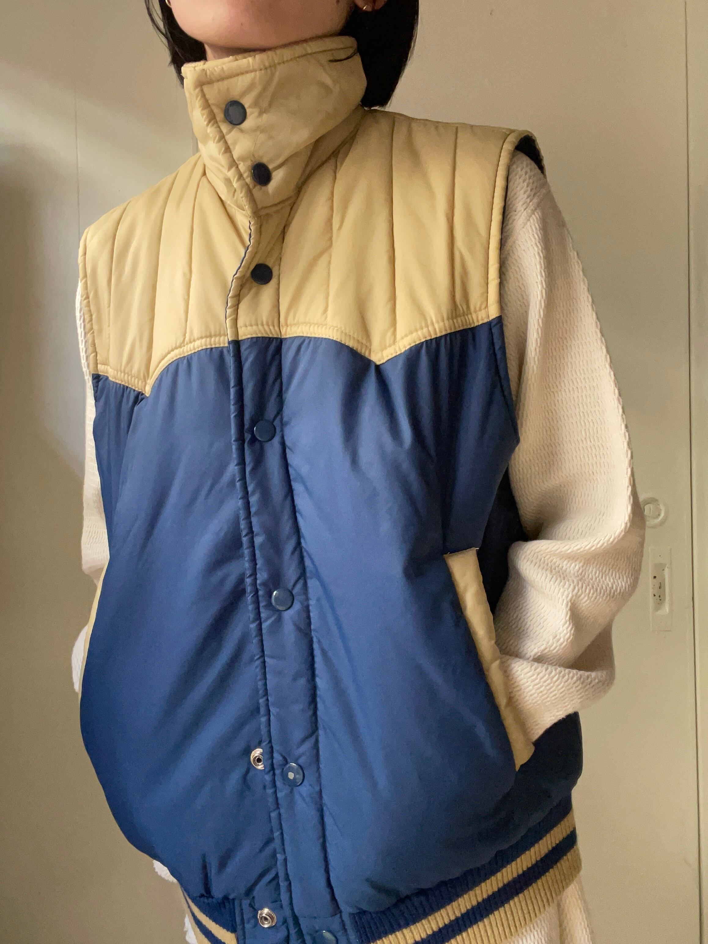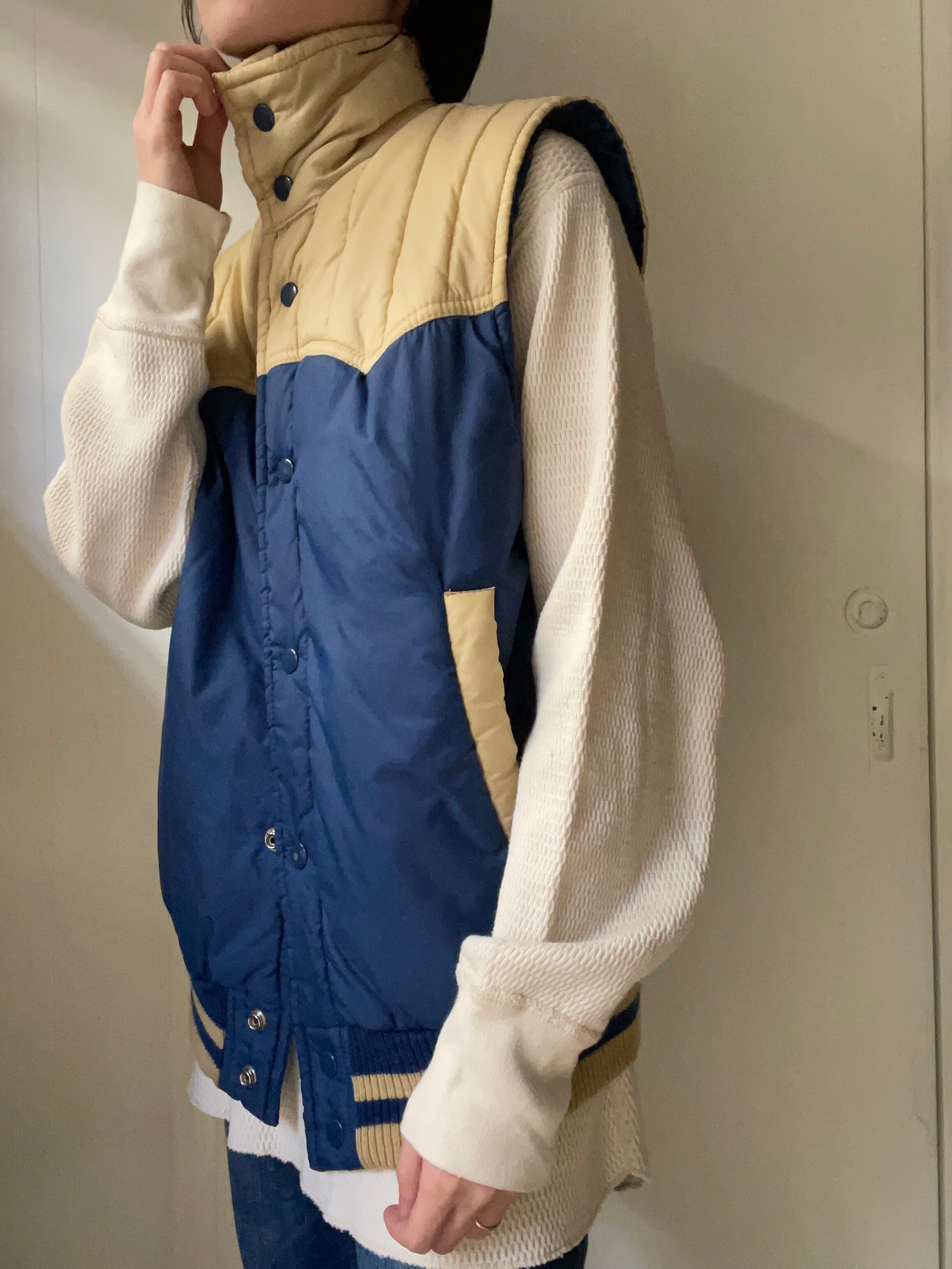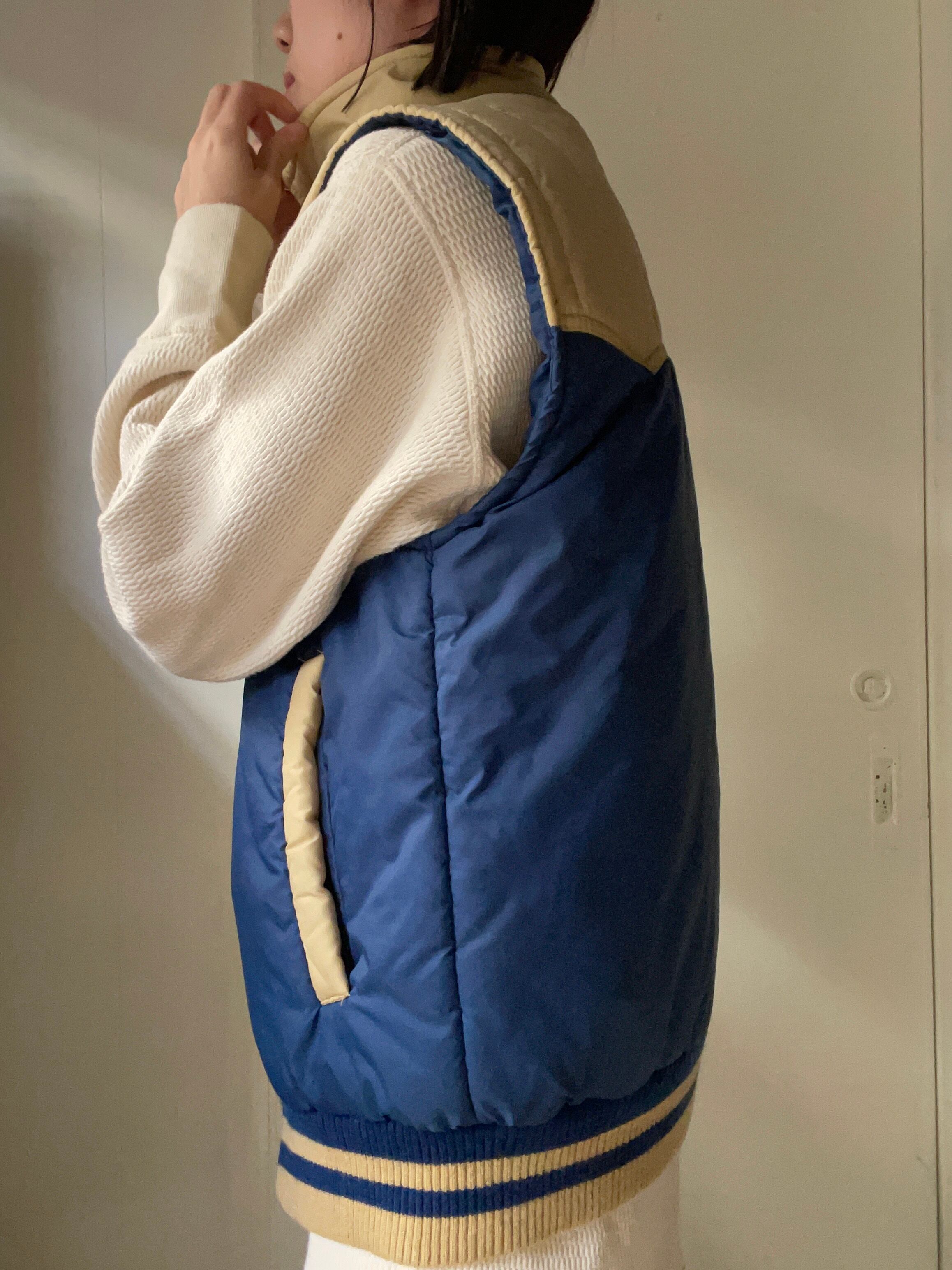 ベージュ×ブルーの配色が可愛いダウンベスト