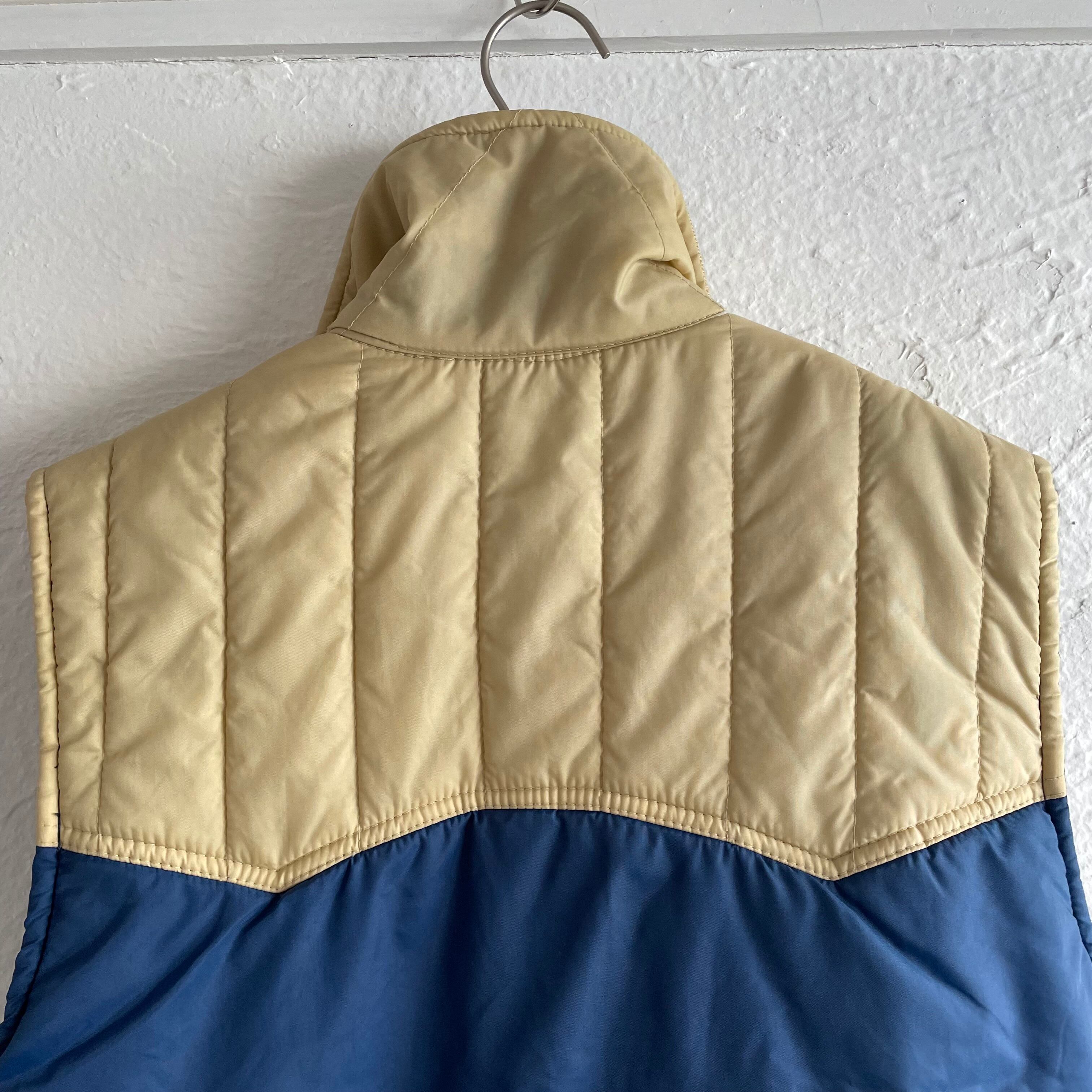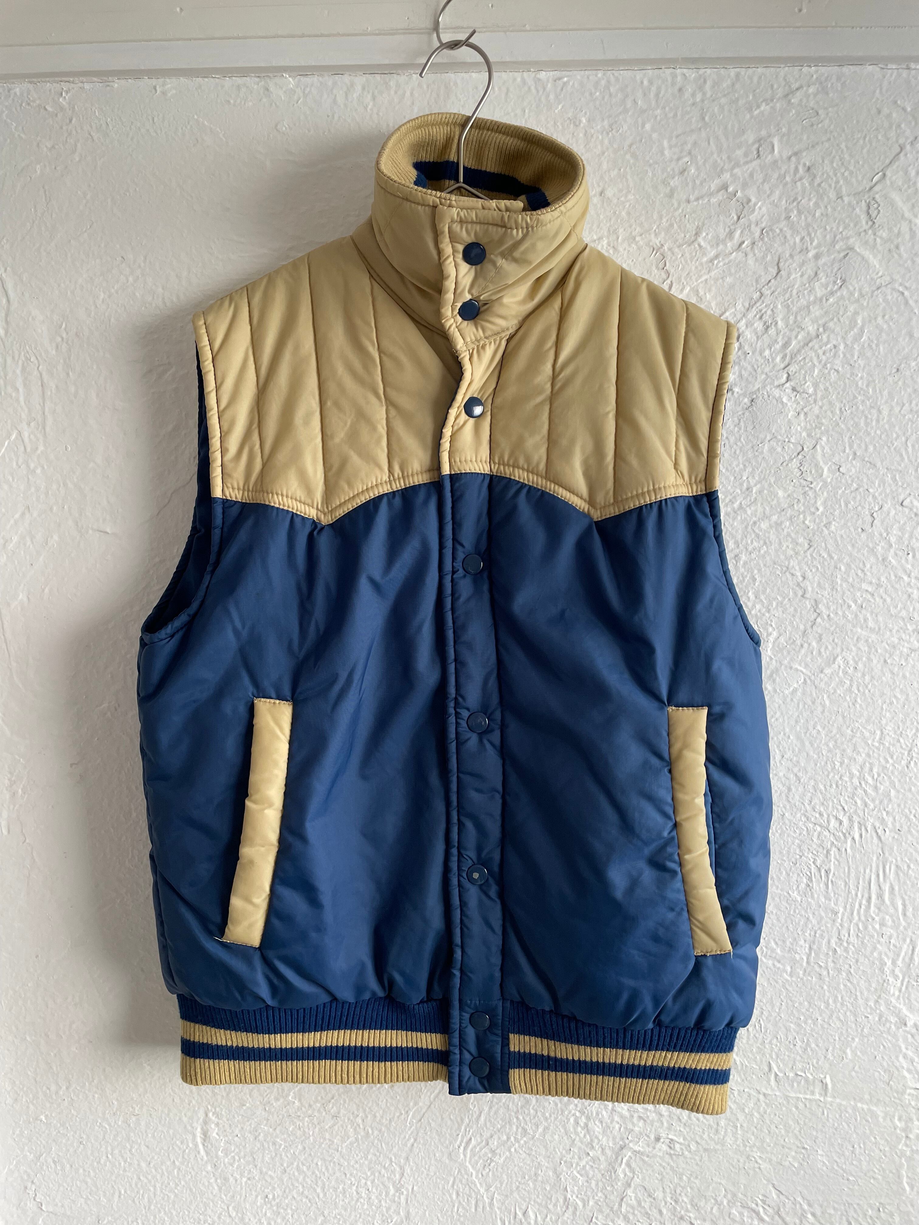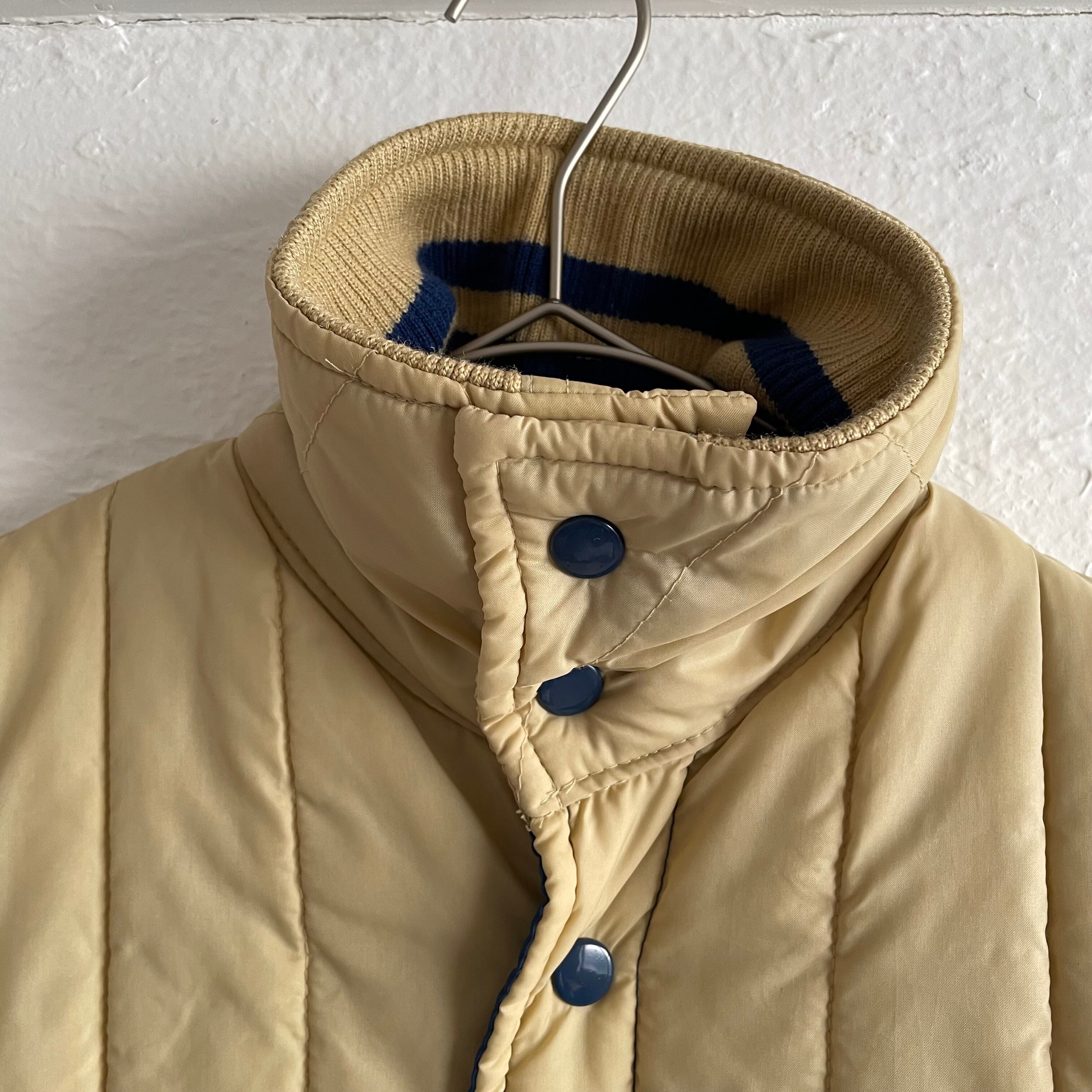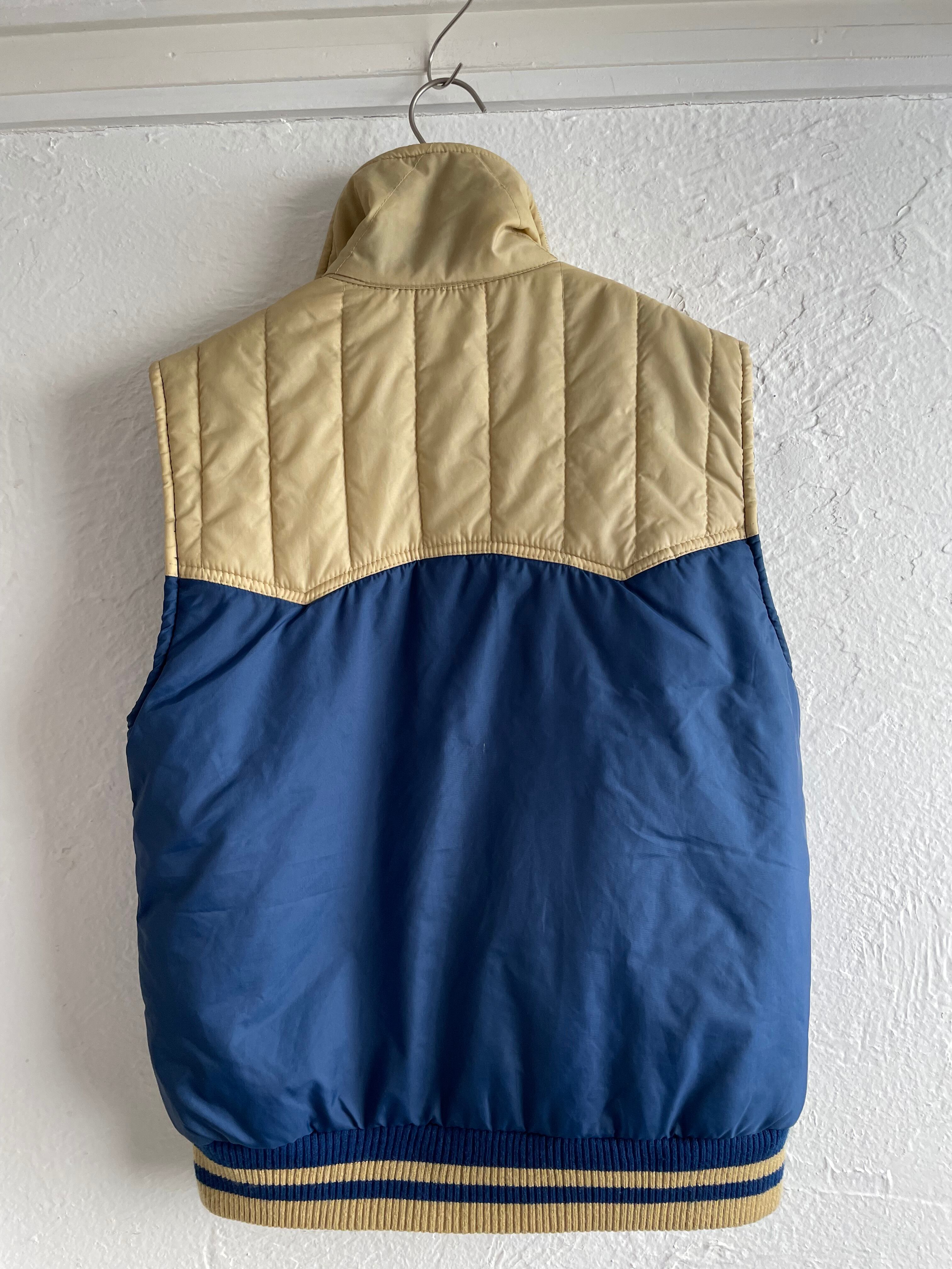 ベージュ×ブルーの配色が可愛いダウンベスト