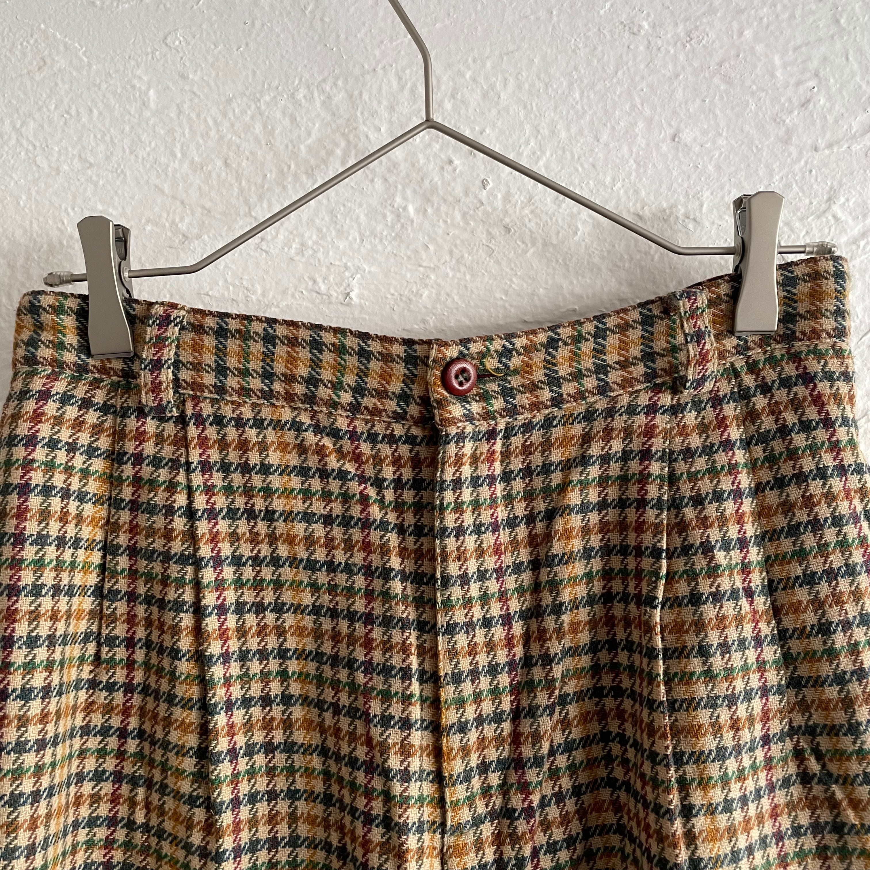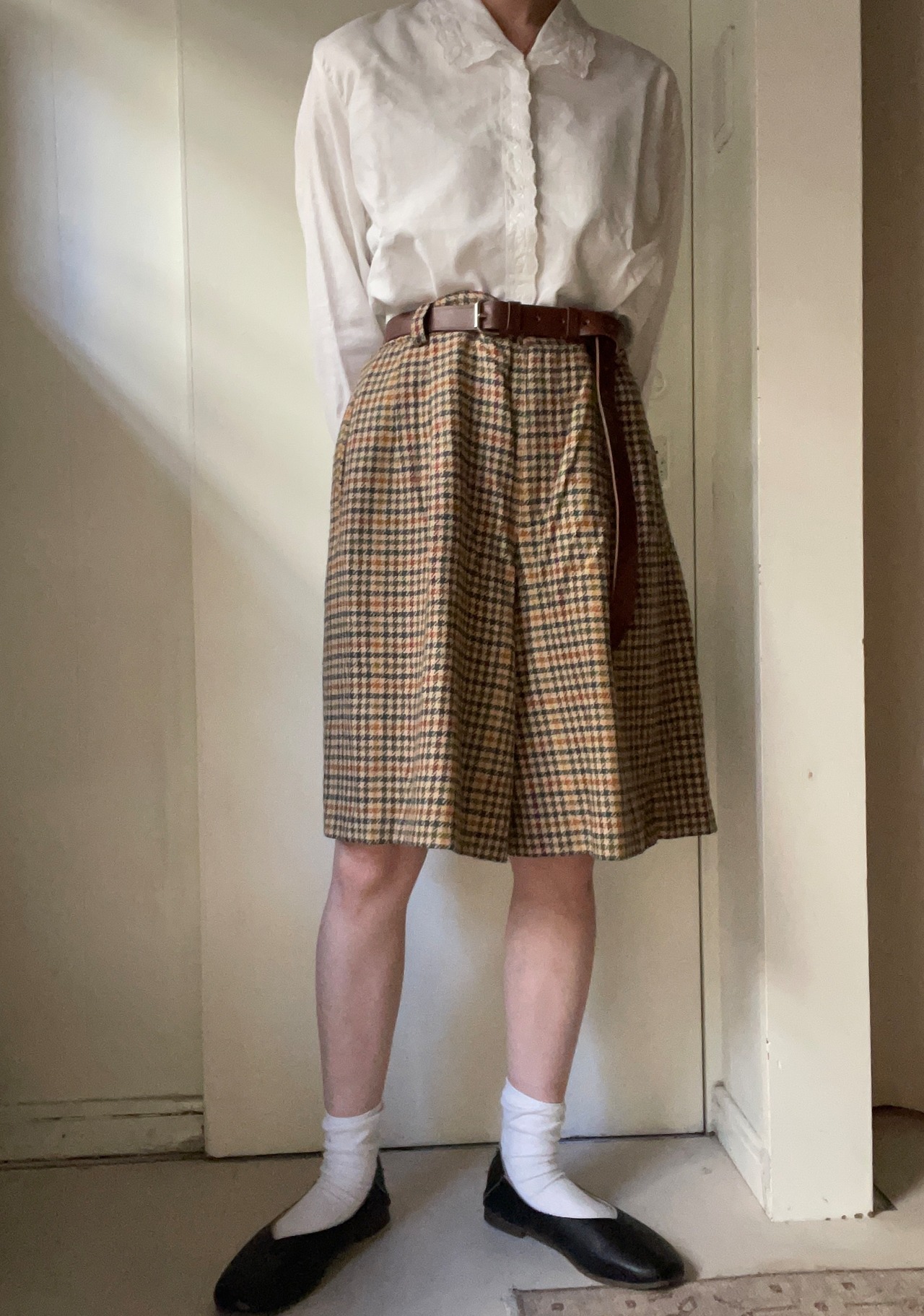 ベージュベースにブラウンやグリーンの千鳥格子柄のウールショートパンツ