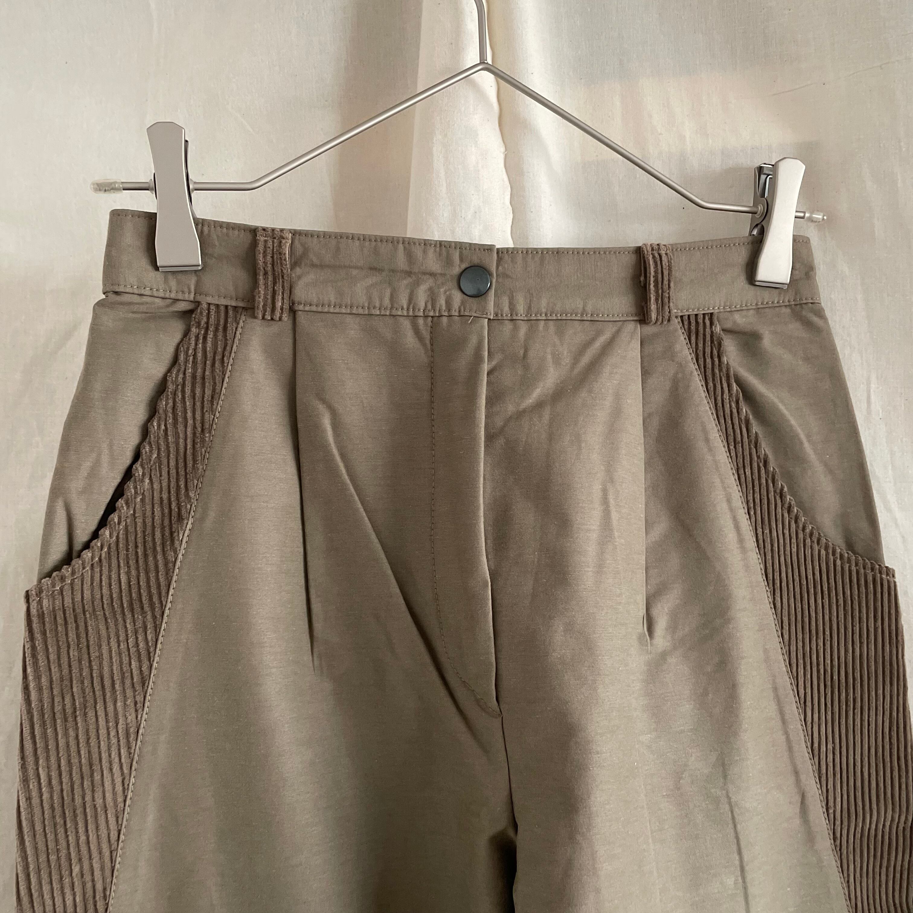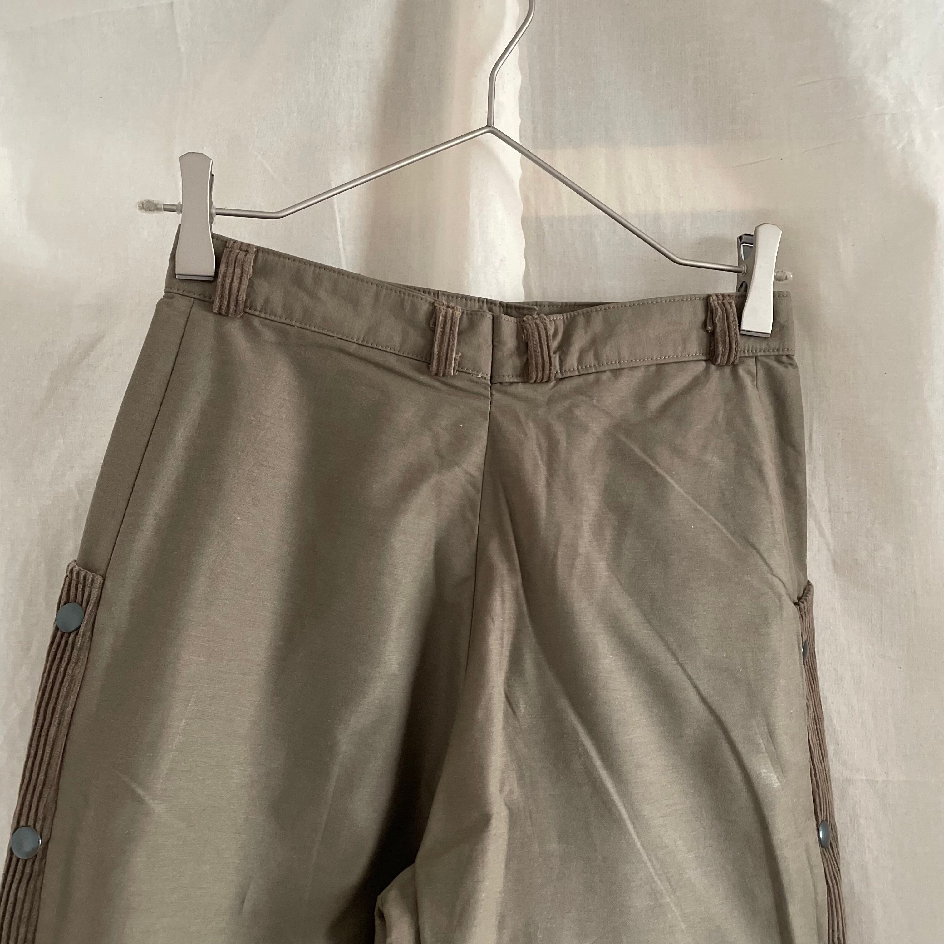 淡いオリーブ色とサイドのコーデュロイ生地とスナップがポイントのデザインパンツ
