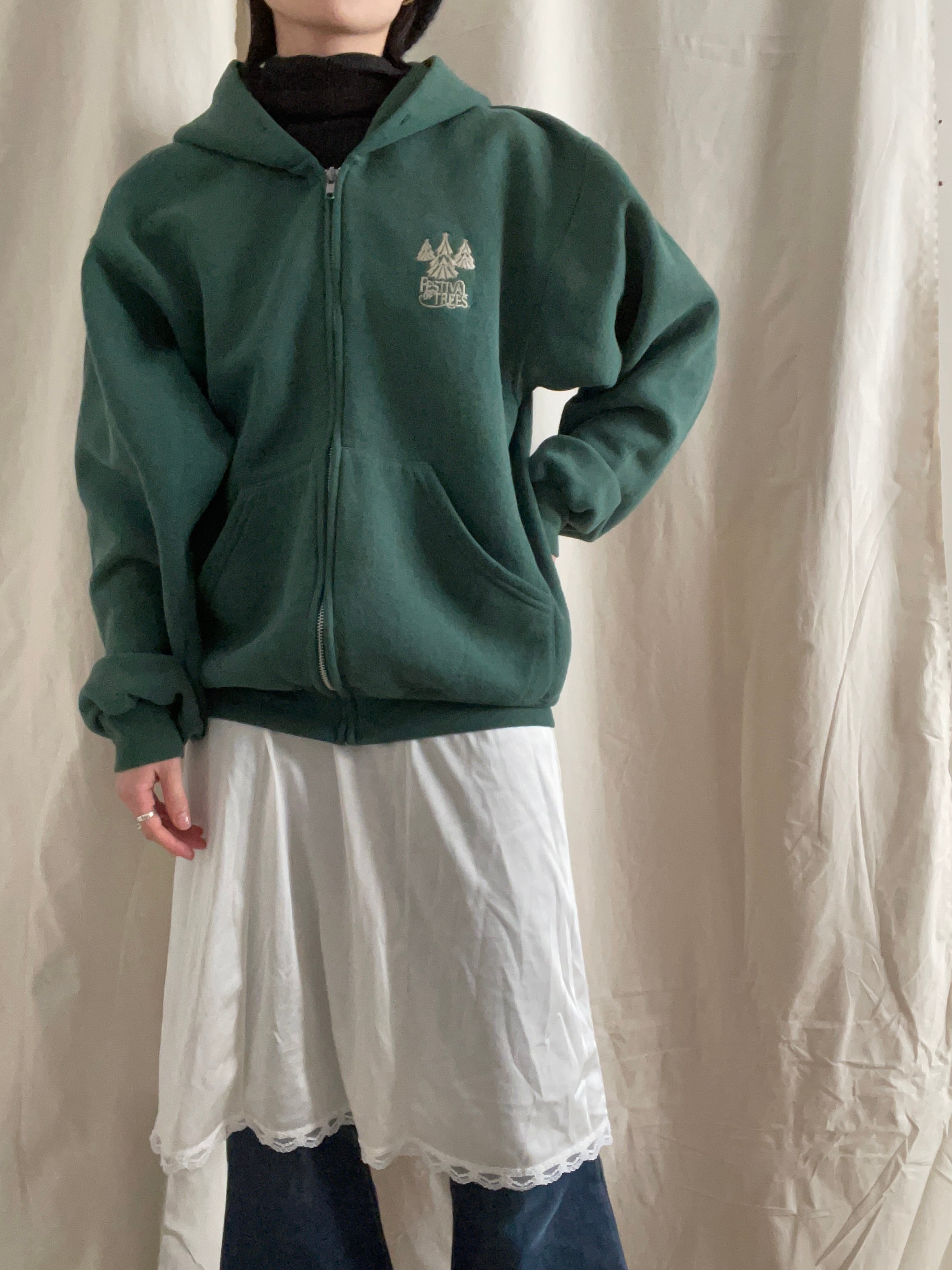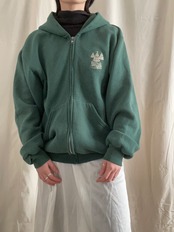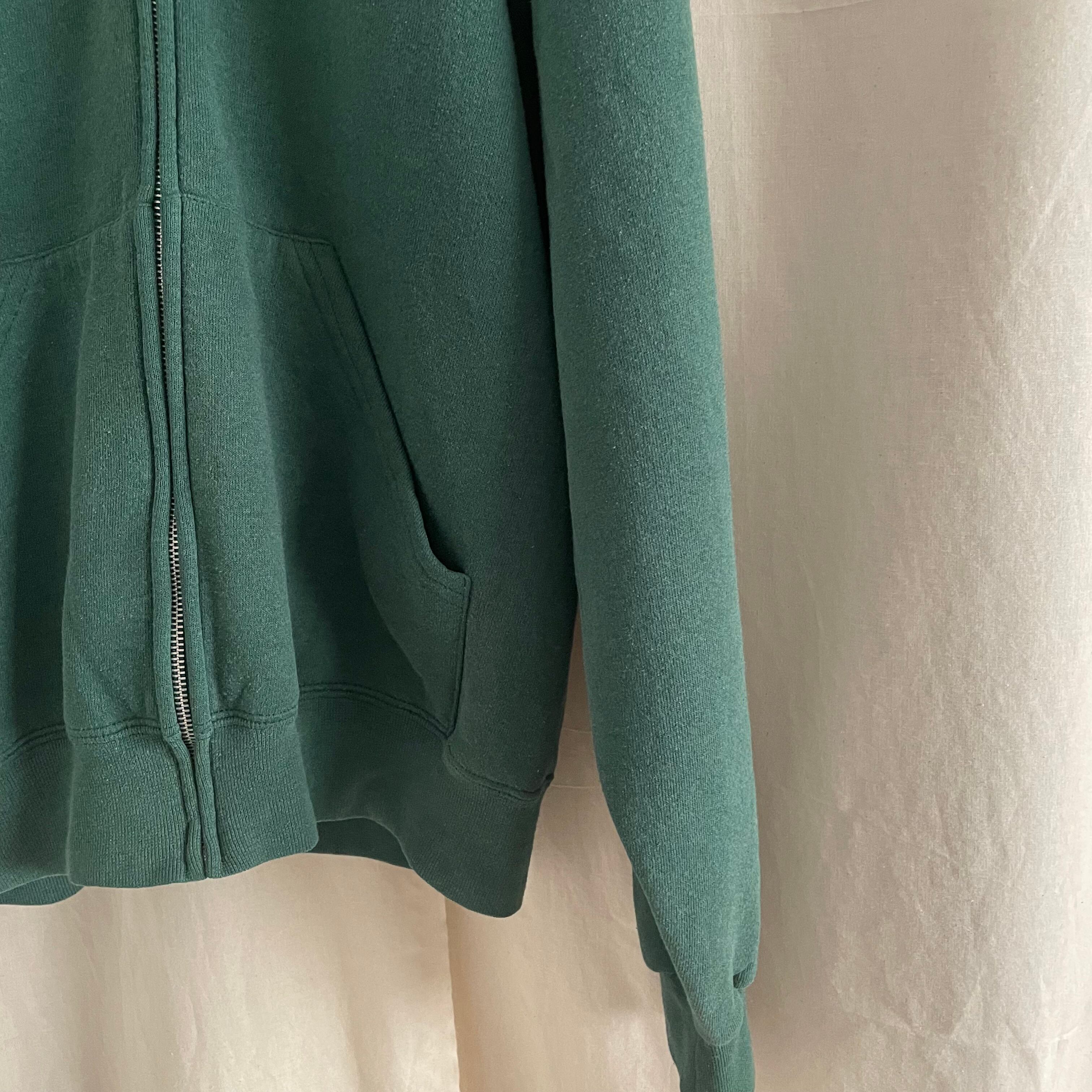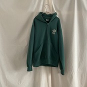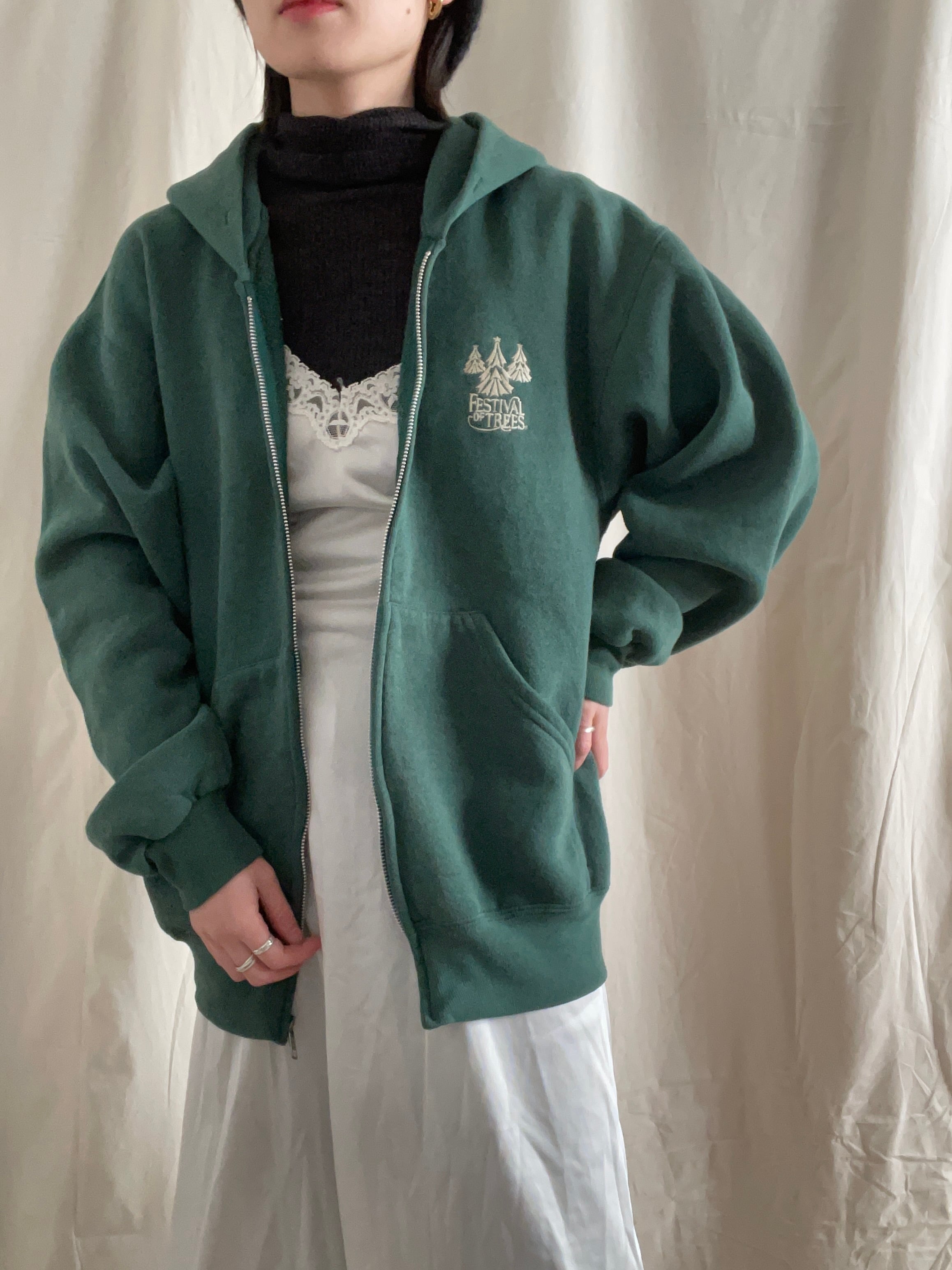 くすみがかったグリーンカラーと刺繍のワンポイントが可愛いフルジップパーカー