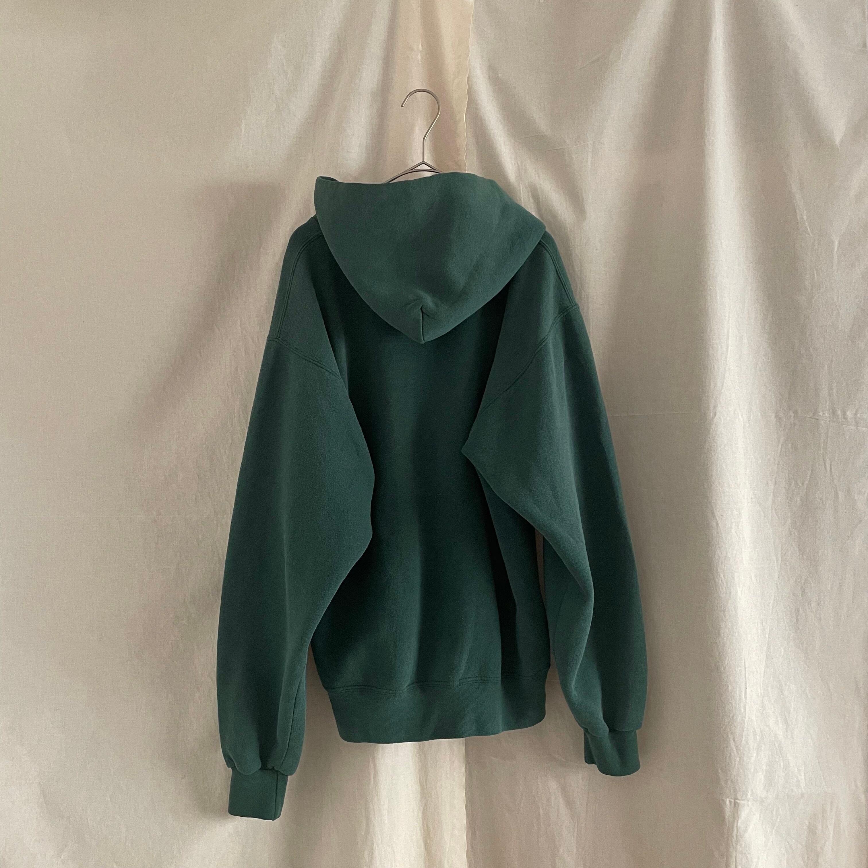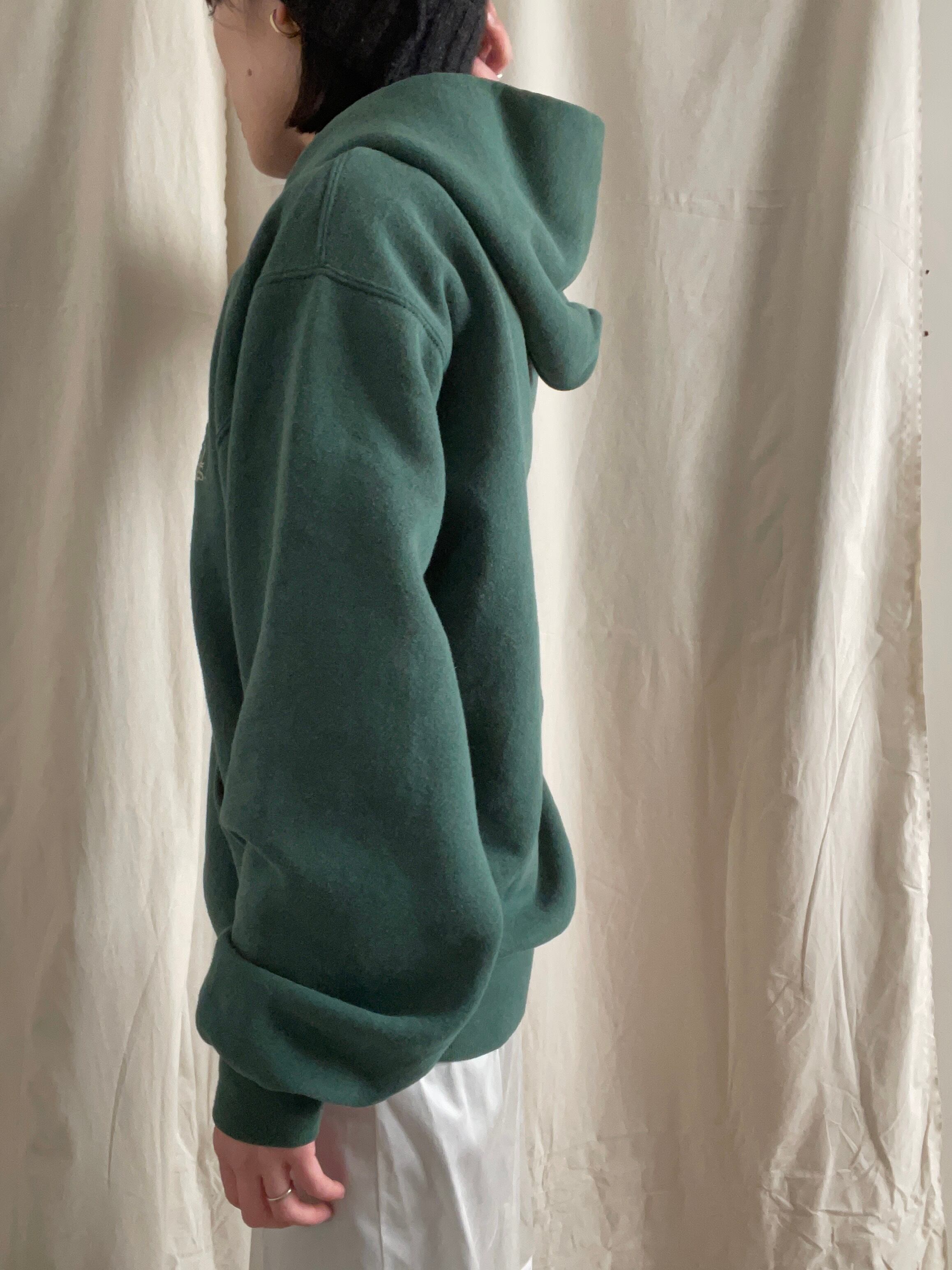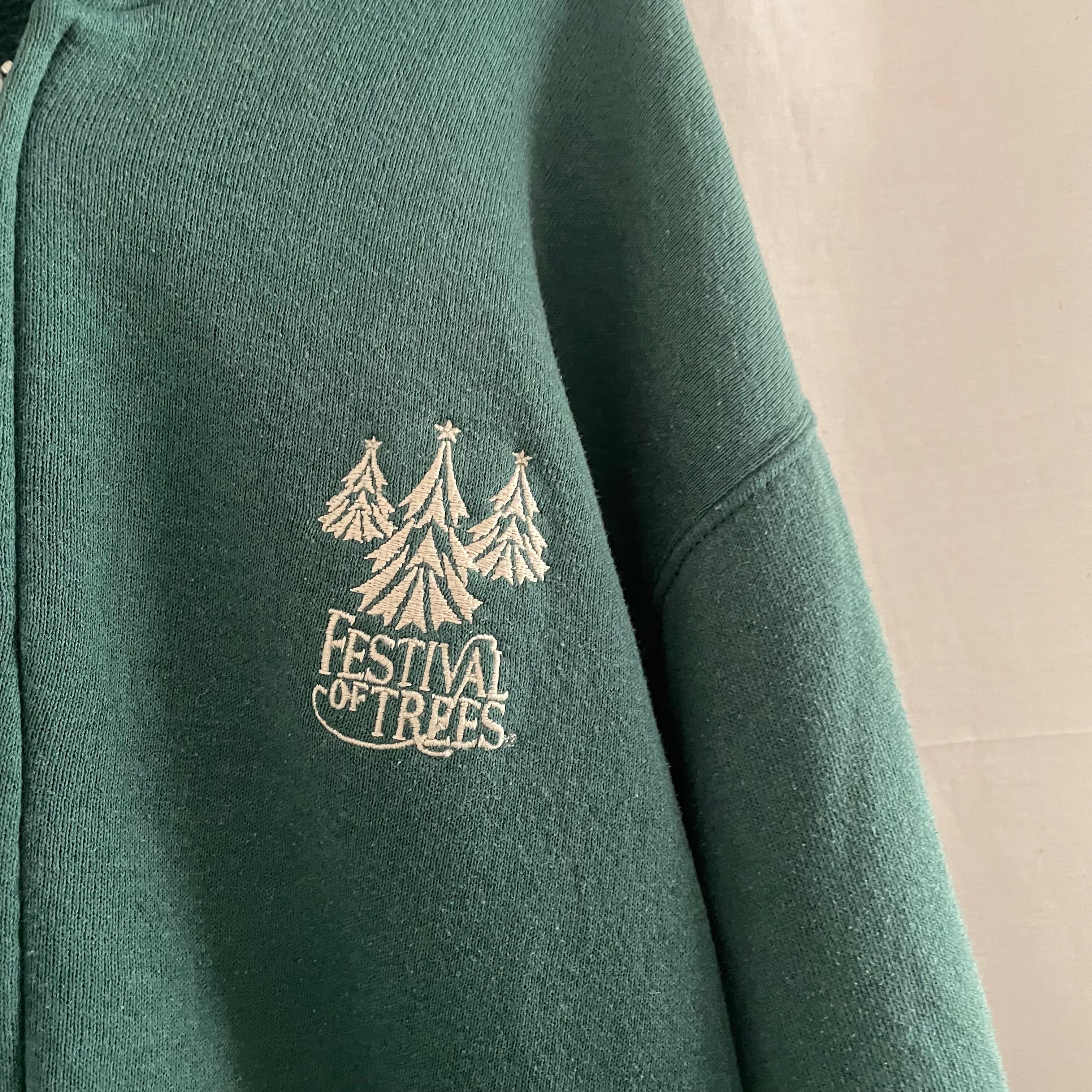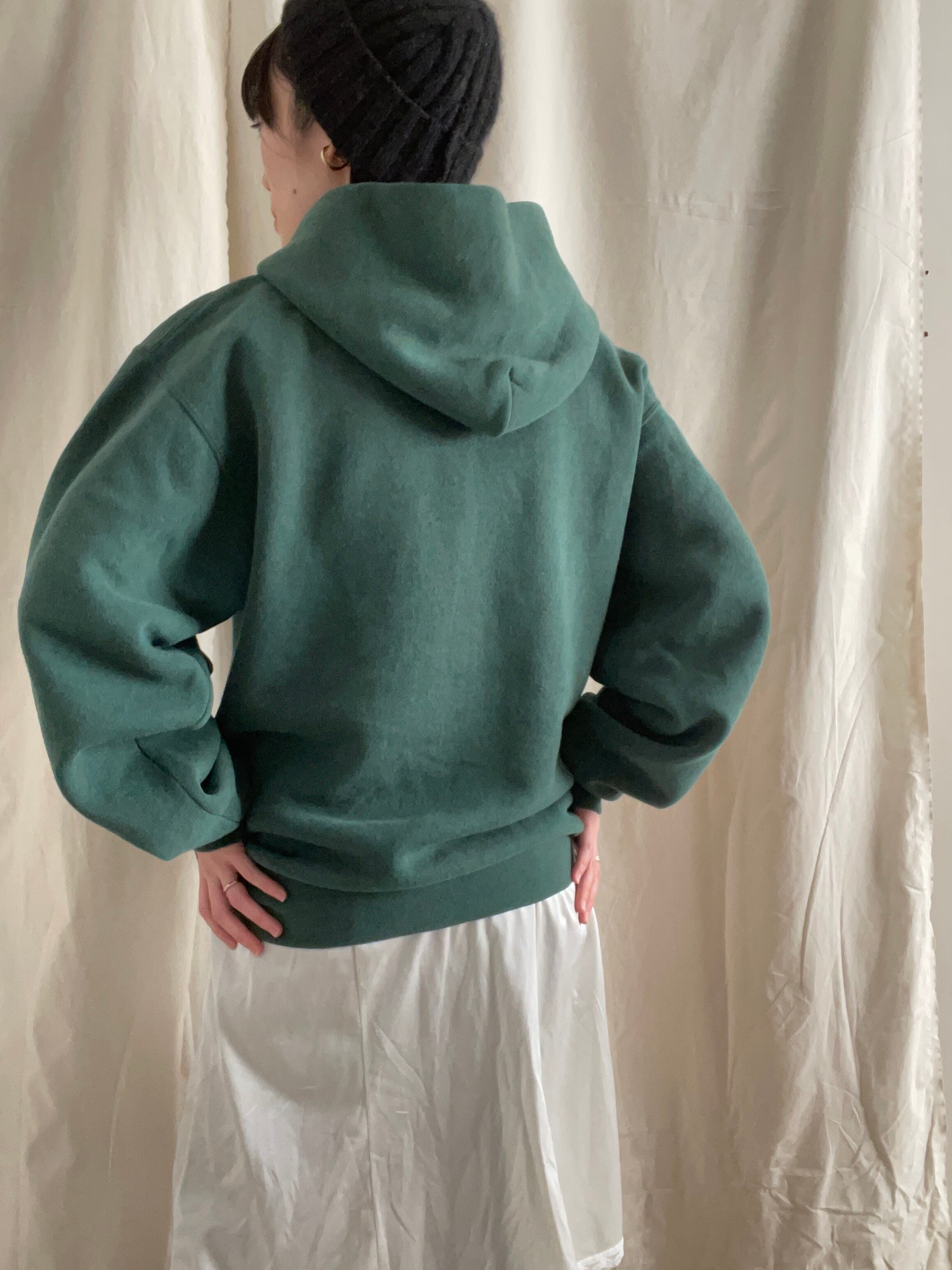 くすみがかったグリーンカラーと刺繍のワンポイントが可愛いフルジップパーカー