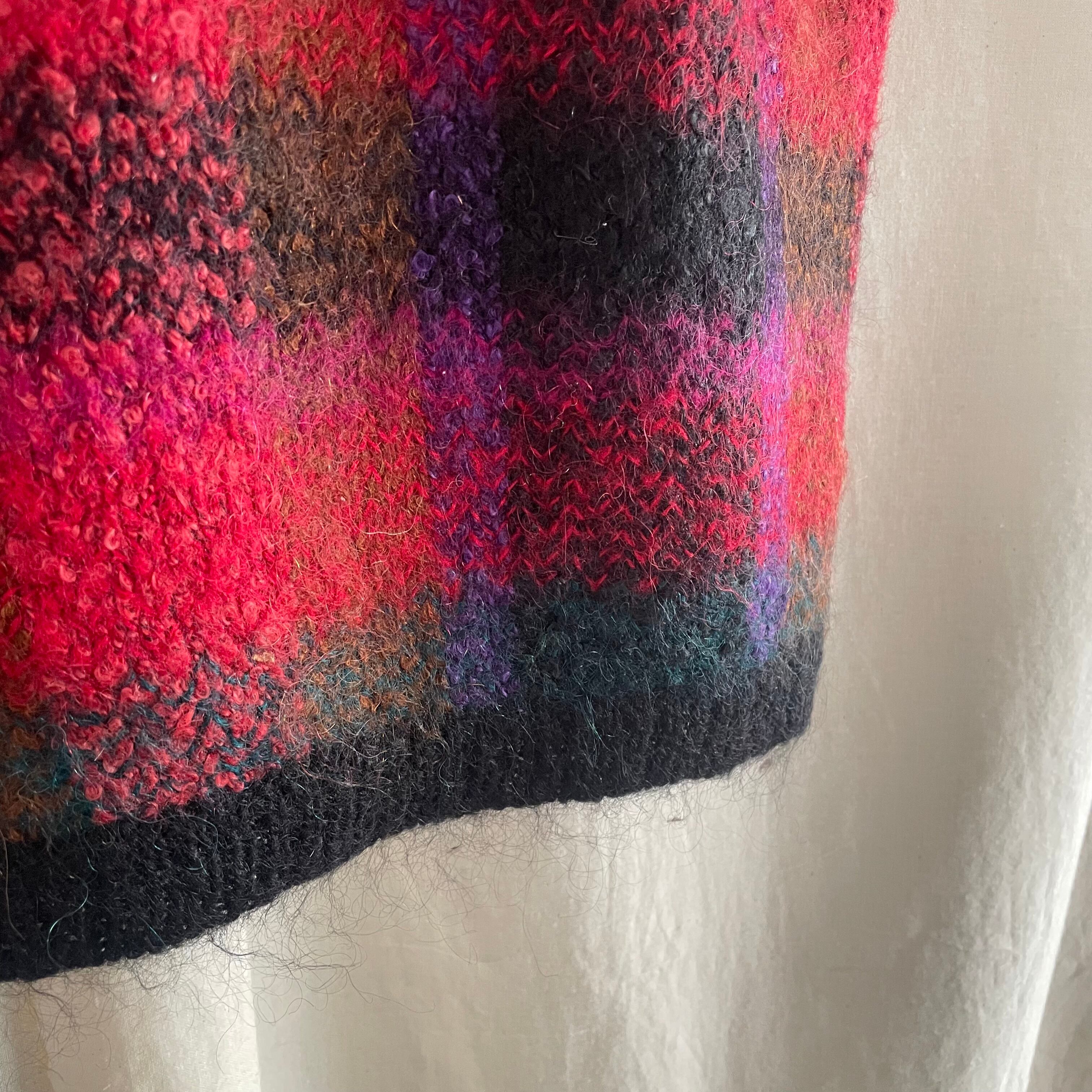 ビビットなカラーのシャドーチェックにブラックの縁どりがまとまりのあるモヘアベスト