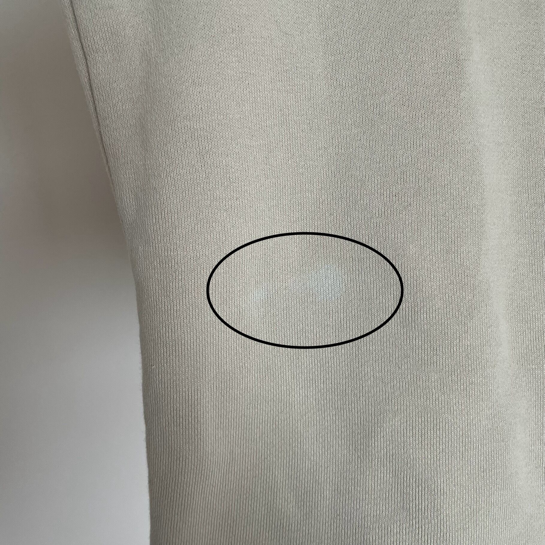 少しグレーがかったホワイトカラーに、裏起毛の軽い生地、後ろに調節用のタブ付き