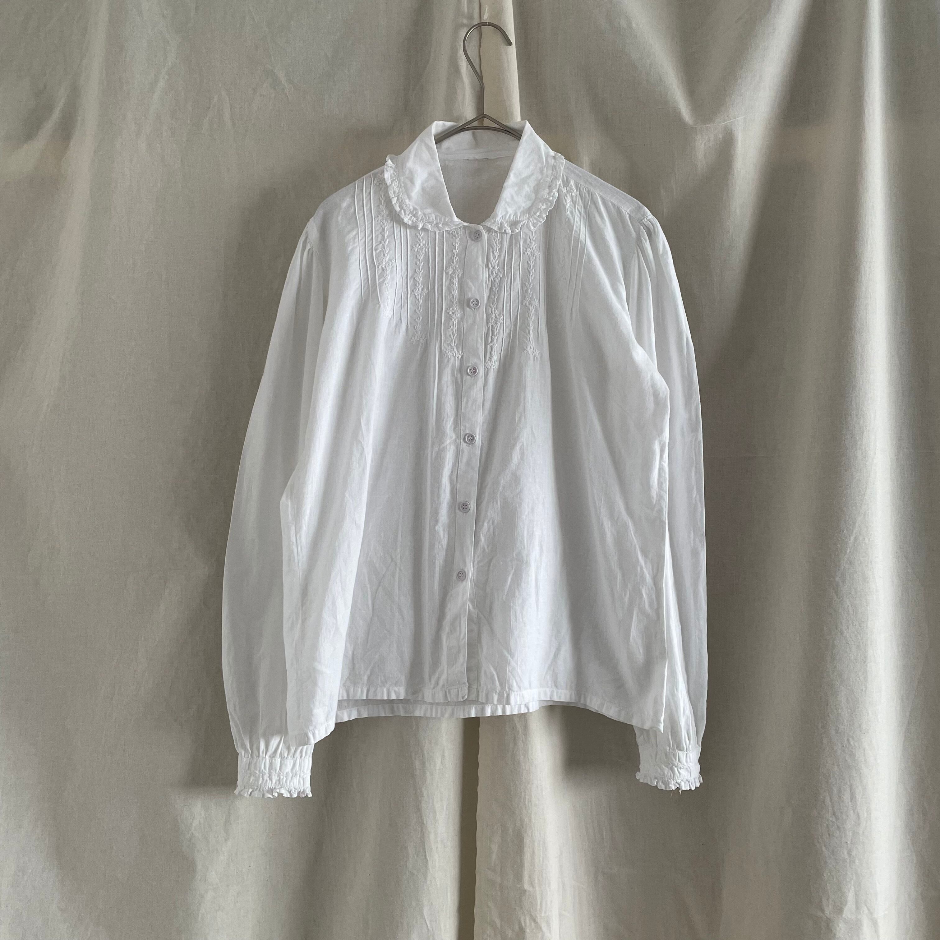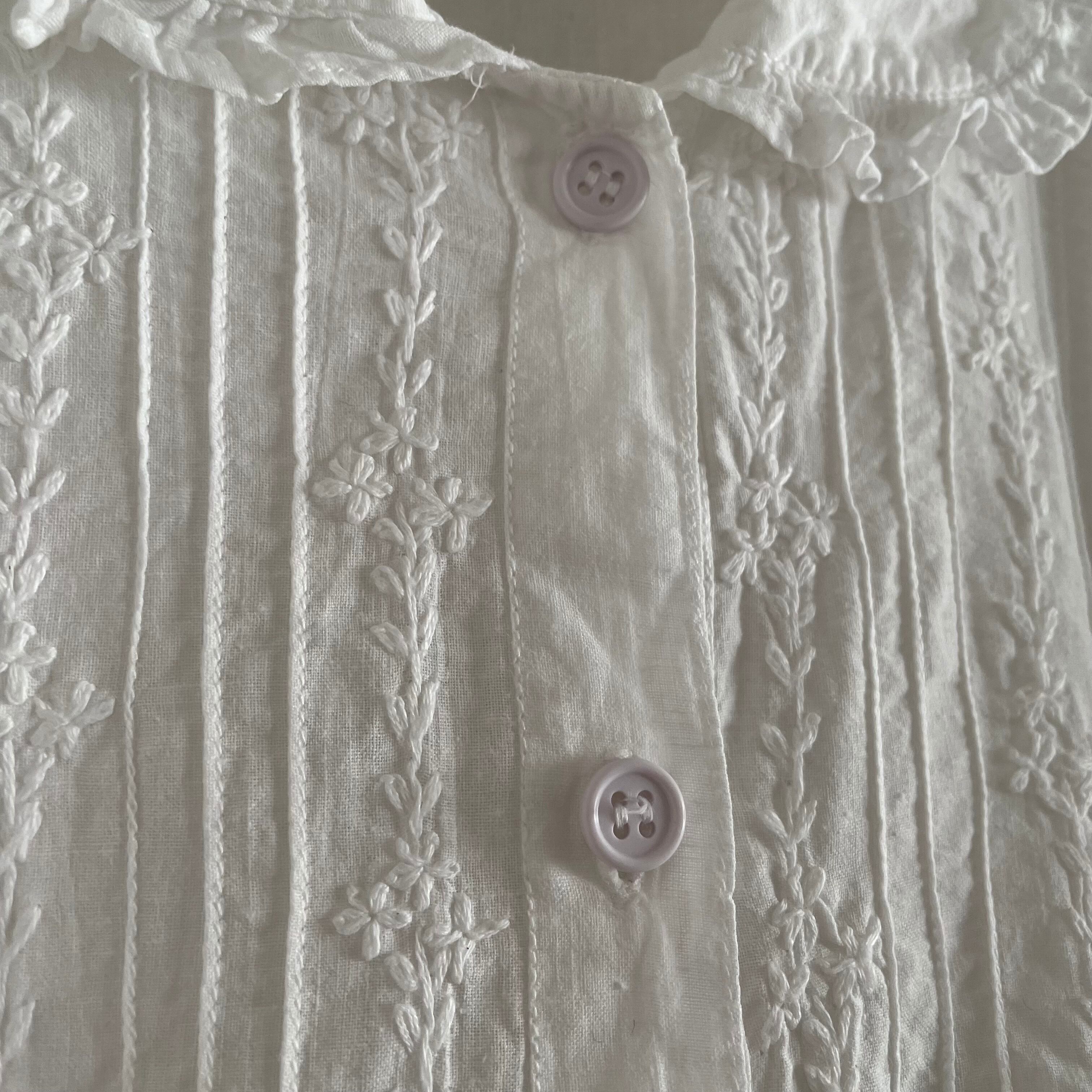 襟や袖口のさり気ないフリルや、柔らかな雰囲気の刺繍が可愛い1枚です