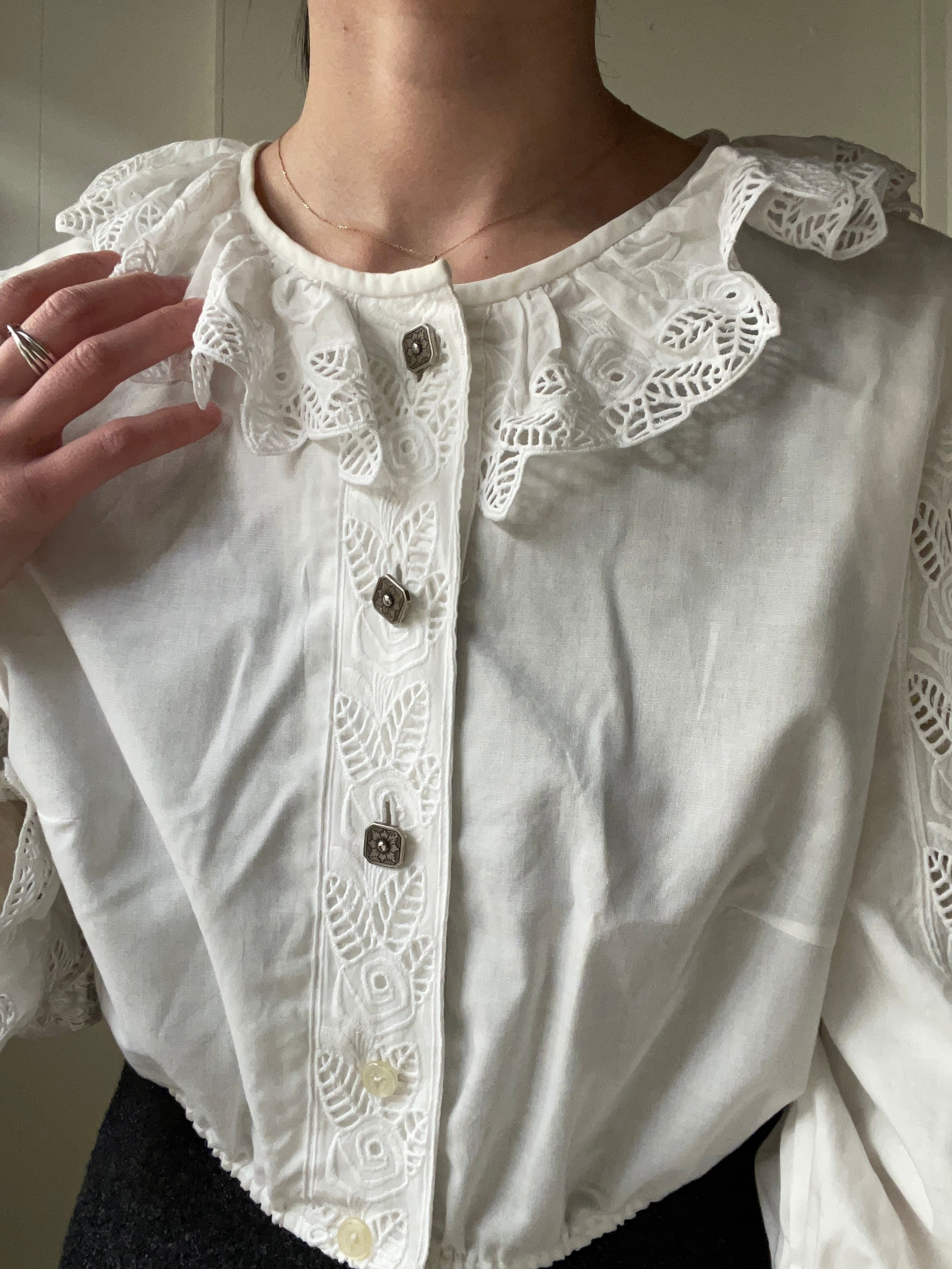 上の3つがシルバーボタンなところや、全体のレースはよく見るのバラのような柄になっていたりさり気ないポイントが可愛い1枚です